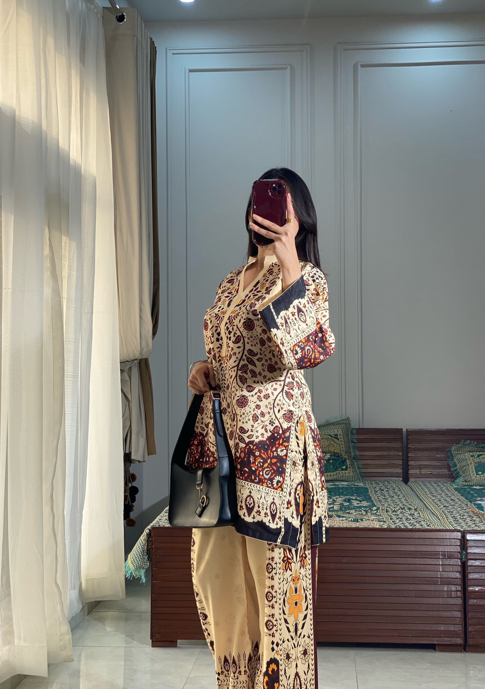 The Sheela 2 Pc Co-Ord Suit is crafted in premium slub lawn with a contemporary print over a warm beige base. The earthy tones add a cozy elegance, making it an effortless choice for day-to-day wear in the Australian climate. Designed for comfort and style, this set creates a look that feels both grounded and chic.