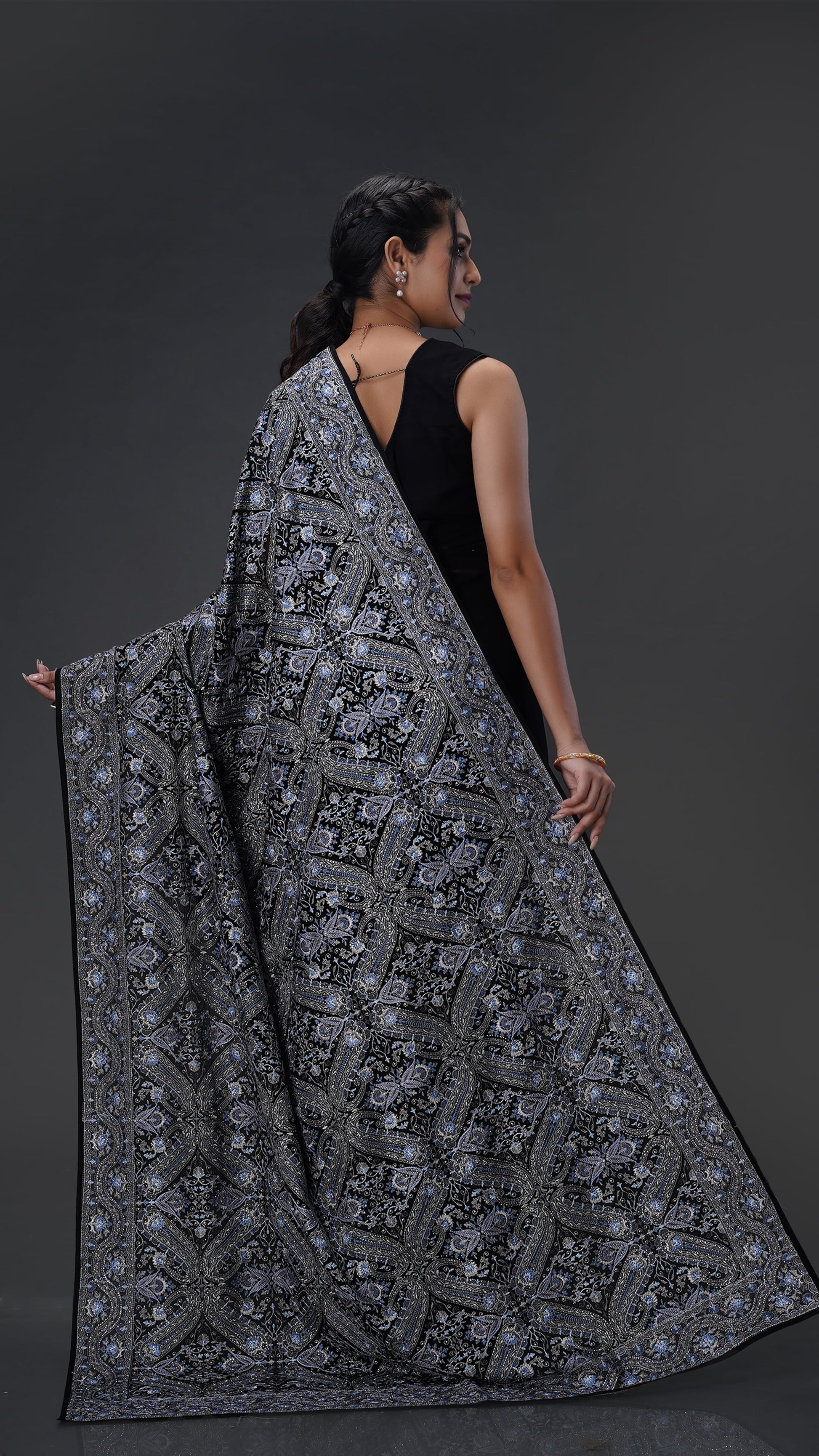 Expertly crafted from luxurious Georgette fabric, our Elegant Black Saree is the epitome of class and sophistication. Adorned with sparkling stones and resham work, it exudes a timeless elegance that will make you stand out at any special occasion. Must-have for any fashion-forward wardrobe.