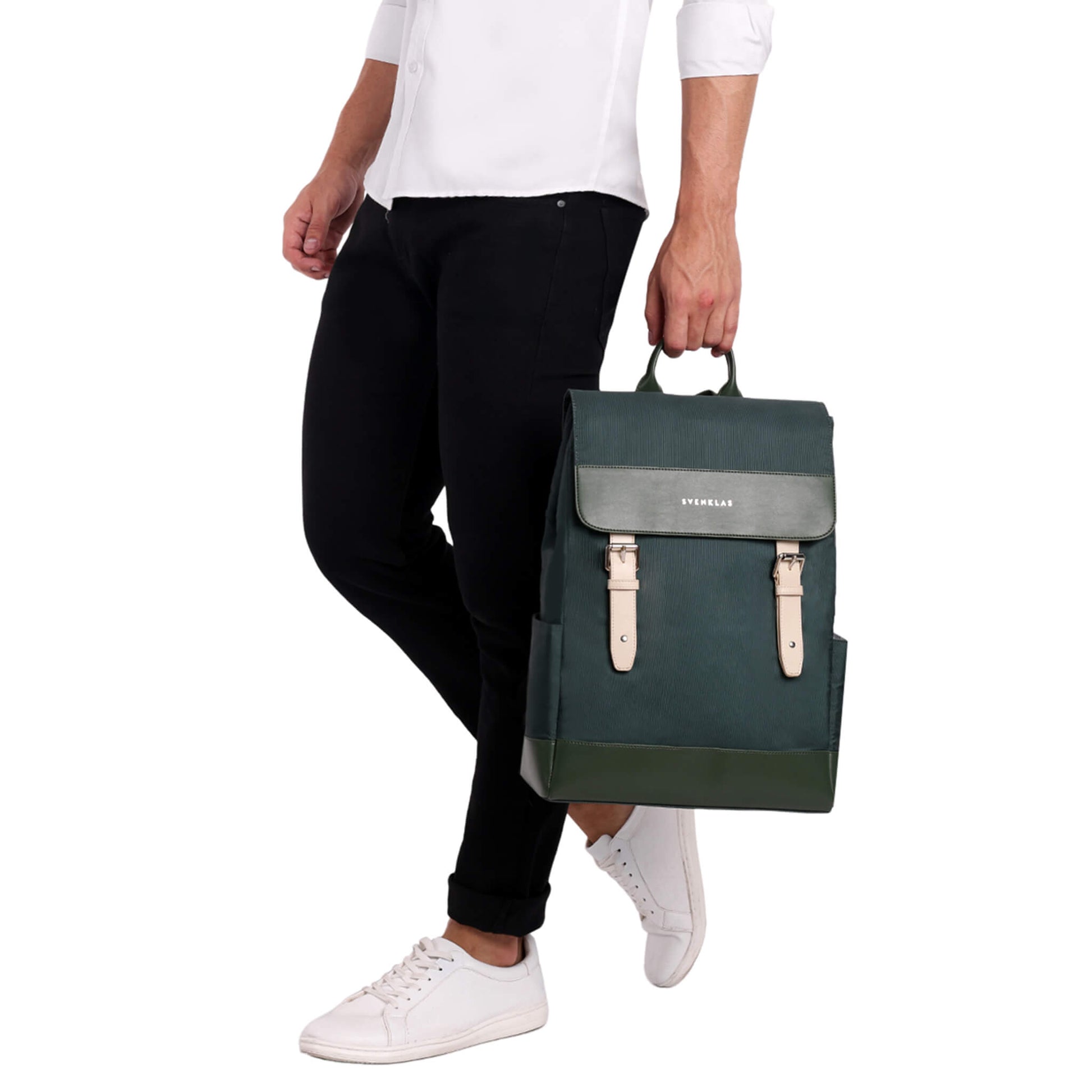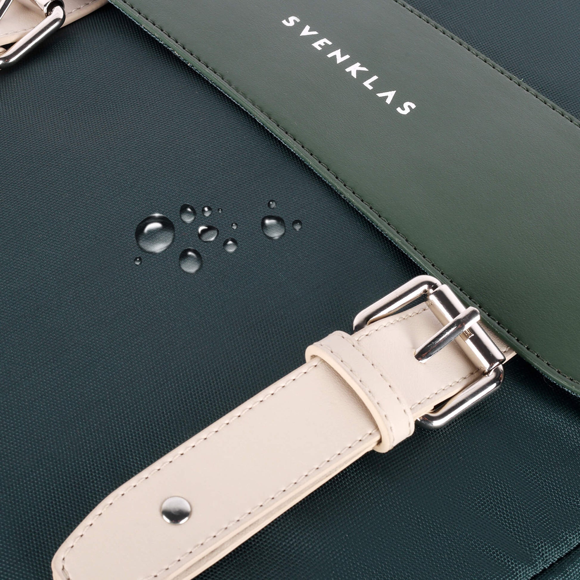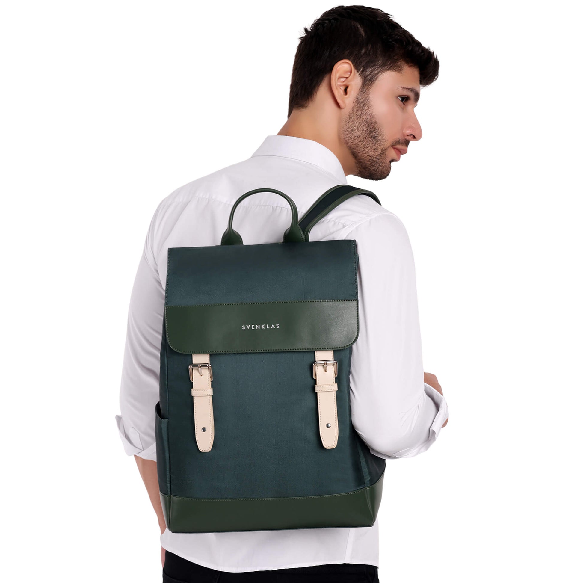 Leather detailing is used in the carry handle, flap tie, base, shoulder strap ends, trims, under the flap pocket, keychain holder, velcro closure, and inner binding.