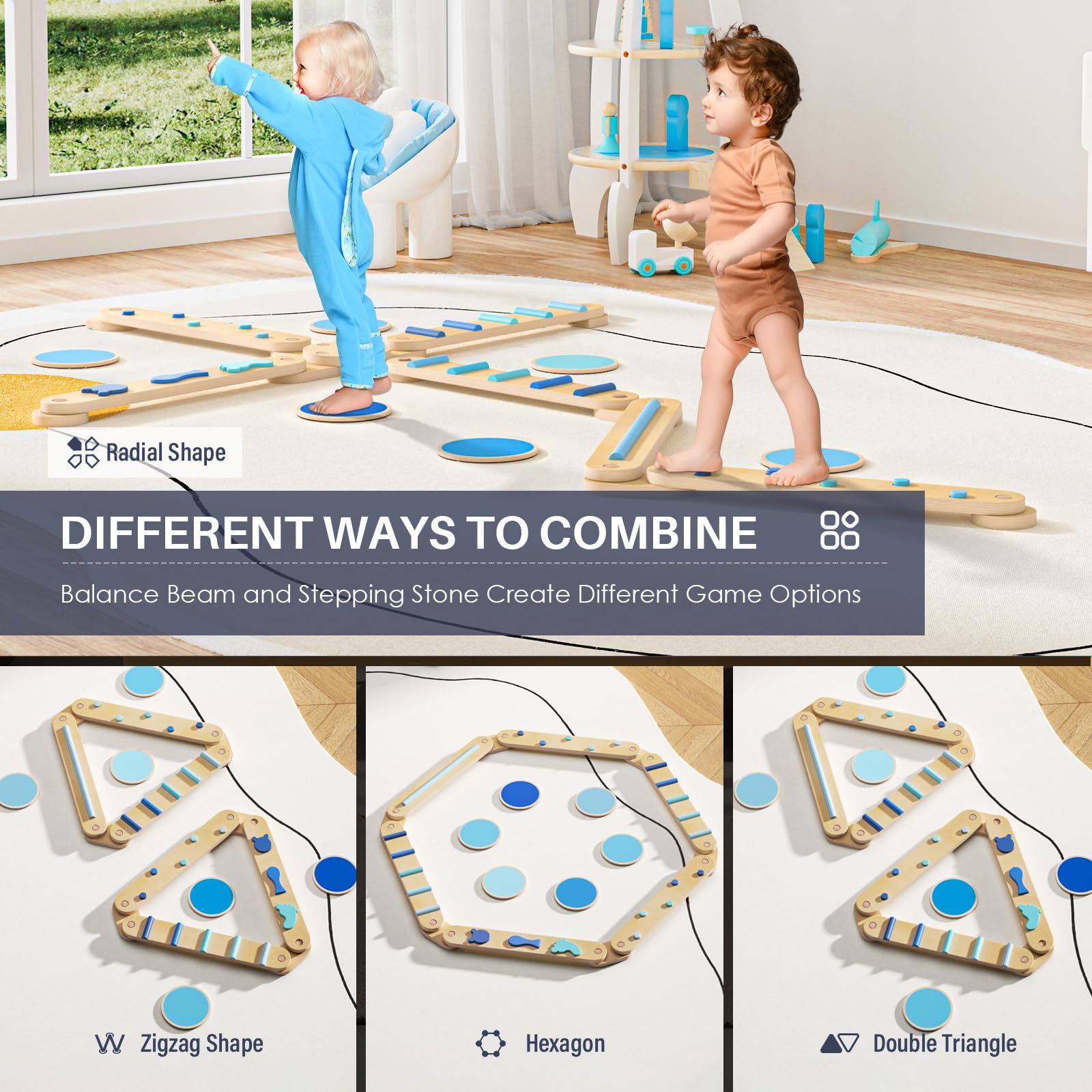 Versatile Double-Sided Design: The set includes six balance beams, each featuring a double-sided design that offers various permutations and combinations. One side is smooth, while the other side is vibrant with raised modules, providing more tactile stimulation and balancing challenges. This versatility ensures an engaging and beneficial playtime.