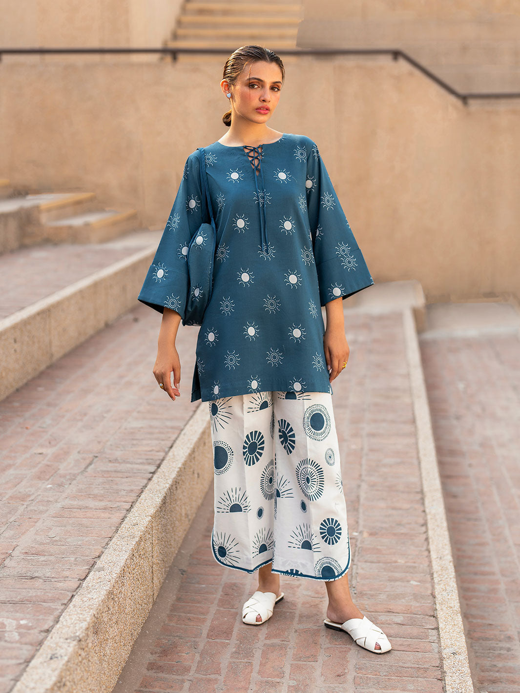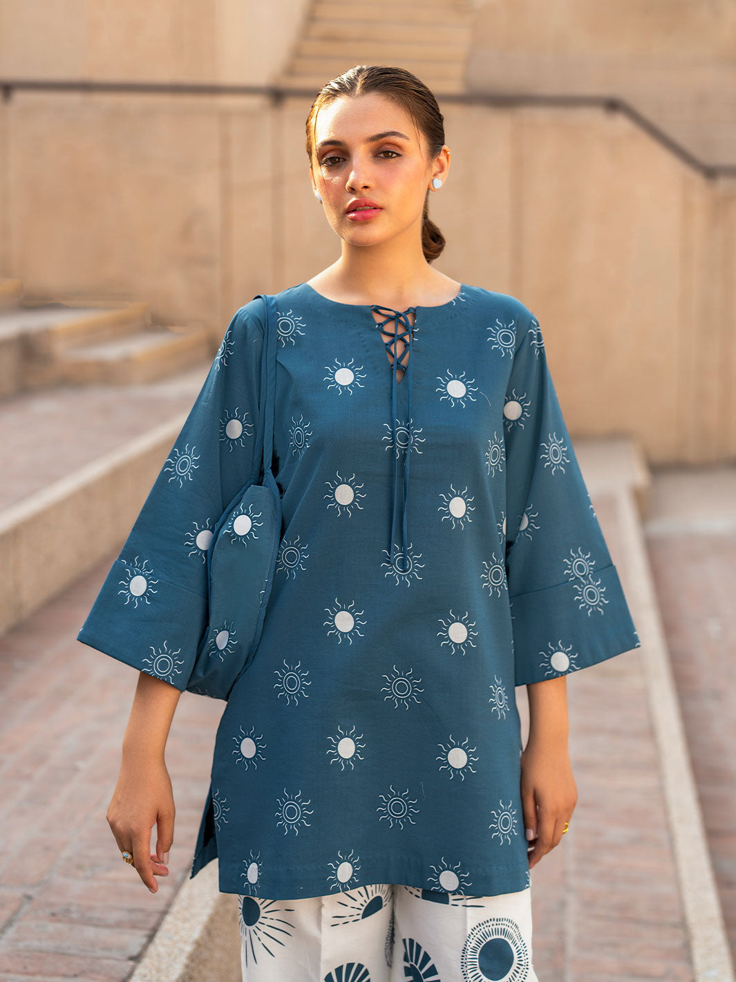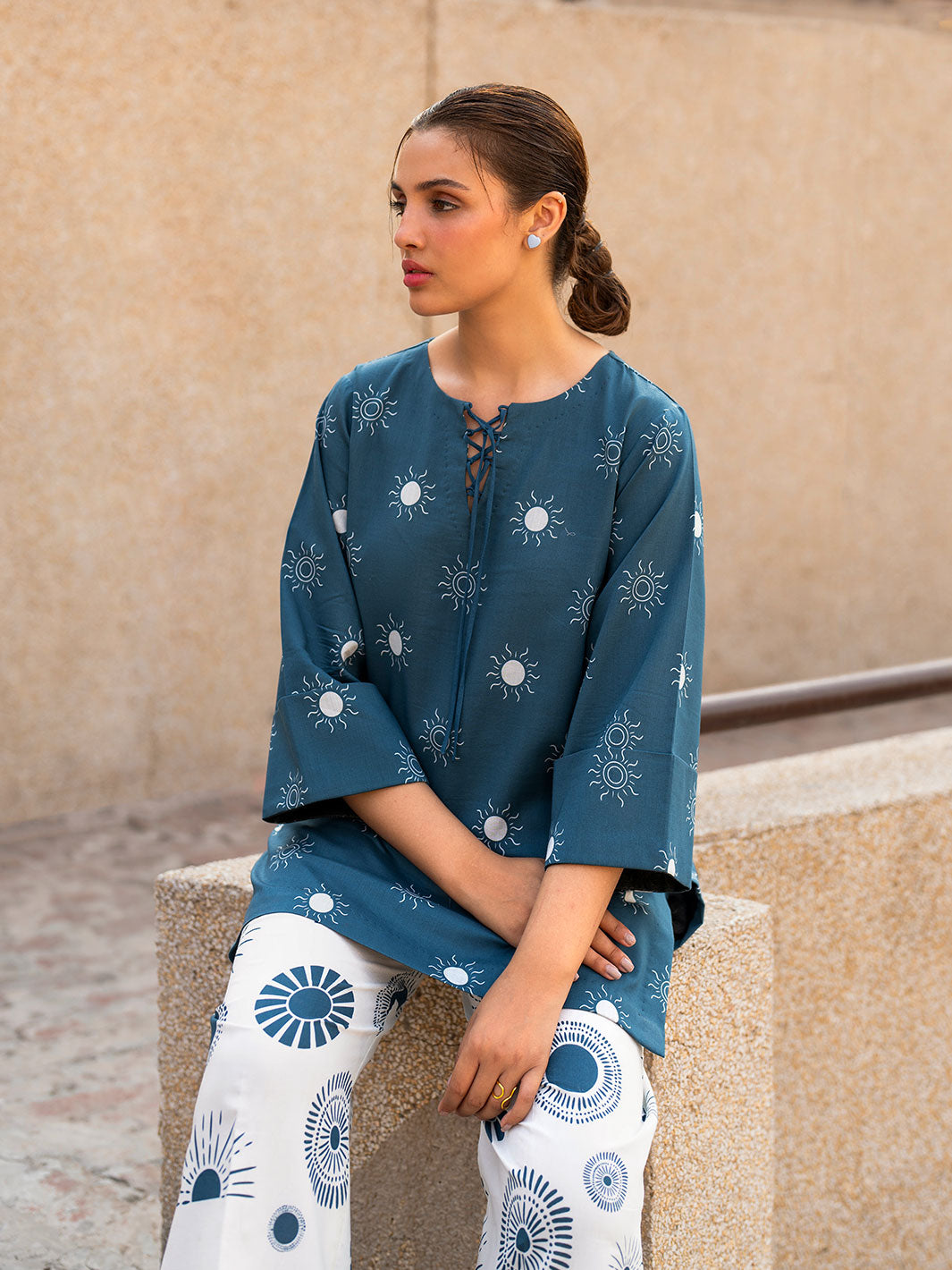 The Aura co-ord set features a loose-fit tunic top with a crisscross neckline and bell sleeves, paired with wide-leg trousers, offering a contemporary and relaxed look.