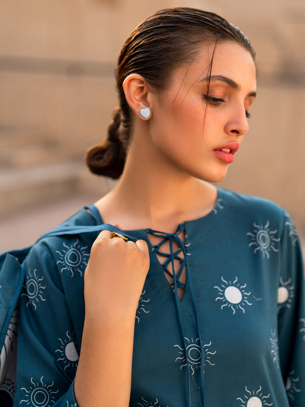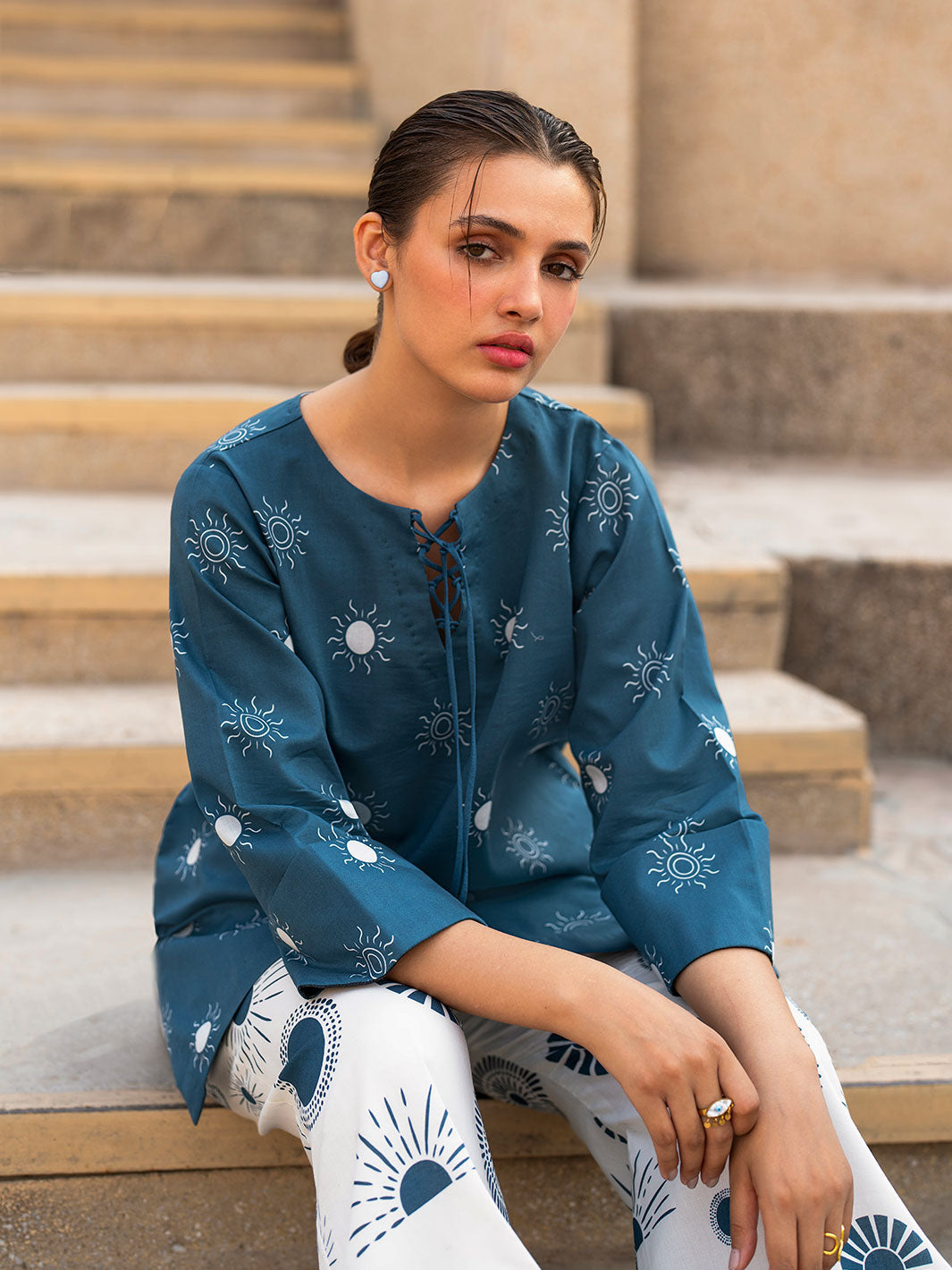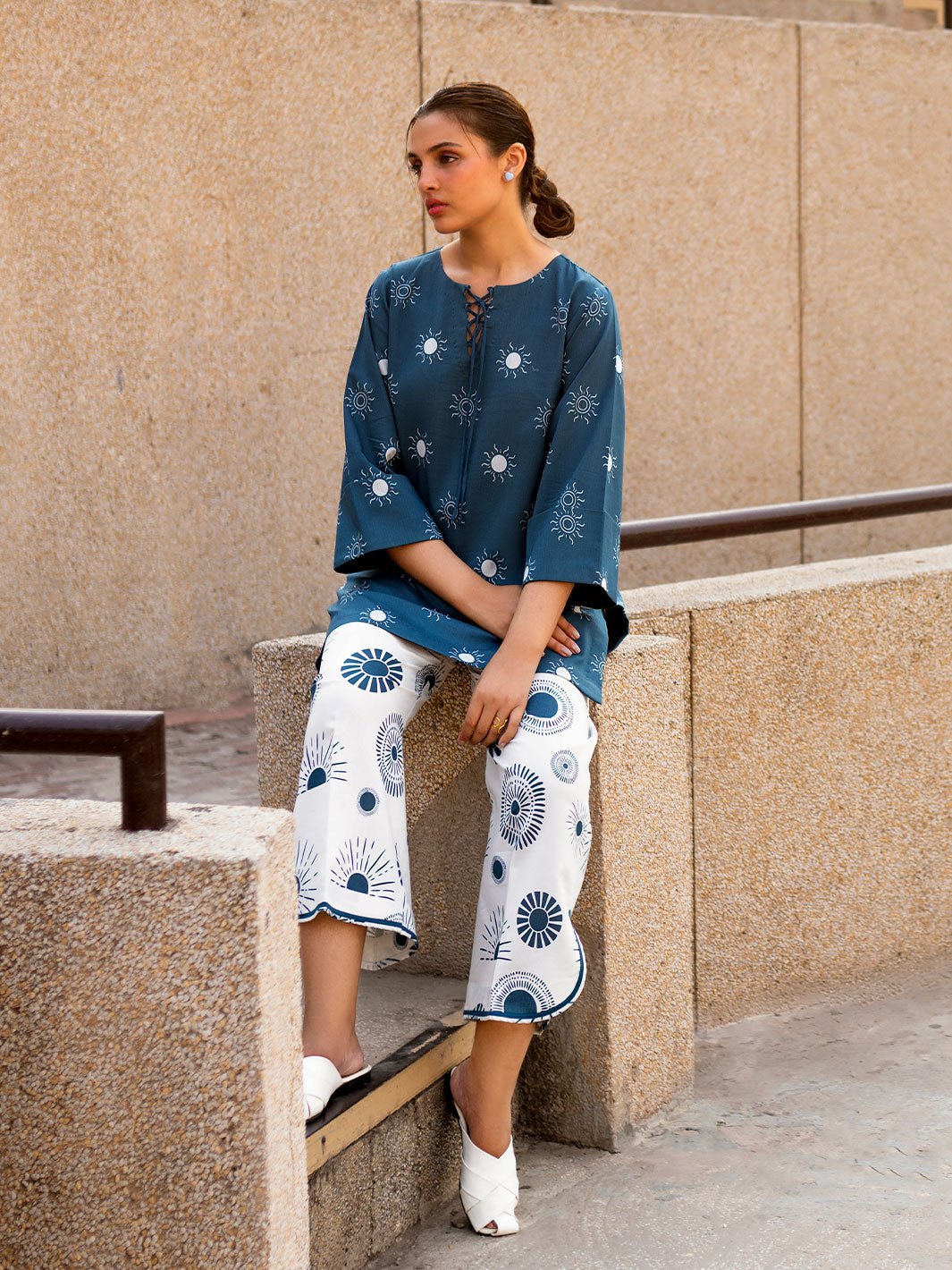 The Aura co-ord set features a loose-fit tunic top with a crisscross neckline and bell sleeves, paired with wide-leg trousers, offering a contemporary and relaxed look.