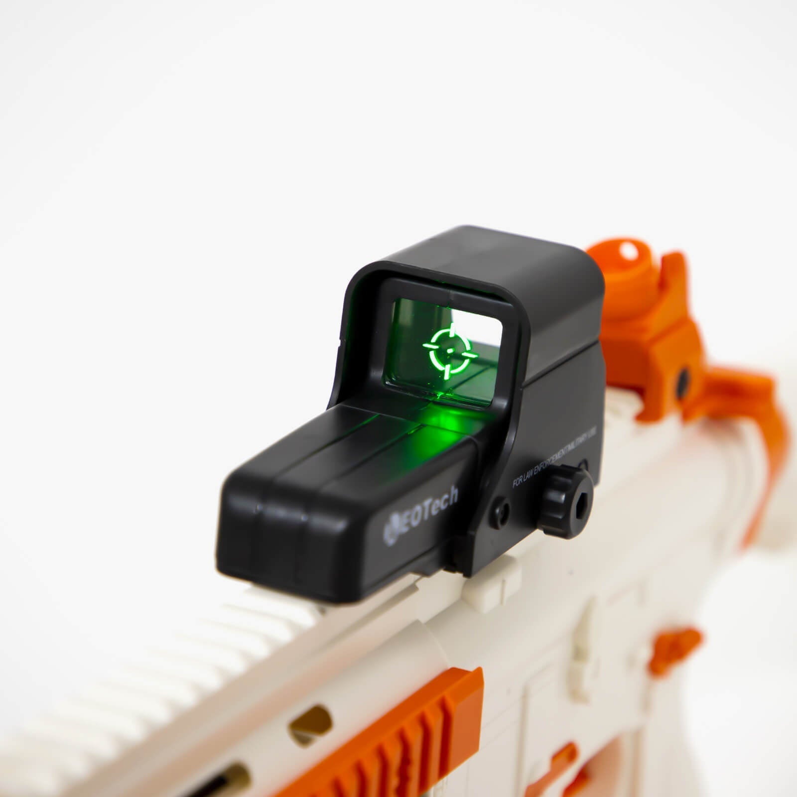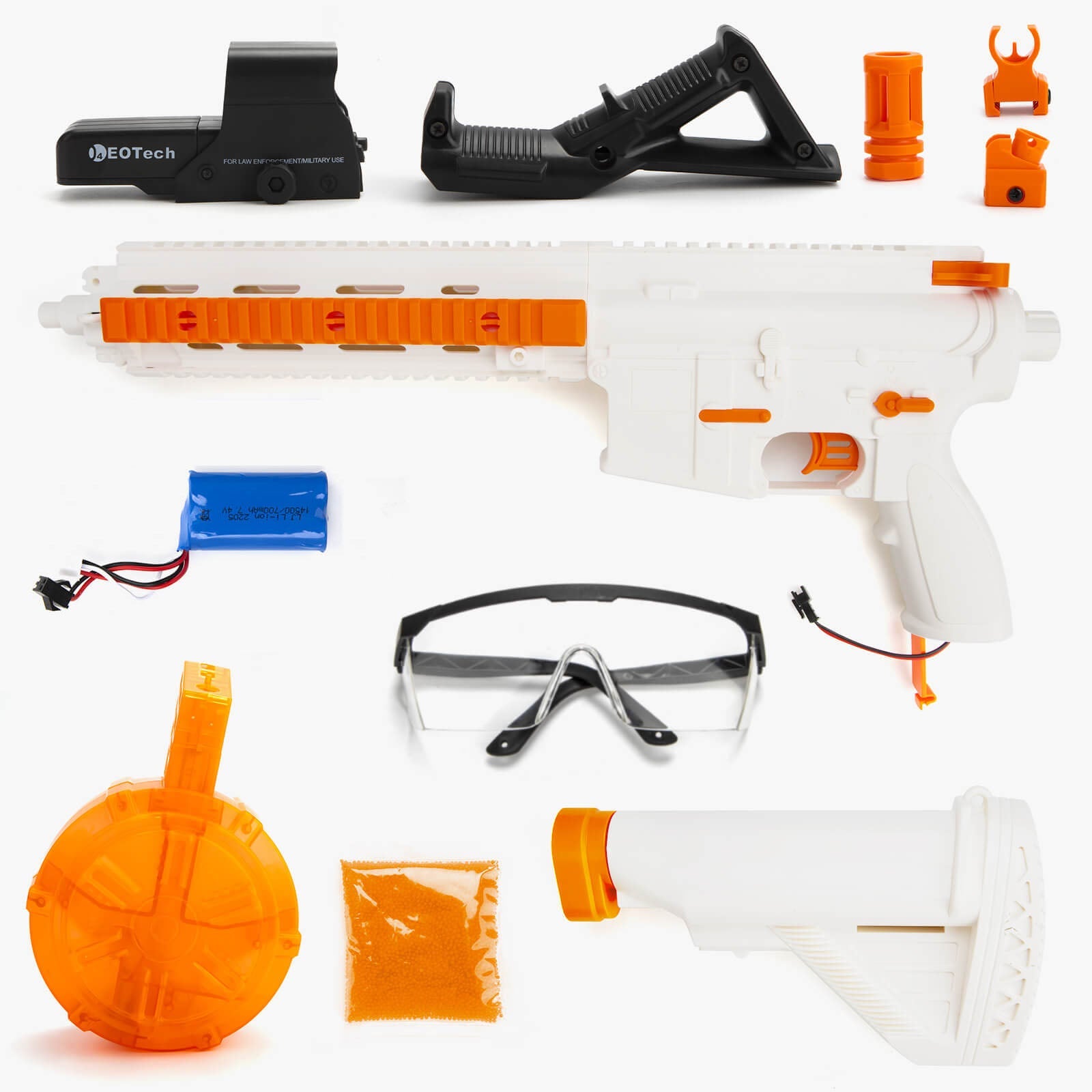 The shape of this gel blaster is inspired by the M4, but in a more cheerful manner. Its main tones are orange and white, and the orange and white design creates a lively and playful atmosphere, ideal for a casual beach shooting confrontation. The 28.9-inch-long game is made of high-quality ABS plastic and includes an optical sight that displays a green fluorescent aiming cursor when you start it, increasing launch accuracy. It comes with an orange enlarged magazine that can load more than 1500 gel balls at a time, which is 2.5 times the capacity of standard gel blaster magazines, allowing you to save loading time during a tense shooting game.