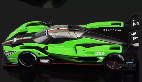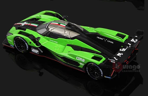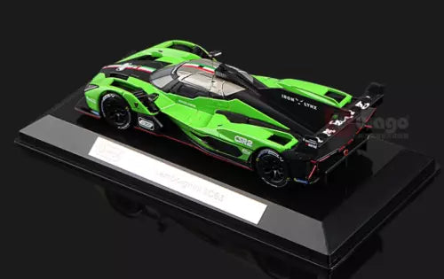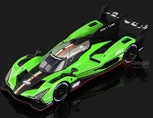 It's a 1:43 scale diecast replica of the Lamborghini SC63 endurance race car, featuring authentic design and race livery.