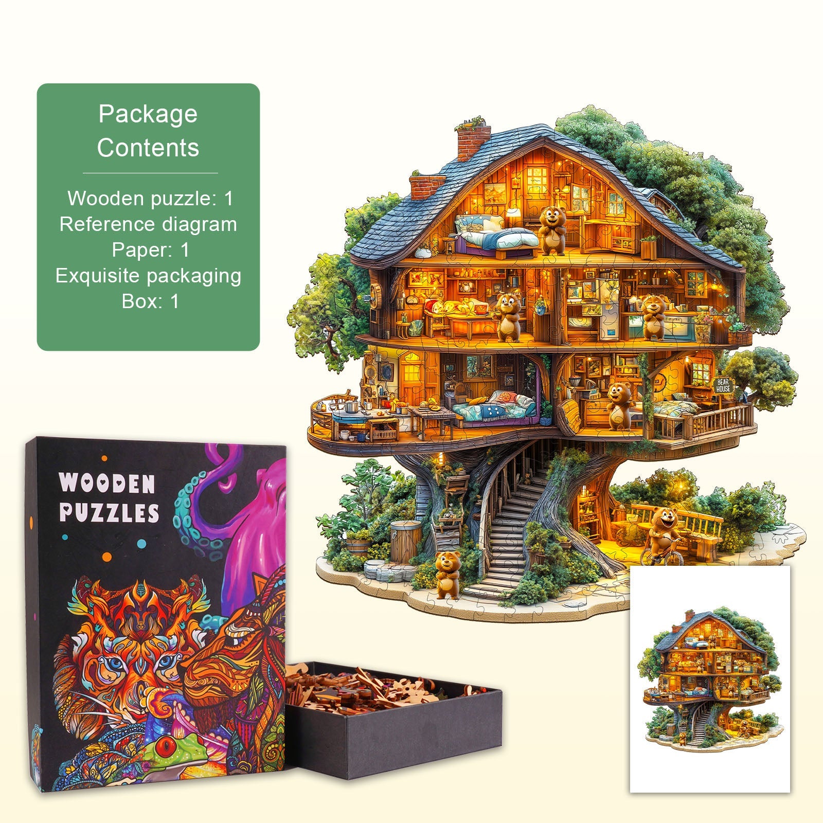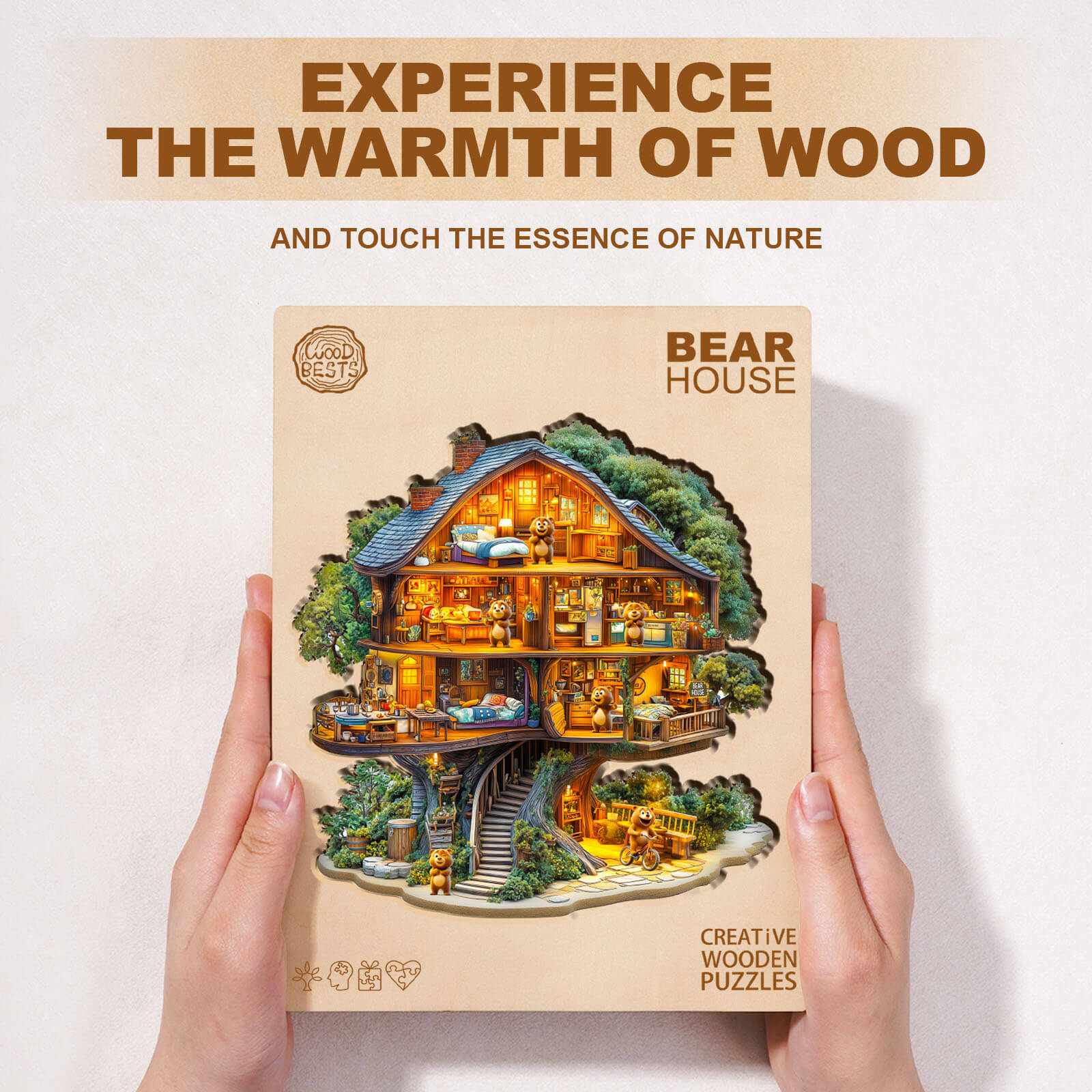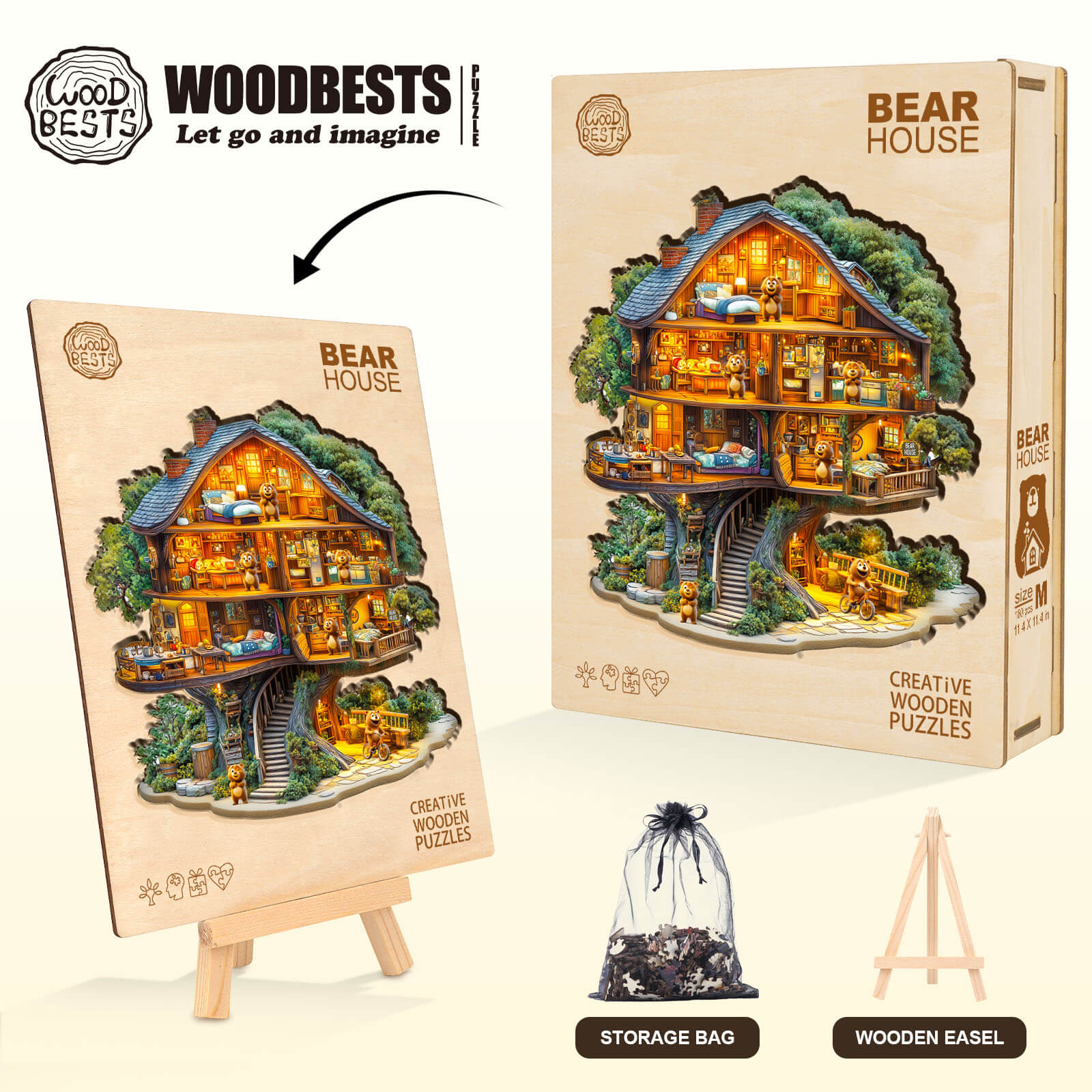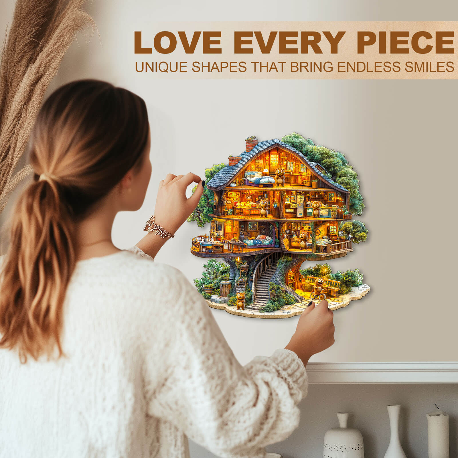 The Bear House Wooden Jigsaw Puzzle is a beautifully crafted, laser-cut puzzle featuring a cozy woodland bear home scene. Made from durable wood, it includes uniquely shaped "whimsy" pieces that add charm and challenge. Perfect for puzzle enthusiasts and nature lovers, it offers a relaxing and engaging experience for both kids and adults.