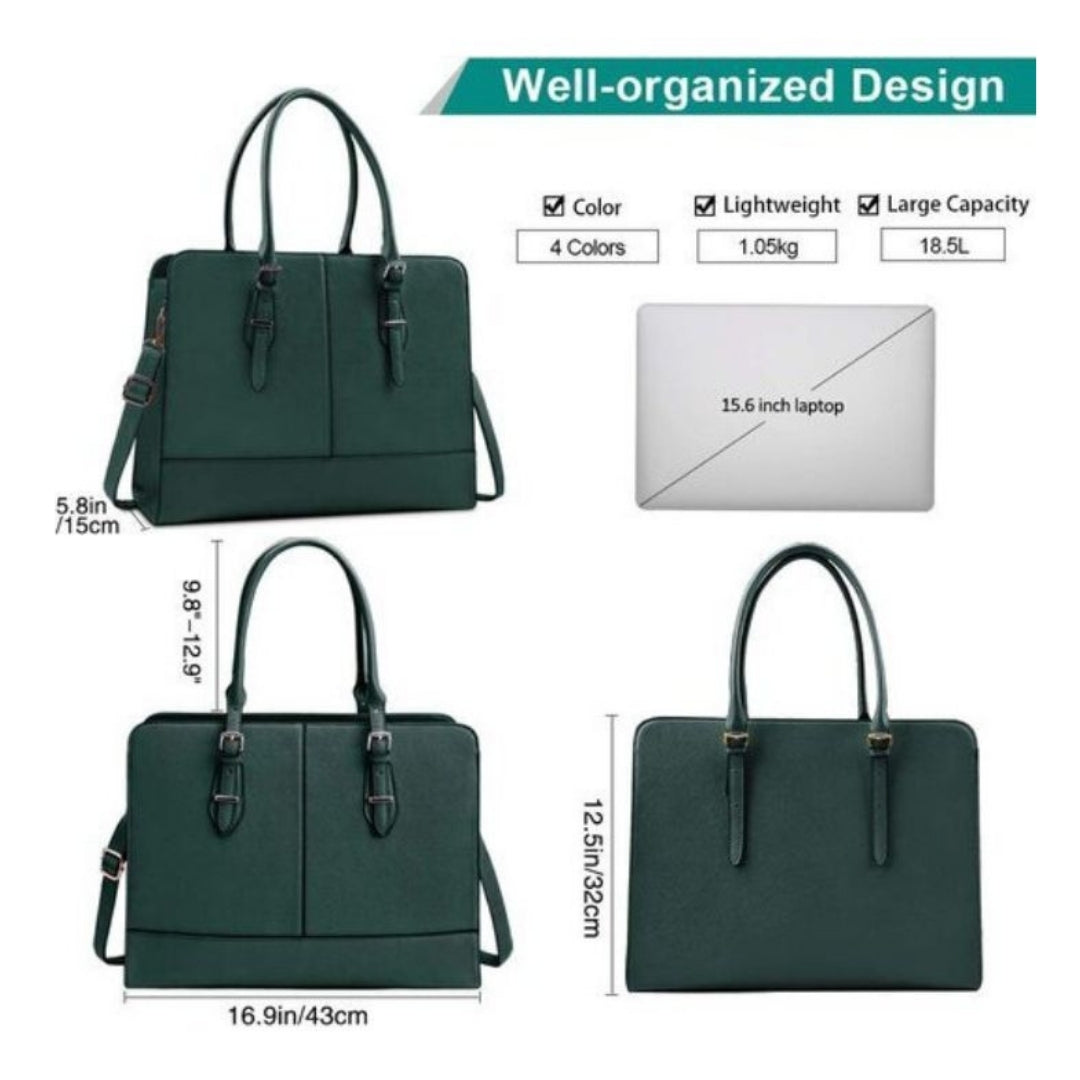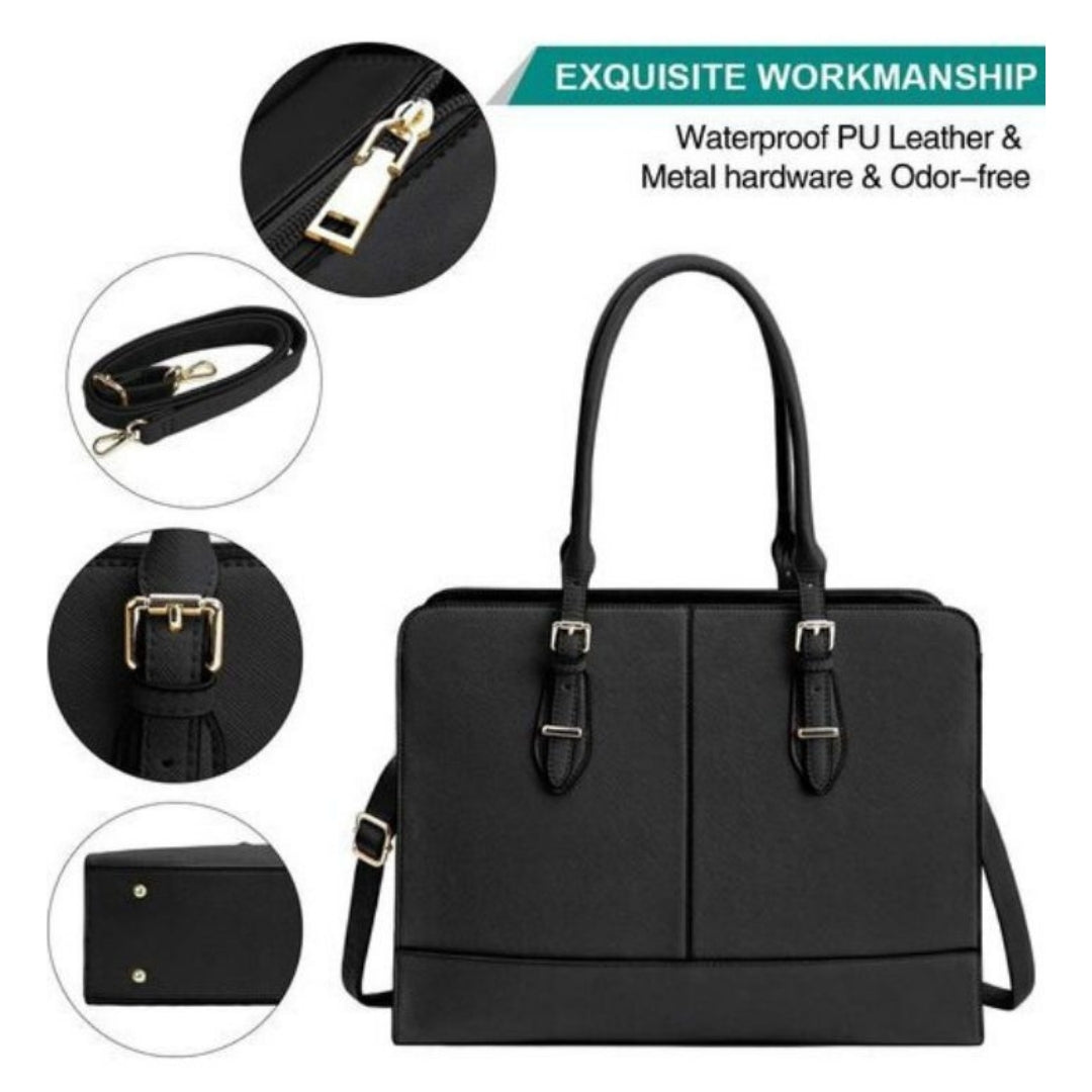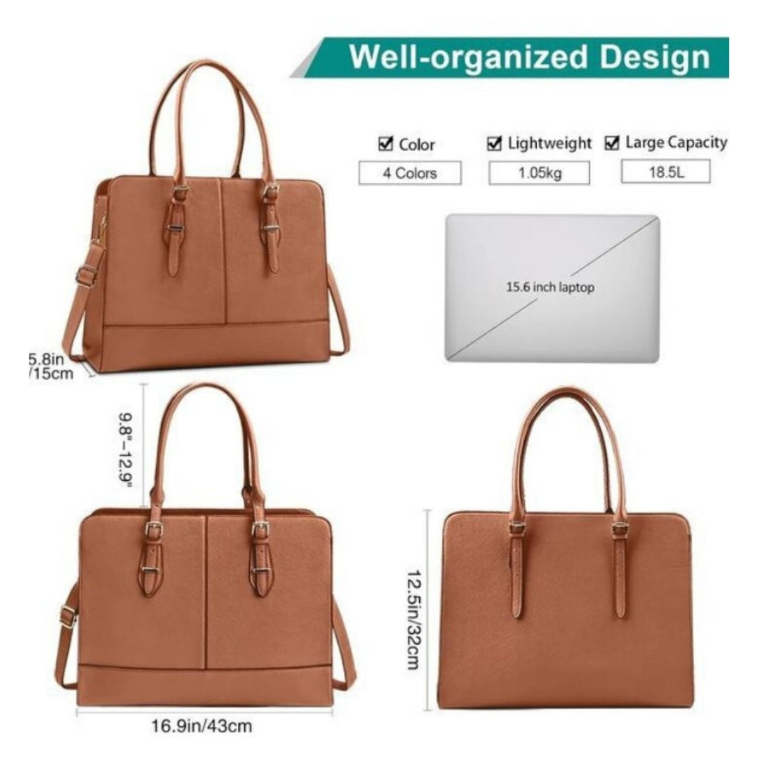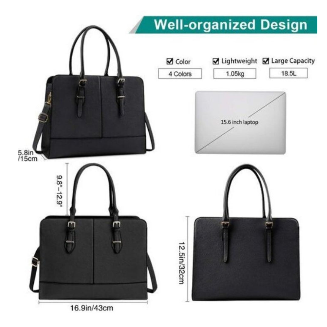 Perfect Size Work Bag- The dimension of the work bag for women is 16.9" x 5.9" x 12.6"(L*W*H). Handle drop: 6.3''. Net weight: 2.31 lbs. Adjustable shoulder strap is 27~48 inches long. Suitable for most 13"/14"/15"/15.6" laptops, and it is large enough to make your daily stuff well organized.