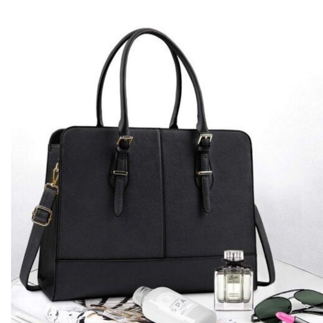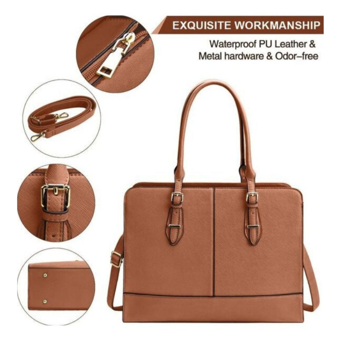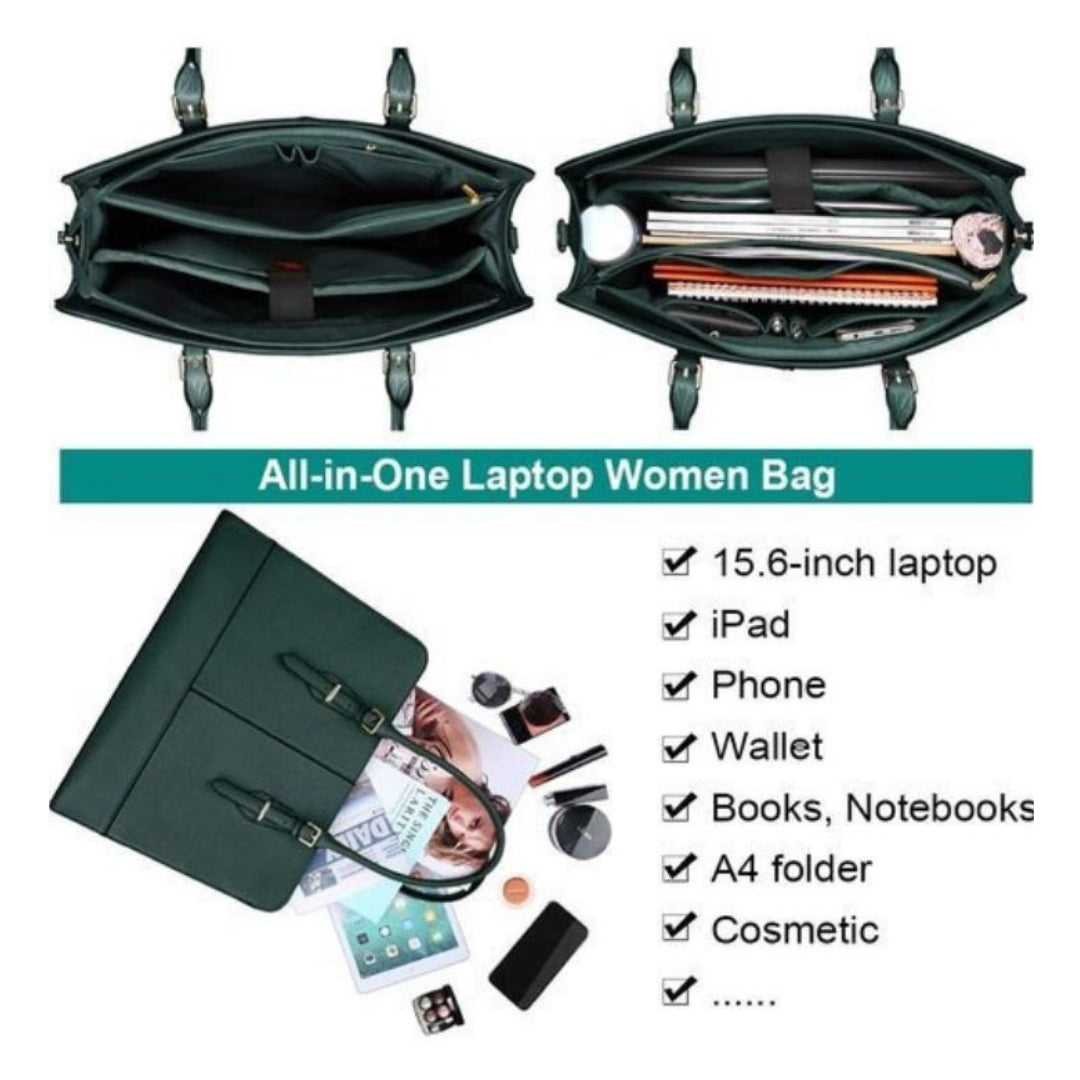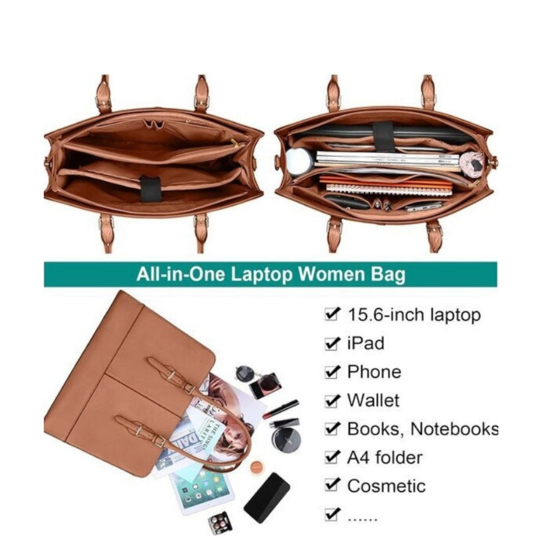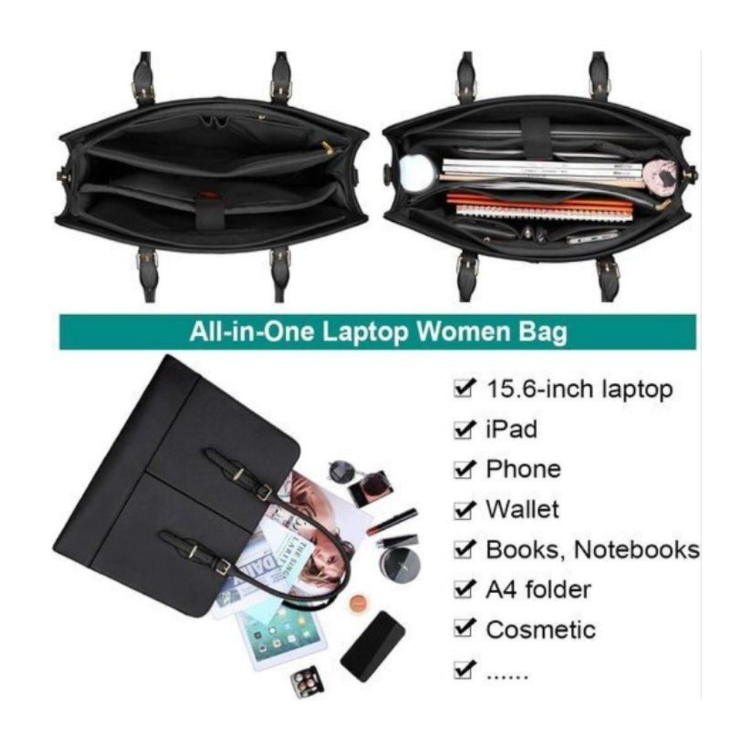 Large Capacity Laptop - Tote Women computer bag divided into 5 parts to keep your items organized. 1 laptop compartment to hold a 15.6" laptop and tablet with room to spare. 2 large compartments for documents and books. 1 large, zipped pocket for your private belongings. 2 slip pockets, 4 pens pockets, 2 mesh pockets, and 1 small zipper pocket for stock your ID card and wallet etc. Also, there is a front magnetic pocket for your easy access items.