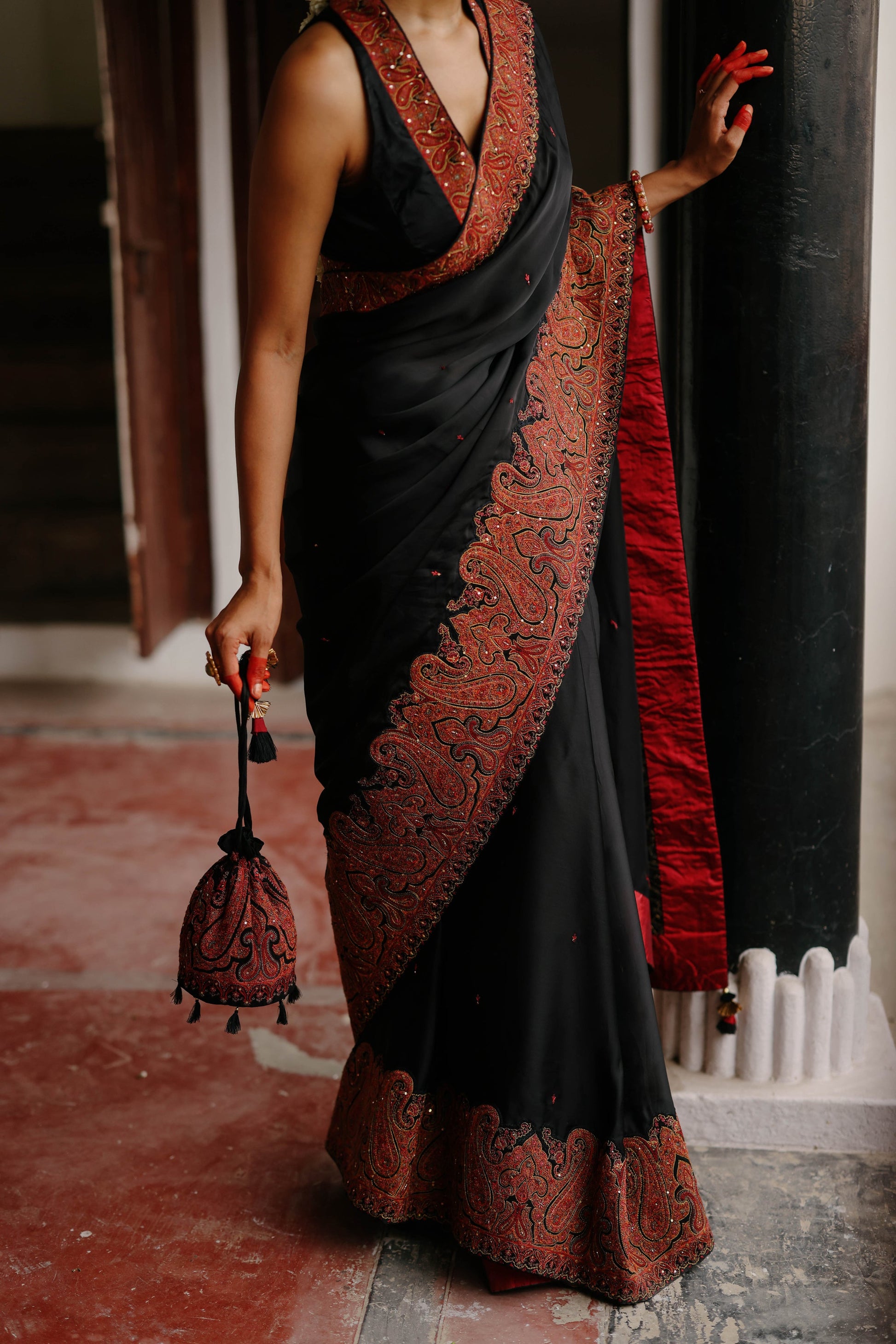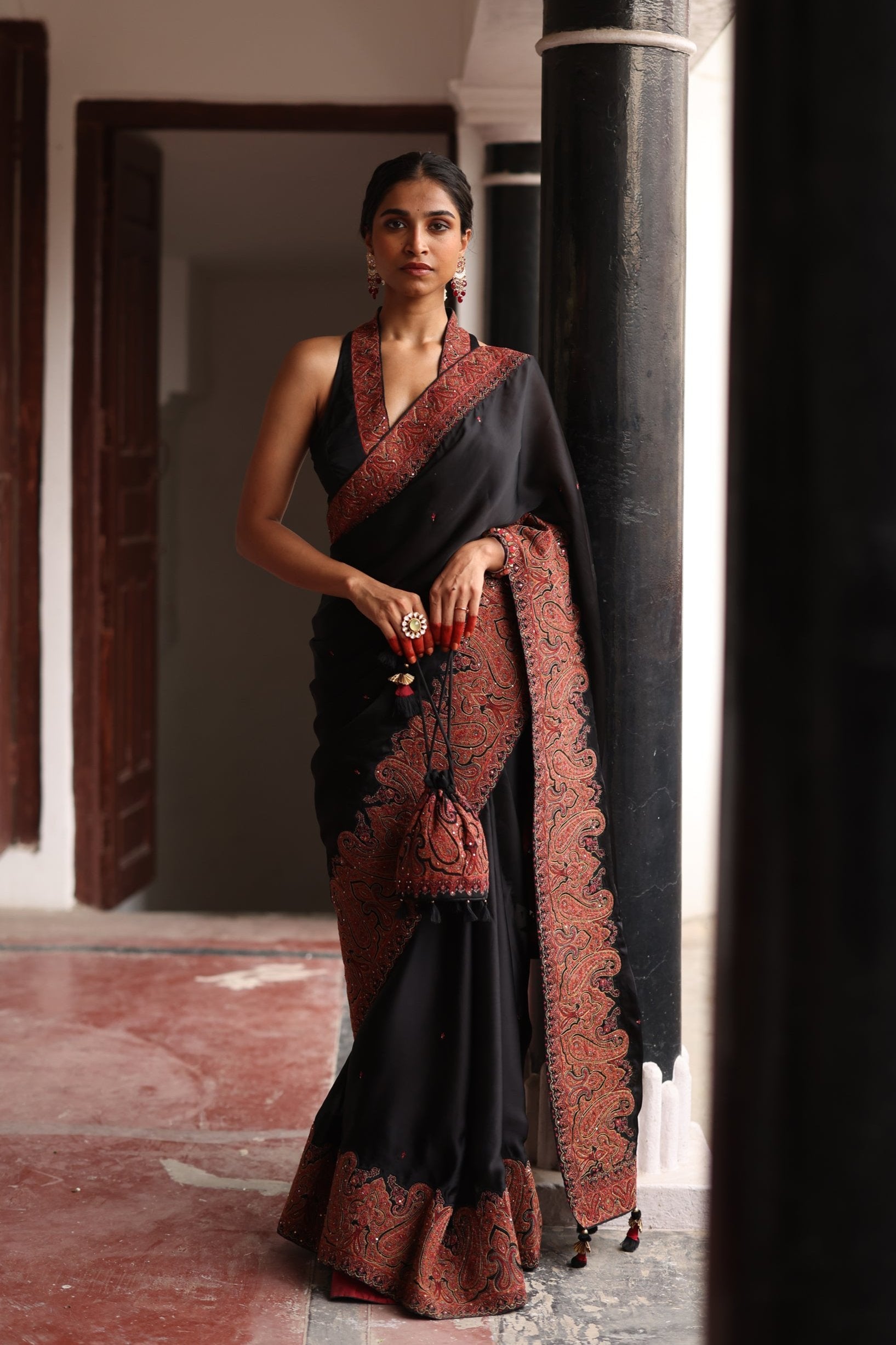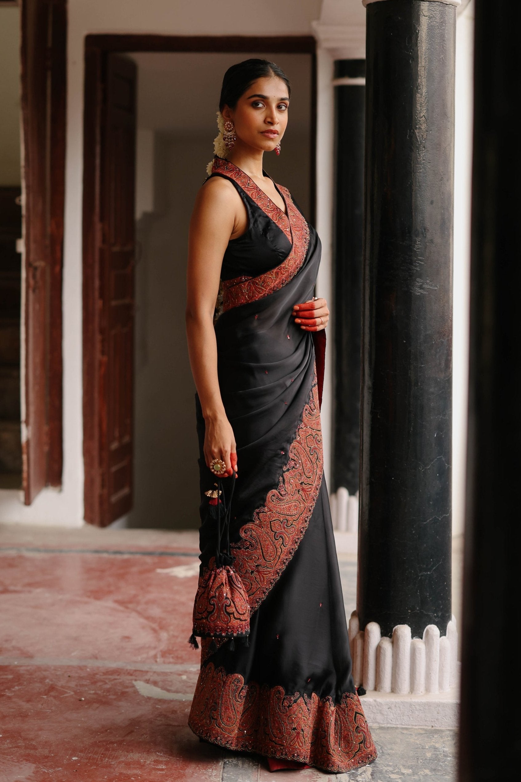 Make a lasting impression in the Black Hand Embroidered Paisley Saree, a perfect blend of traditional craftsmanship and contemporary design. This exquisite paisley saree showcases intricate hand embroidery, adding a touch of sophistication to your look. The rich black fabric serves as a striking canvas for the detailed embroidery, making it an ideal choice for weddings and festive occasions.