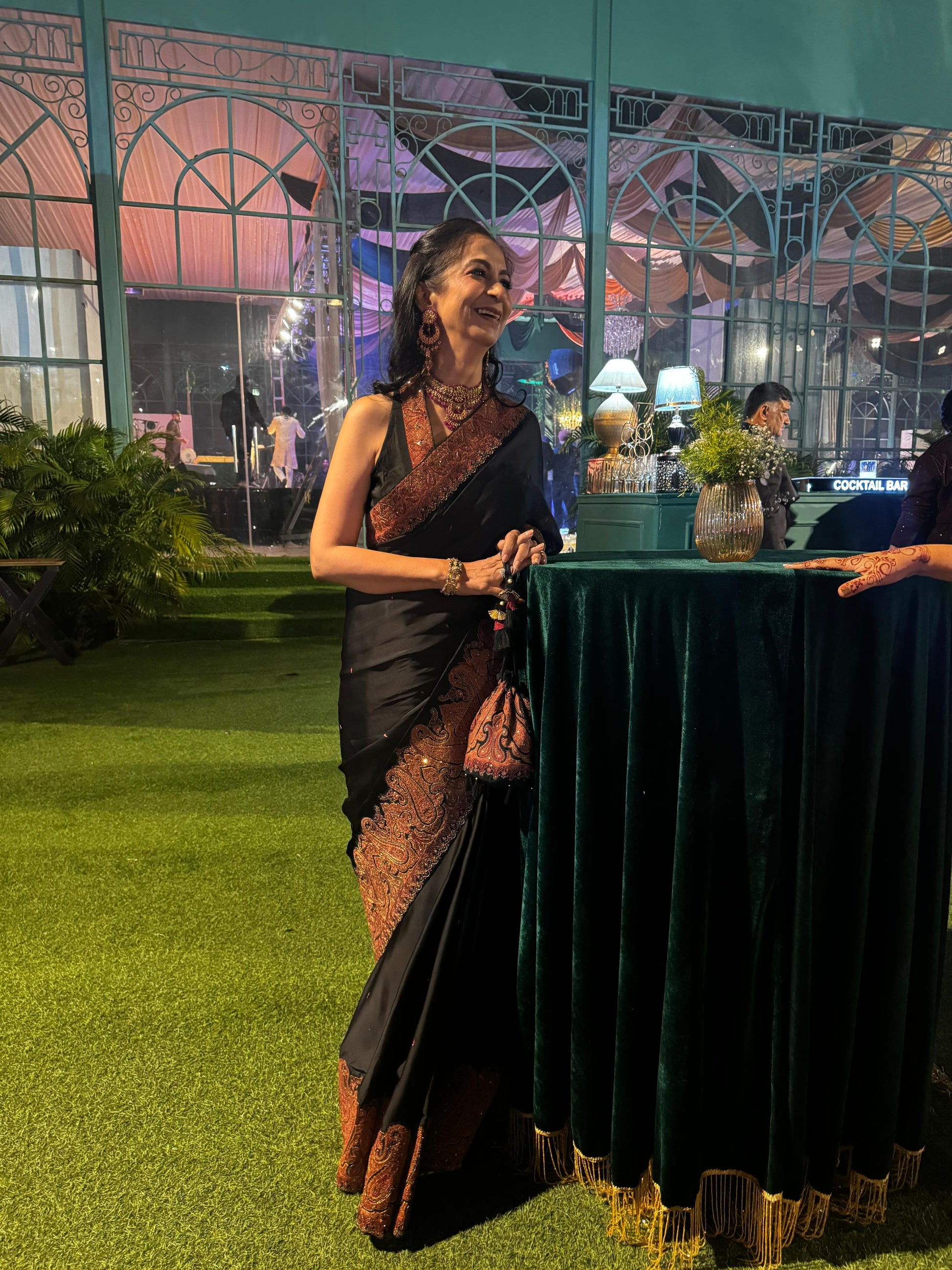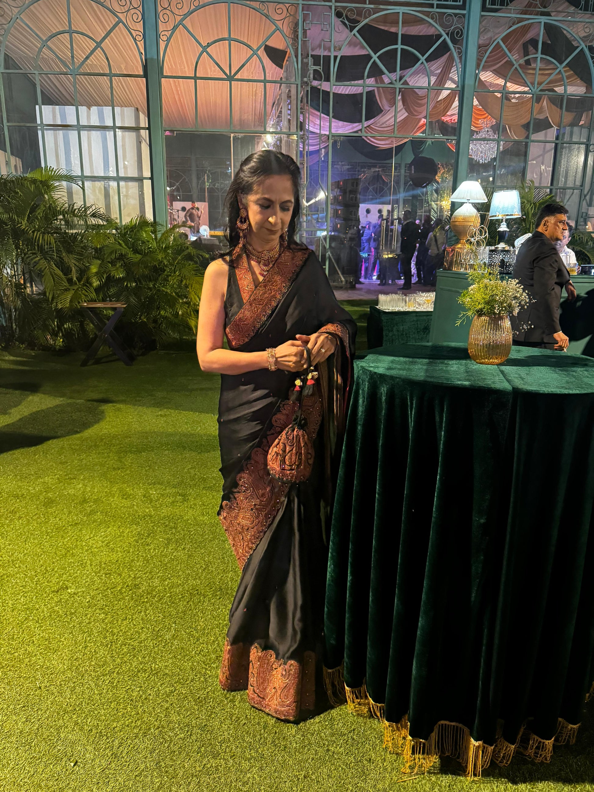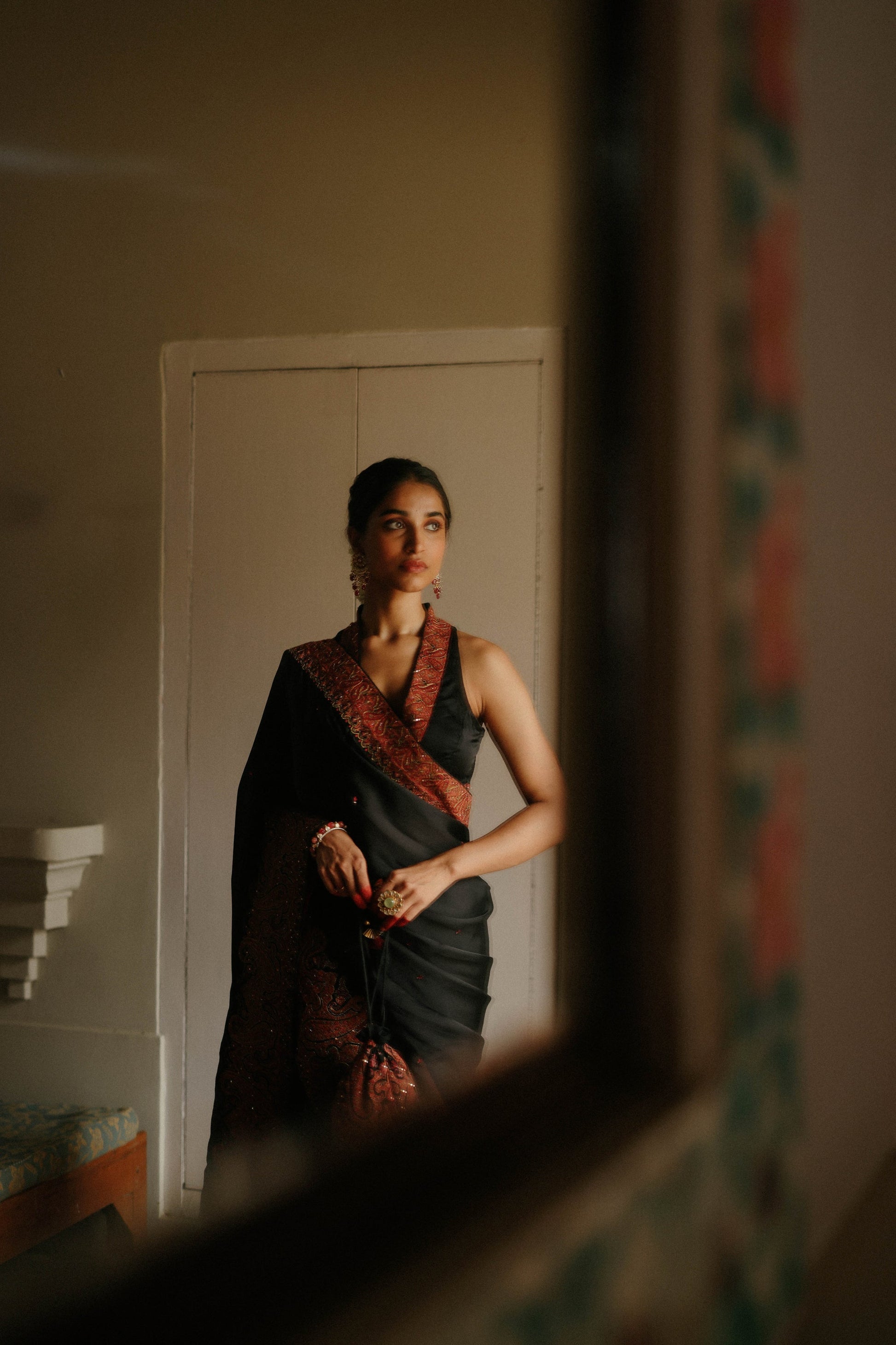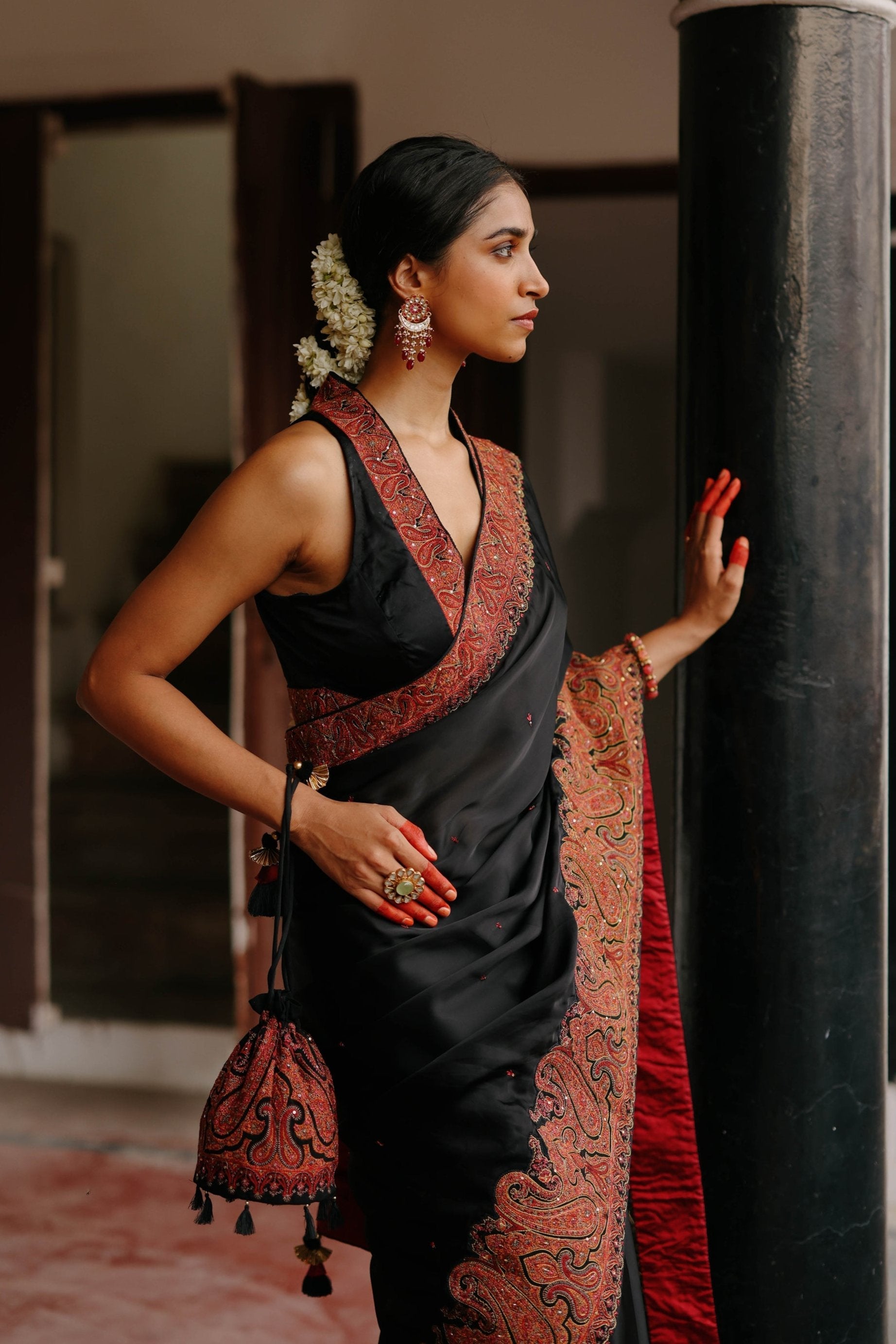 Make a lasting impression in the Black Hand Embroidered Paisley Saree, a perfect blend of traditional craftsmanship and contemporary design. This exquisite paisley saree showcases intricate hand embroidery, adding a touch of sophistication to your look. The rich black fabric serves as a striking canvas for the detailed embroidery, making it an ideal choice for weddings and festive occasions.