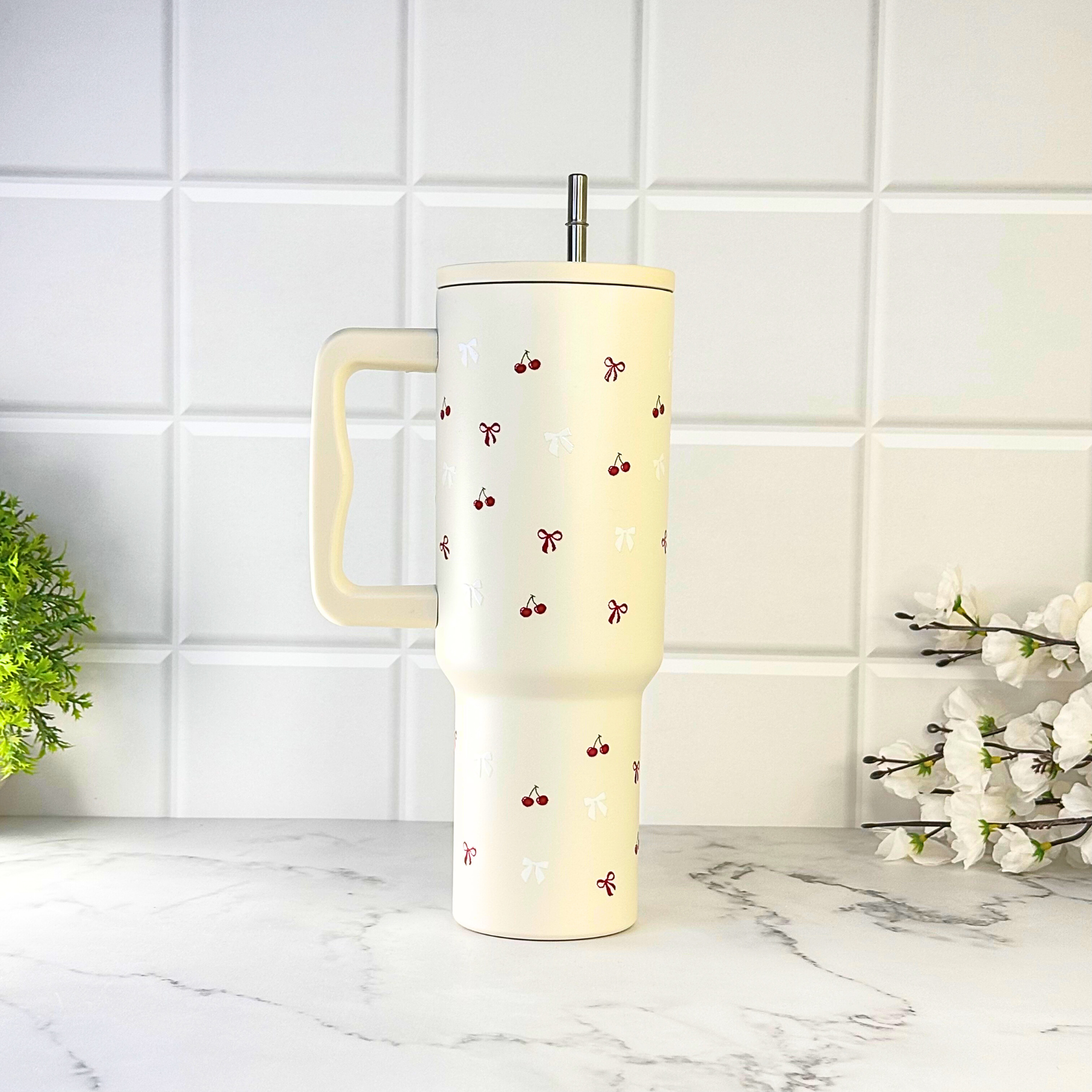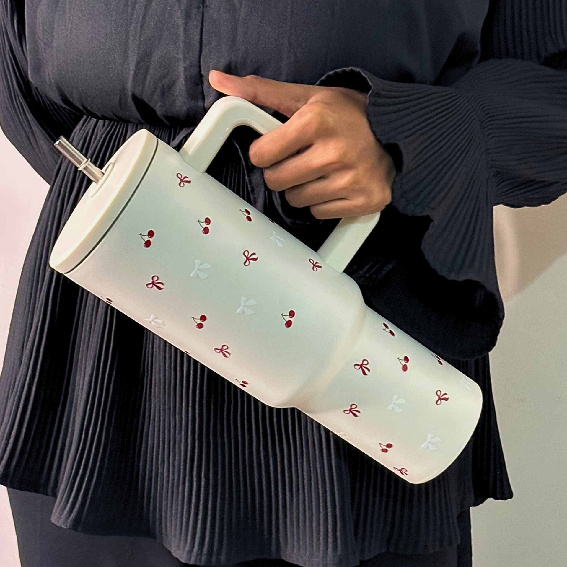 I love it ! Fits so much water, fits into my carβs cup holder, and I love that I can hold it with the handle. Allows me to hold multiple things. It is also super cute !