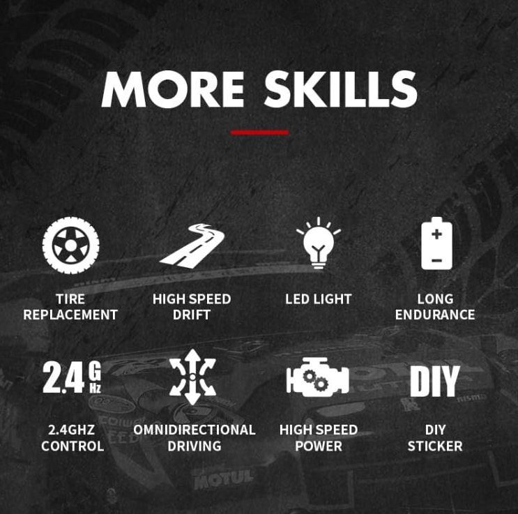 2. Drift Capabilities: Equipped with drift tires for enhanced sliding and cornering on smooth surfaces.