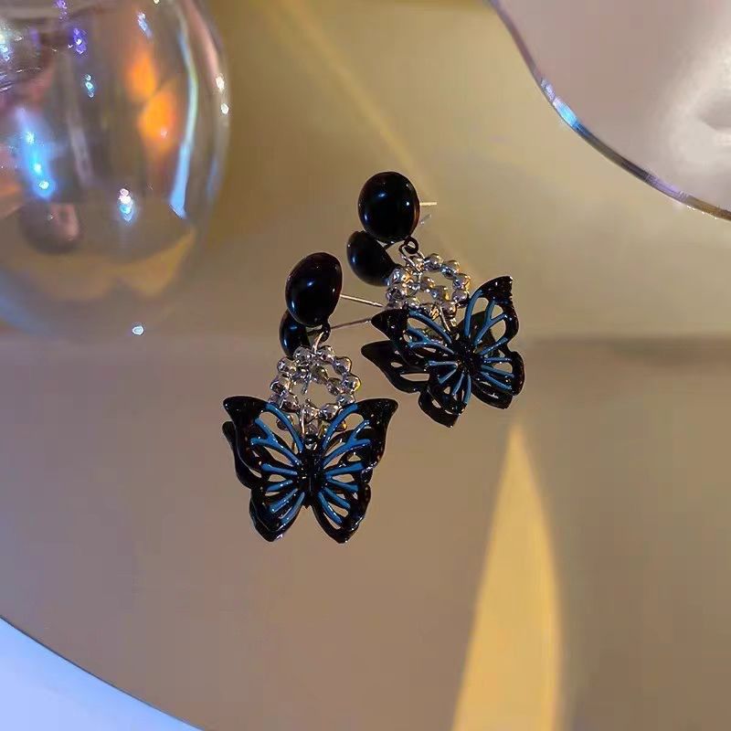 Korean earrings , soft girl aesthetic, black earrings, butterfly aesthetic jewellery, blue butterfly earrings.