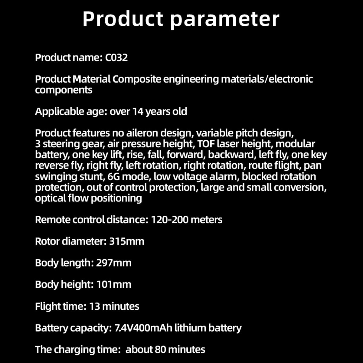 8. Low voltage alarm, blocking protection, runaway protection, size rudder conversion, one key takeoff, one key landing and other functions.