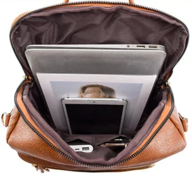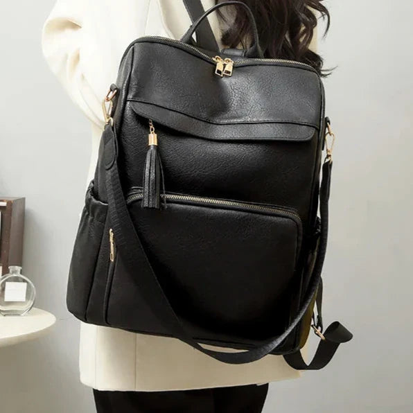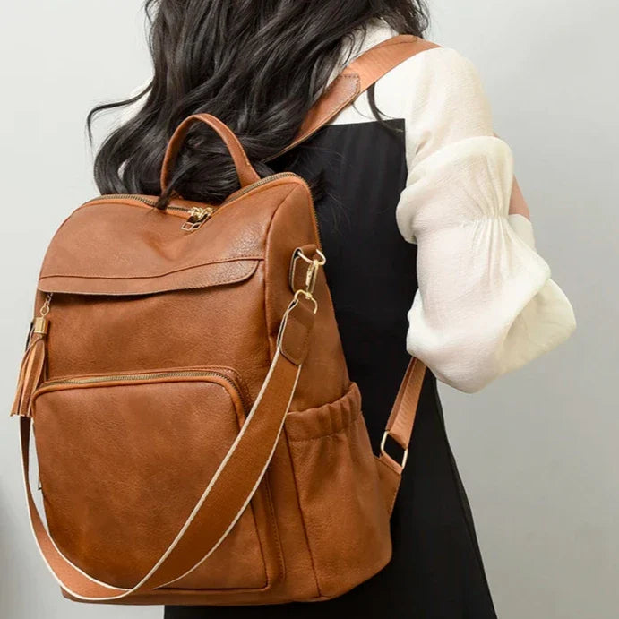 A beautiful high quality vegan backpack for work and everyday life that comes in four different colors. This is a vegan leather backpack with two zippered pockest on the front and a small zippered side/back pocket, along with side bottle holders. On the inside is a zippered pocket.