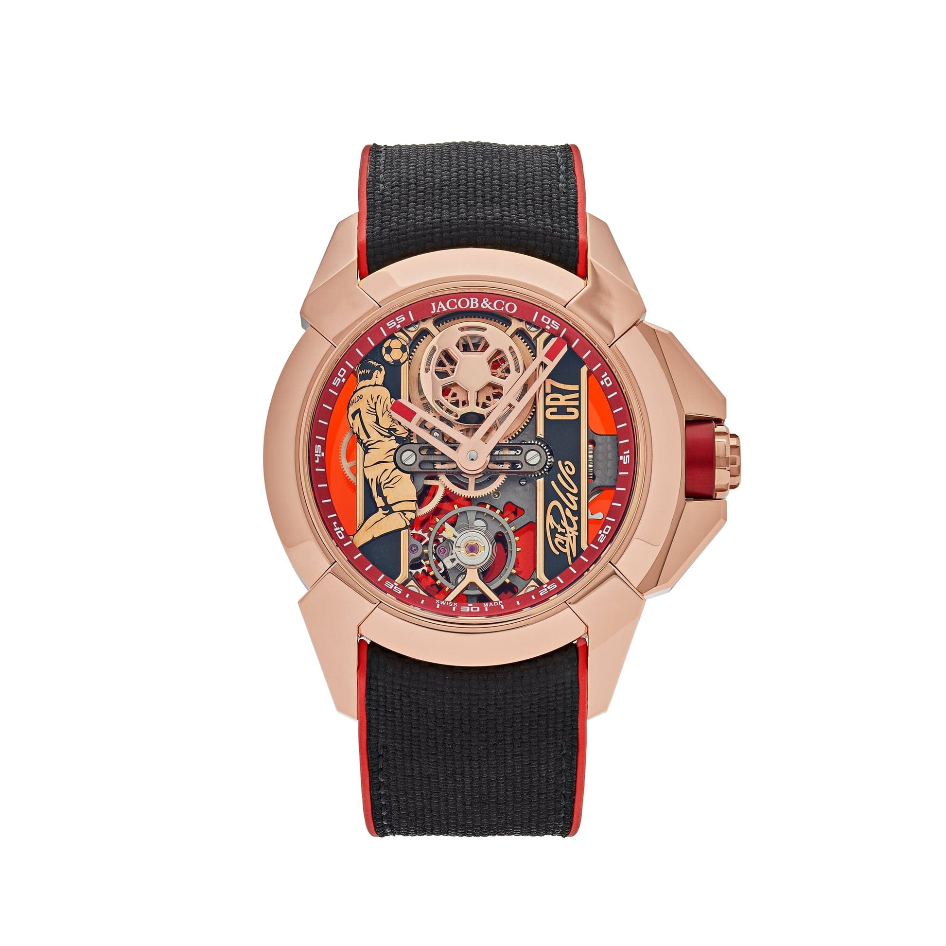 The Jacob & Co. Epic X CR7 “Flight of CR7” in rose gold features a skeletonized hand-wound movement, a diamond-set bezel, and design elements honoring Cristiano Ronaldo. Limited to 999 pieces, it combines luxury, craftsmanship, and iconic sports legacy.