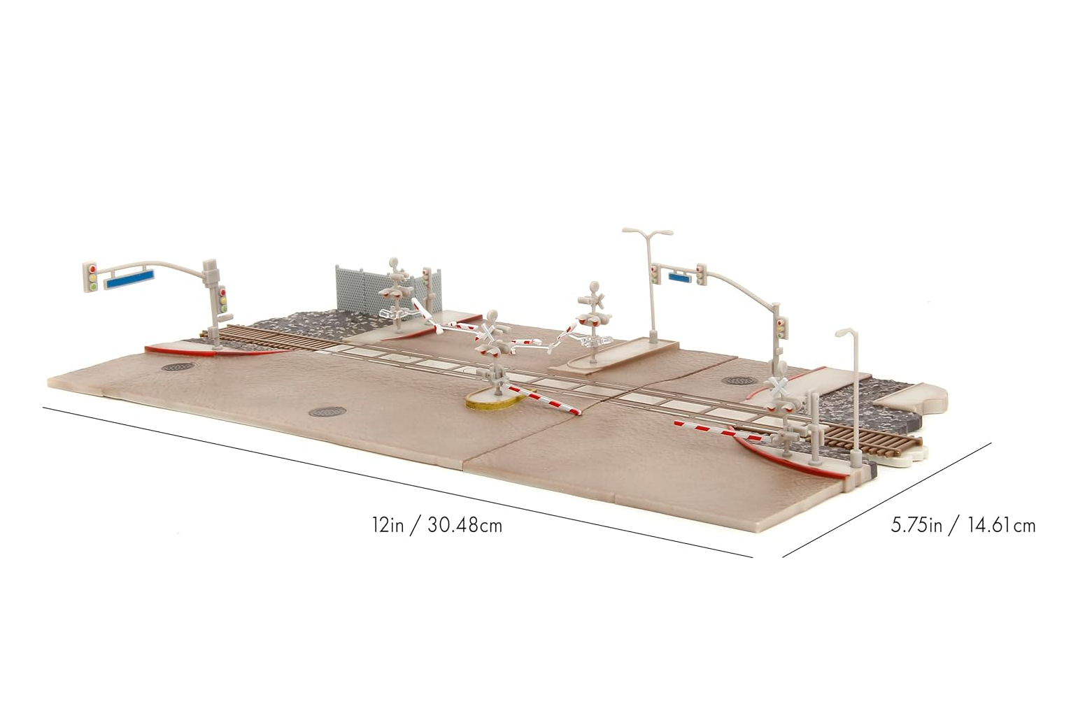 Features a stylized train track scene with integrated stands for dynamic vehicle positioning.