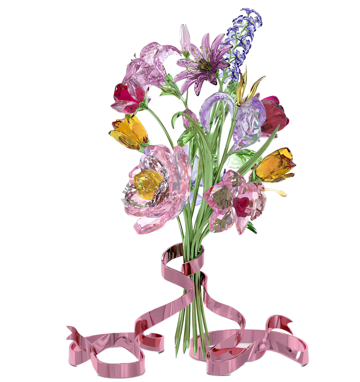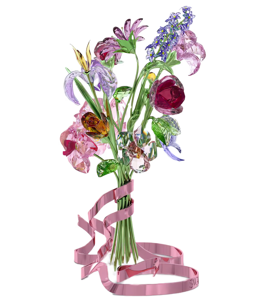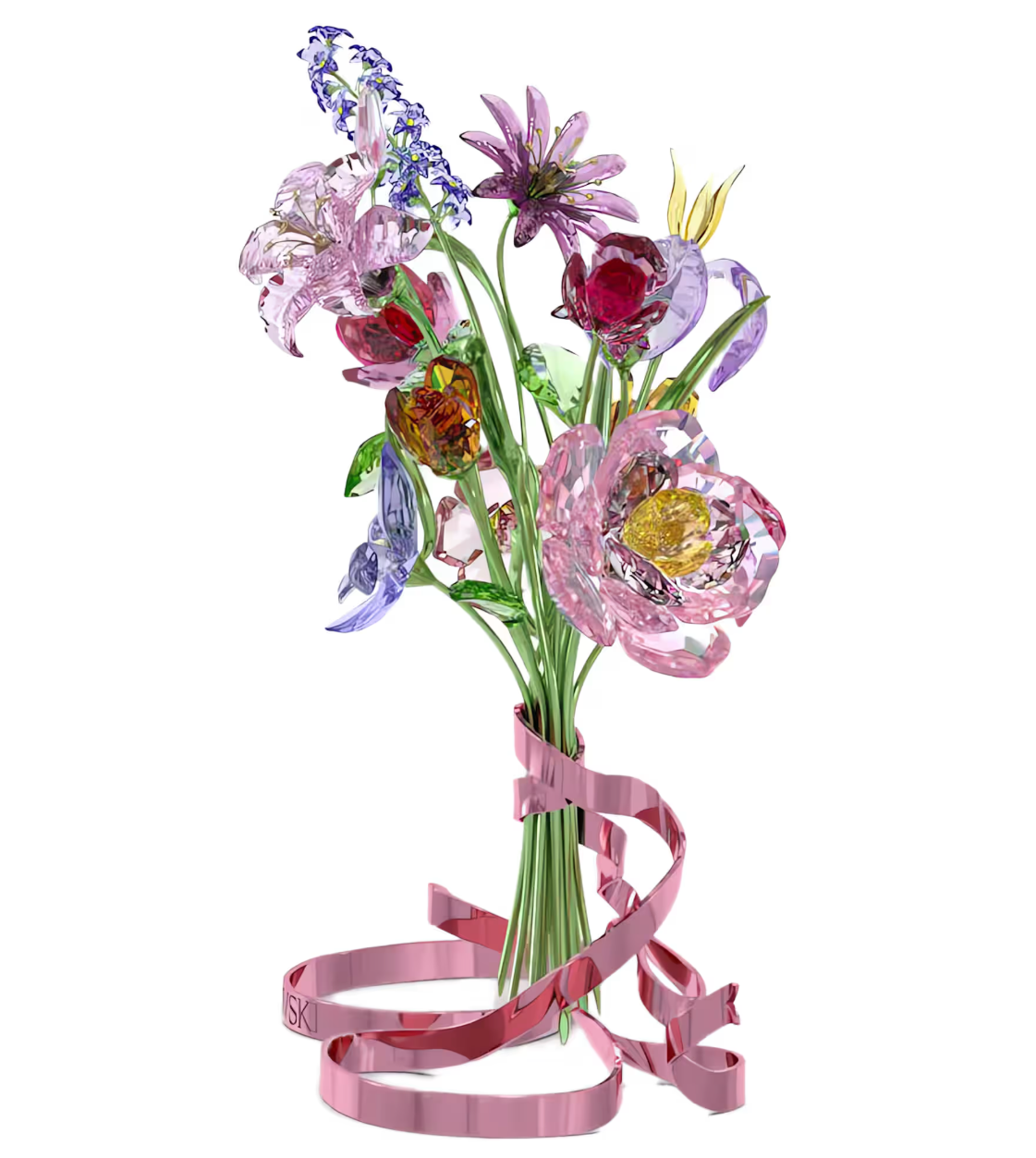 The bouquet is made from high-quality crystals and lacquered metal. The green stems and pink ribbon are accented with lacquered metal, adding to the piece's elegance.