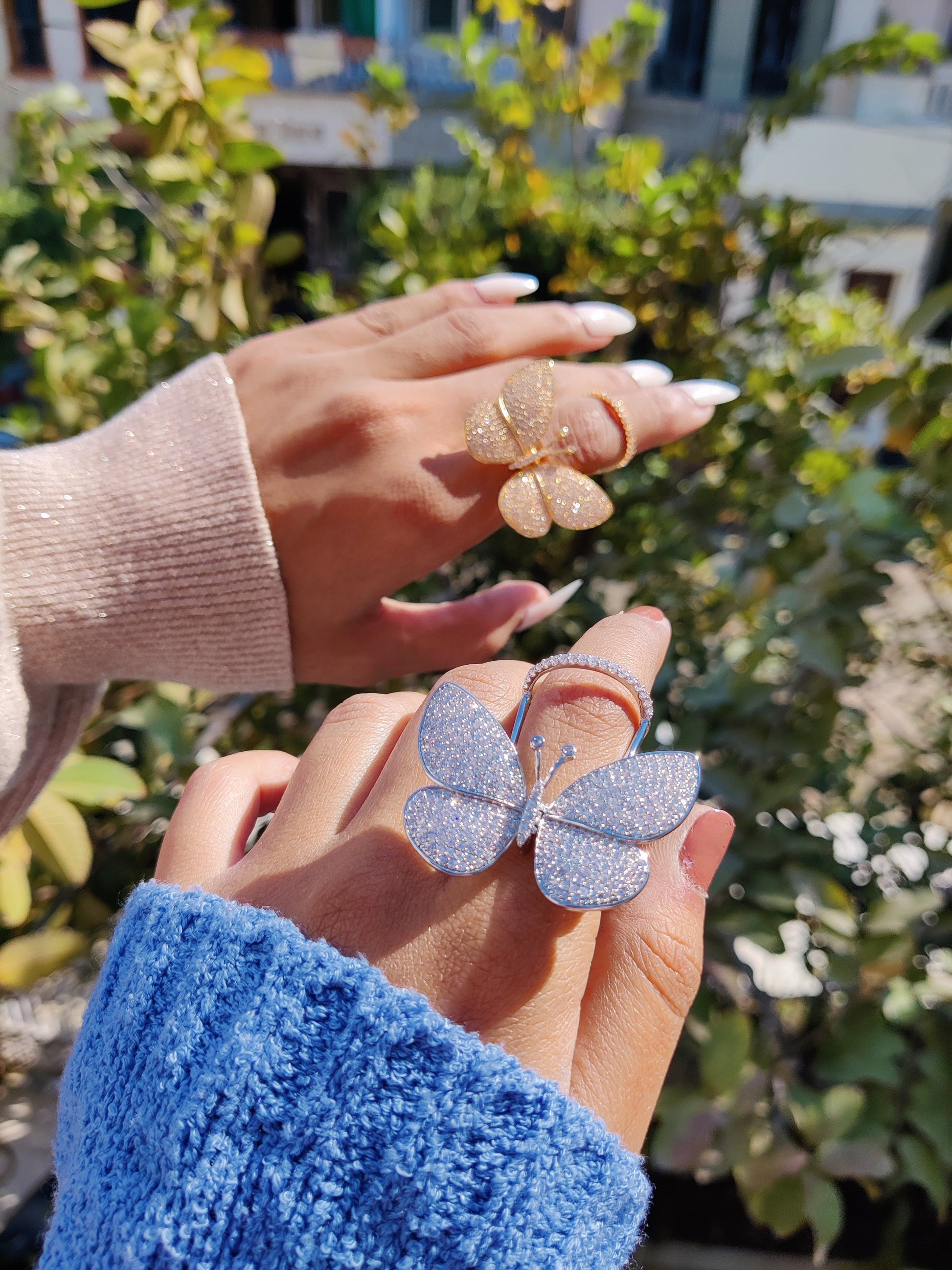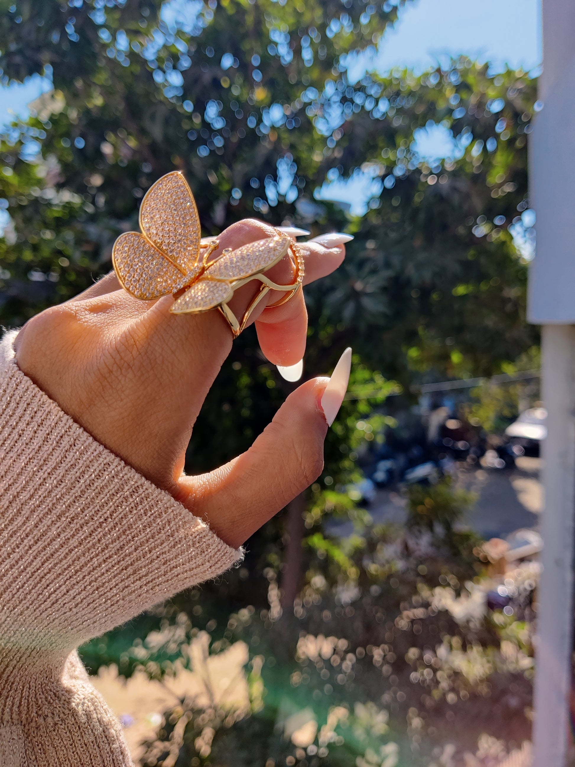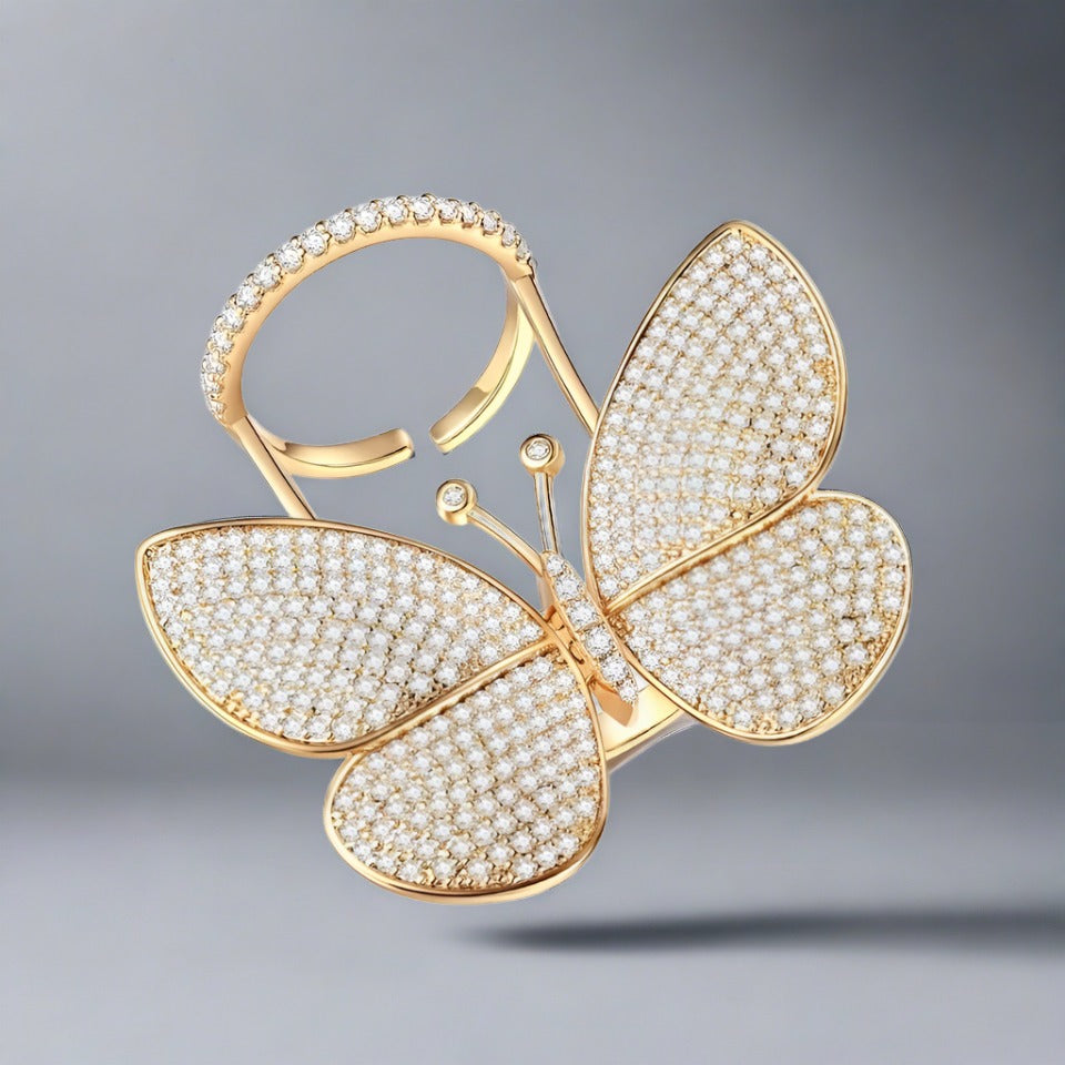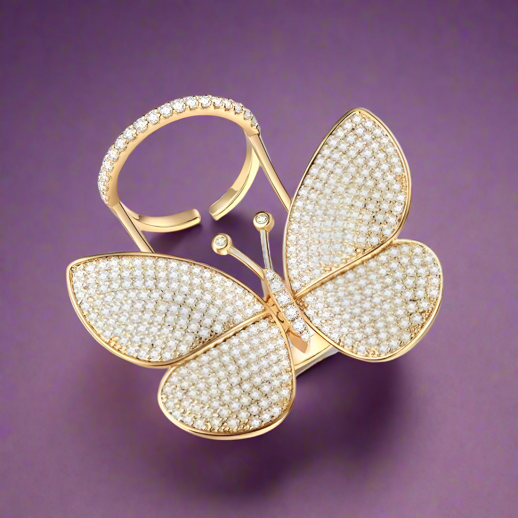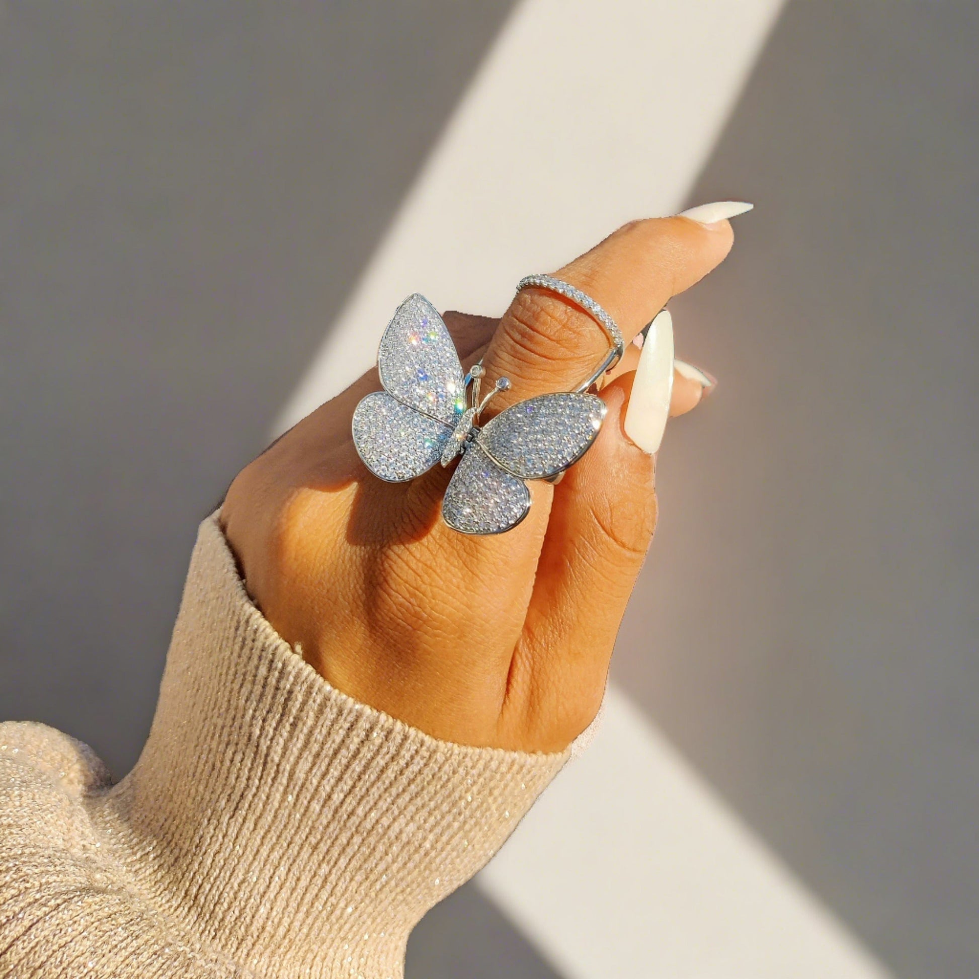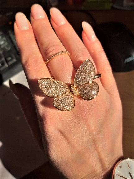 Imagine an elegant butterfly, crafted with shimmering diamonds, perched gracefully on your finger. The ring's design allows the butterfly's wings to flutter gently with the movements of your finger, adding a touch of whimsy and magic to your look.