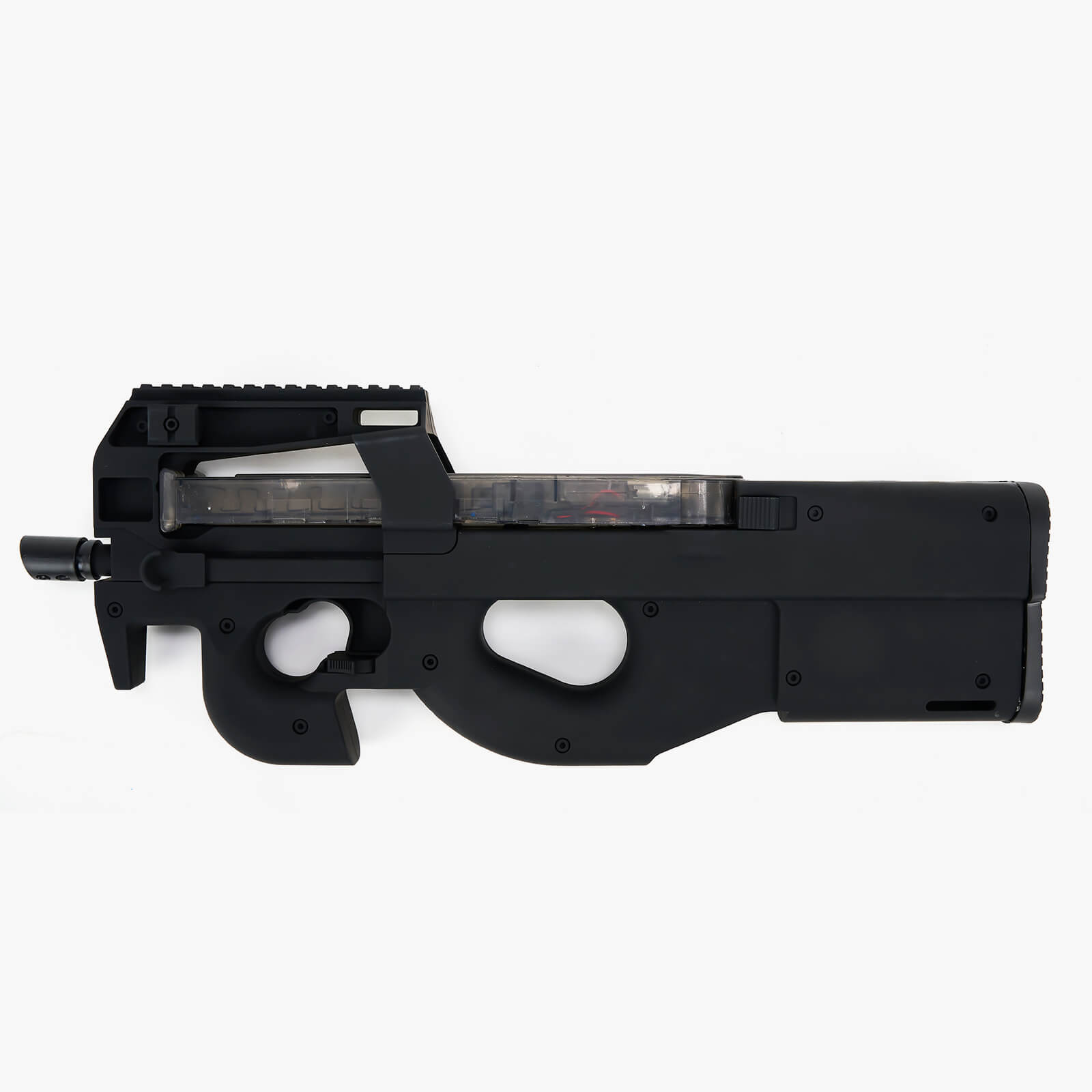 The hardware upgrade gives the P90 gel blaster a solid foundation for shooting performance. The gel blaster's long-lasting performance is ensured by the large capacity battery and battery compartment. While increasing the capacity of the magazine, it uses a motor and spring pressure drive to allow the feed system to be very smooth, the built-in barrel is upgraded to an aluminum tube, which reduces the friction between the orbeez ball and the inner wall of the barrel, providing a good and smooth shooting experience; additionally, the quick release of the magazine and the gun body makes loading very easy, convenient, and fast.