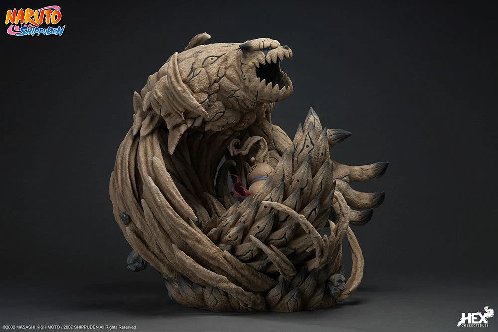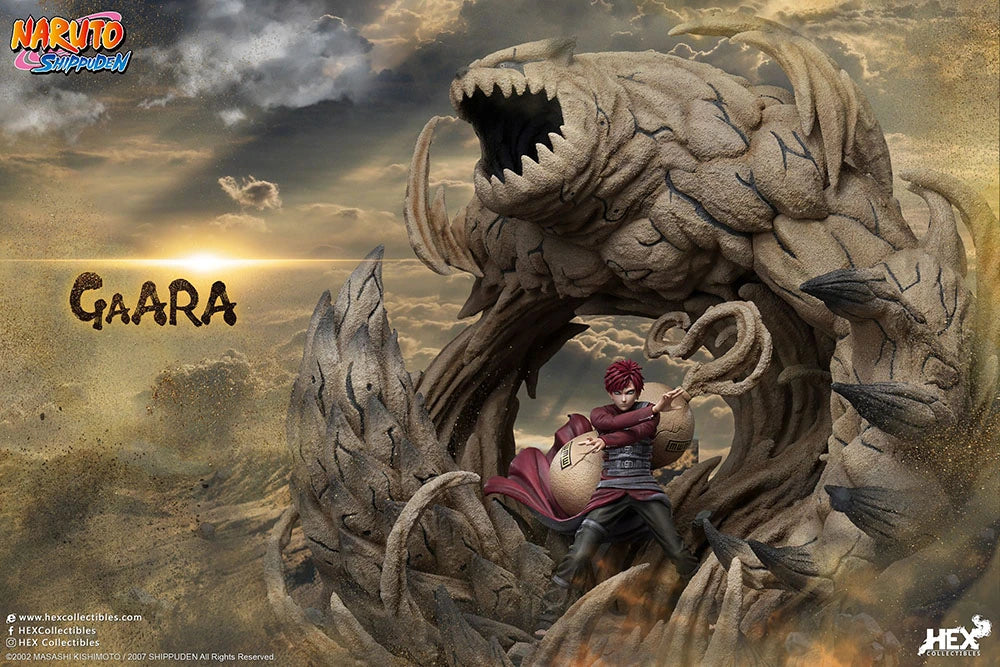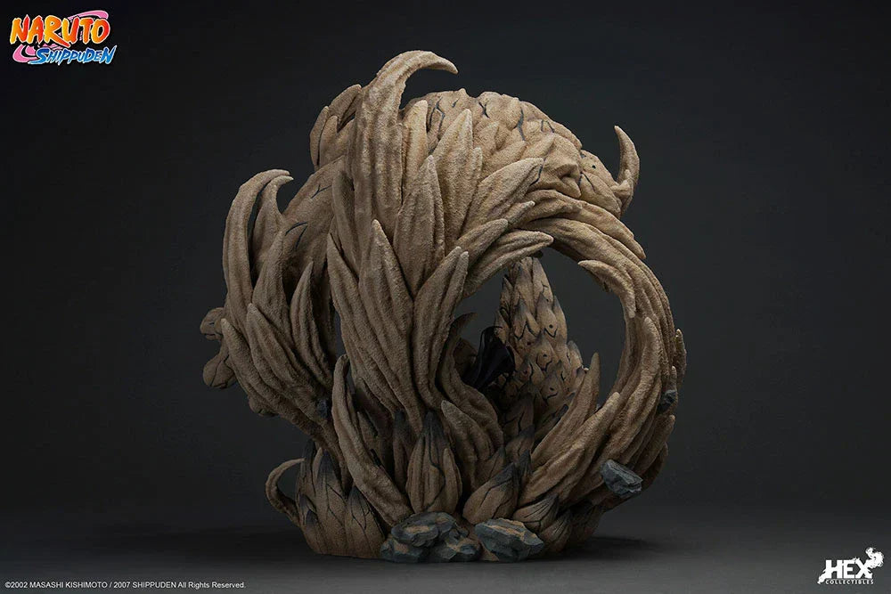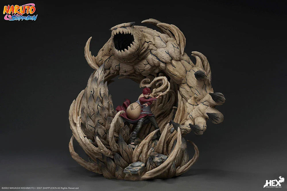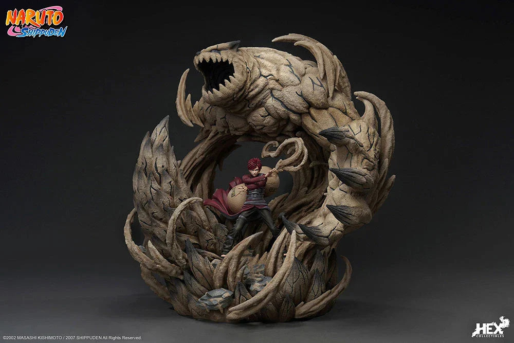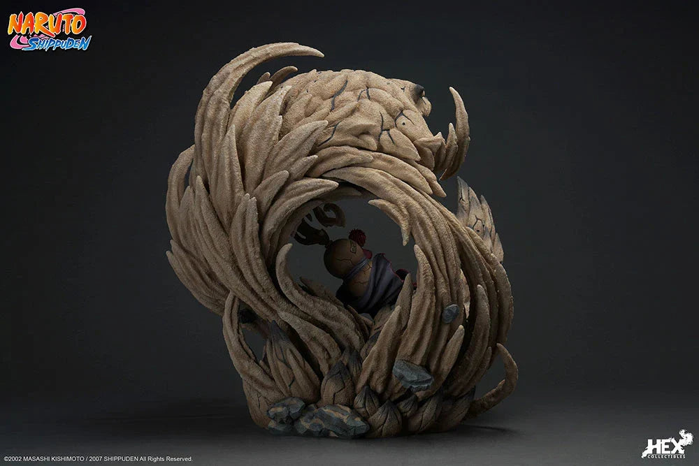 A huge gourd tied on the back, Gaara wears a long-sleeved crimson robe standing firmly on the sand and stones. The Fifth Kazekage stares at his enemy with a stern look and manipulates the sand rushing out of the base and his gourd, which adds a powerful feeling to the statue. Behind Gaara, the One-Tailed Shukaku waves its sharp claws and howls angrily to the sky.