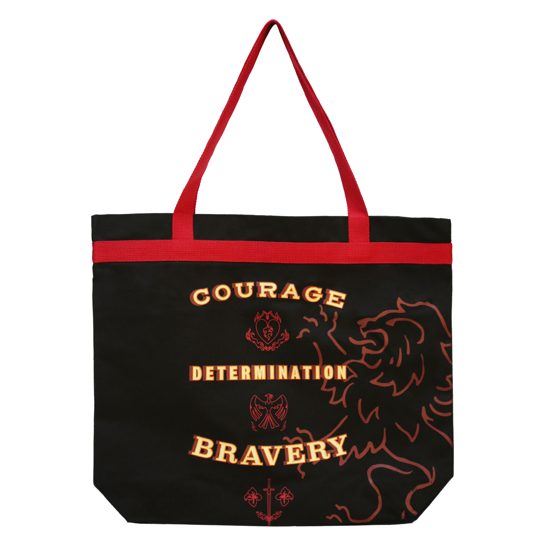 Show off your Gryffindor spirit with this bold black canvas tote, accented with deep red trim that any daring witch or wizard would admire. The front proudly displays Courage, Determination, and Bravery in bold block lettering, alongside a majestic silhouette of the Gryffindor lion, roaring with house pride.