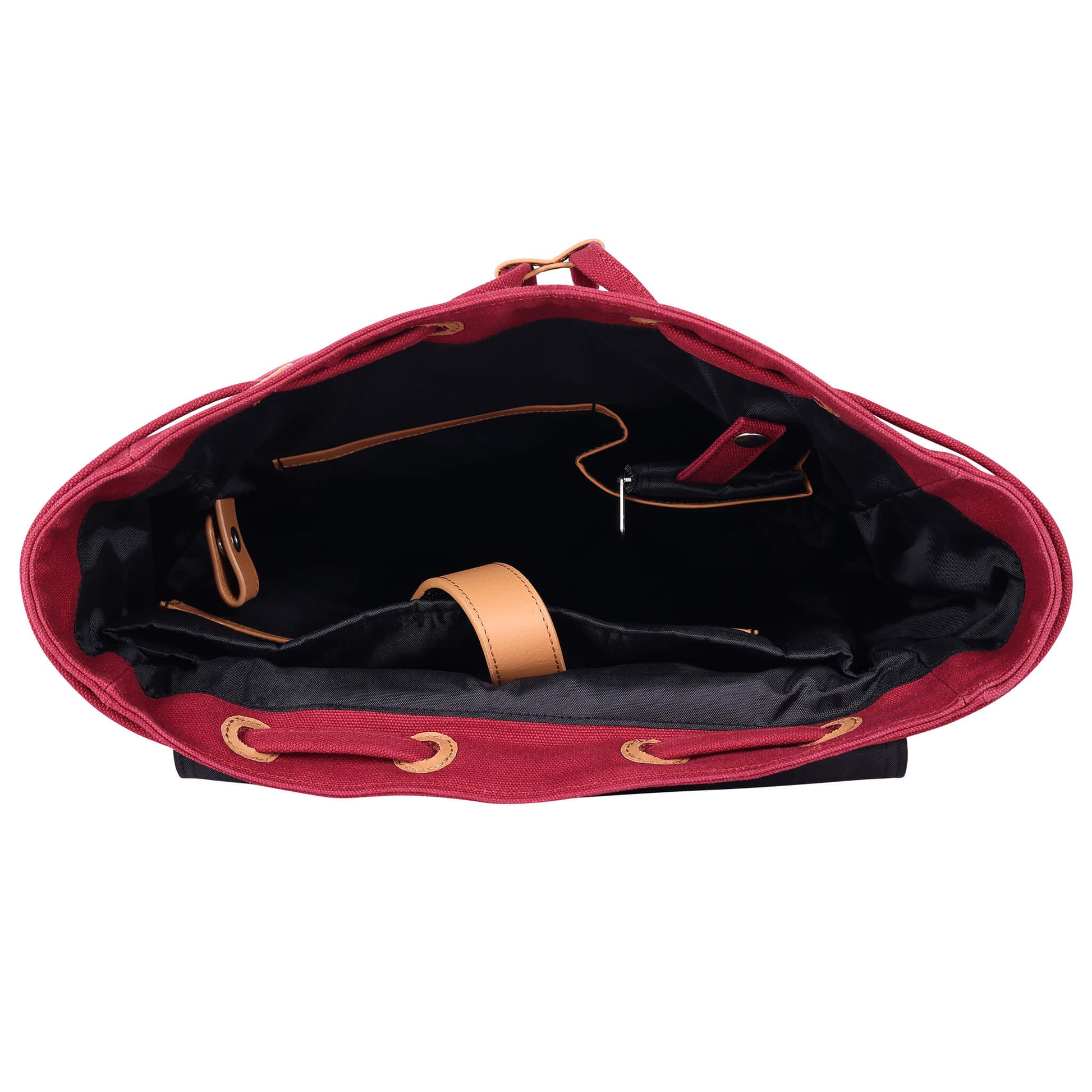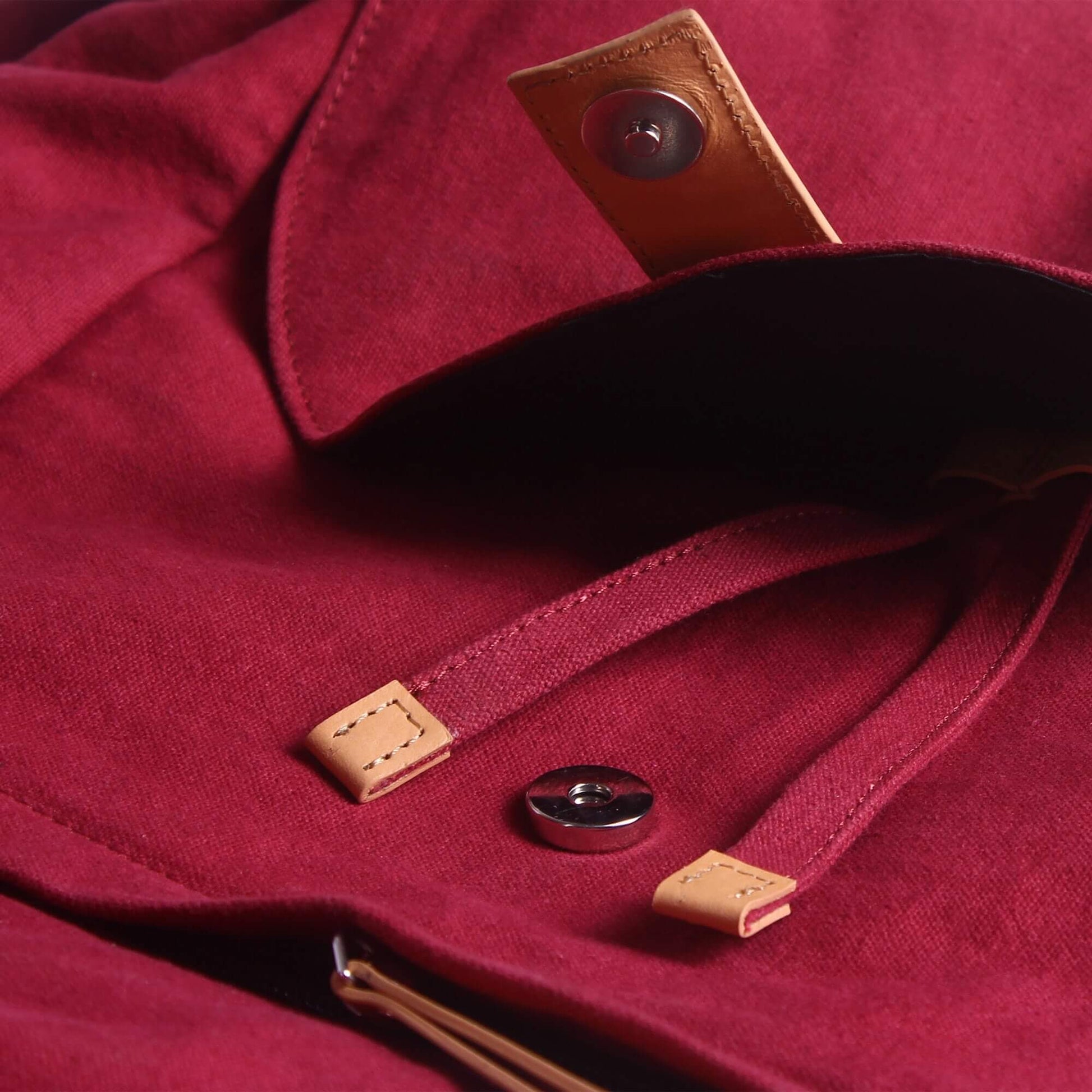 Leather detailing is used in carry handle, flap tie, puller, drawstring ends, shoulder strap ends, under the flap pocket, keychain holder, velcro closure, inner binding.