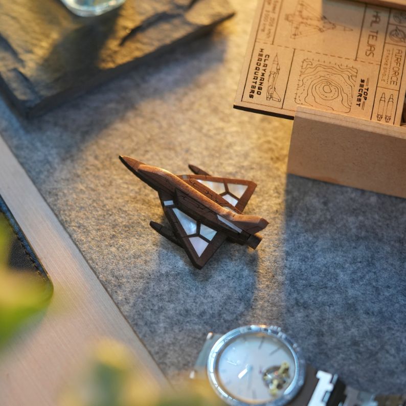 The brooch, part of the Fighter Jet Collectible Series, is a detailed representation of the Tejas, showcasing its sleek and modern design. Crafted with mother of pearl and wood, this brooch exudes elegance while celebrating the technological prowess of one of India’s most iconic aircraft.