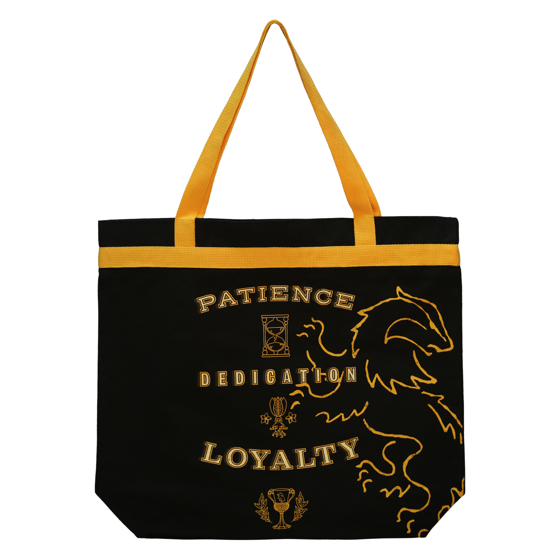 Show your Hufflepuff pride with this charming black canvas tote, accented with warm yellow trim that radiates house spirit. The front proudly displays Patience, Dedication, and Loyalty in bold block lettering, alongside a majestic silhouette of the Hufflepuff badger, standing strong and steadfast.