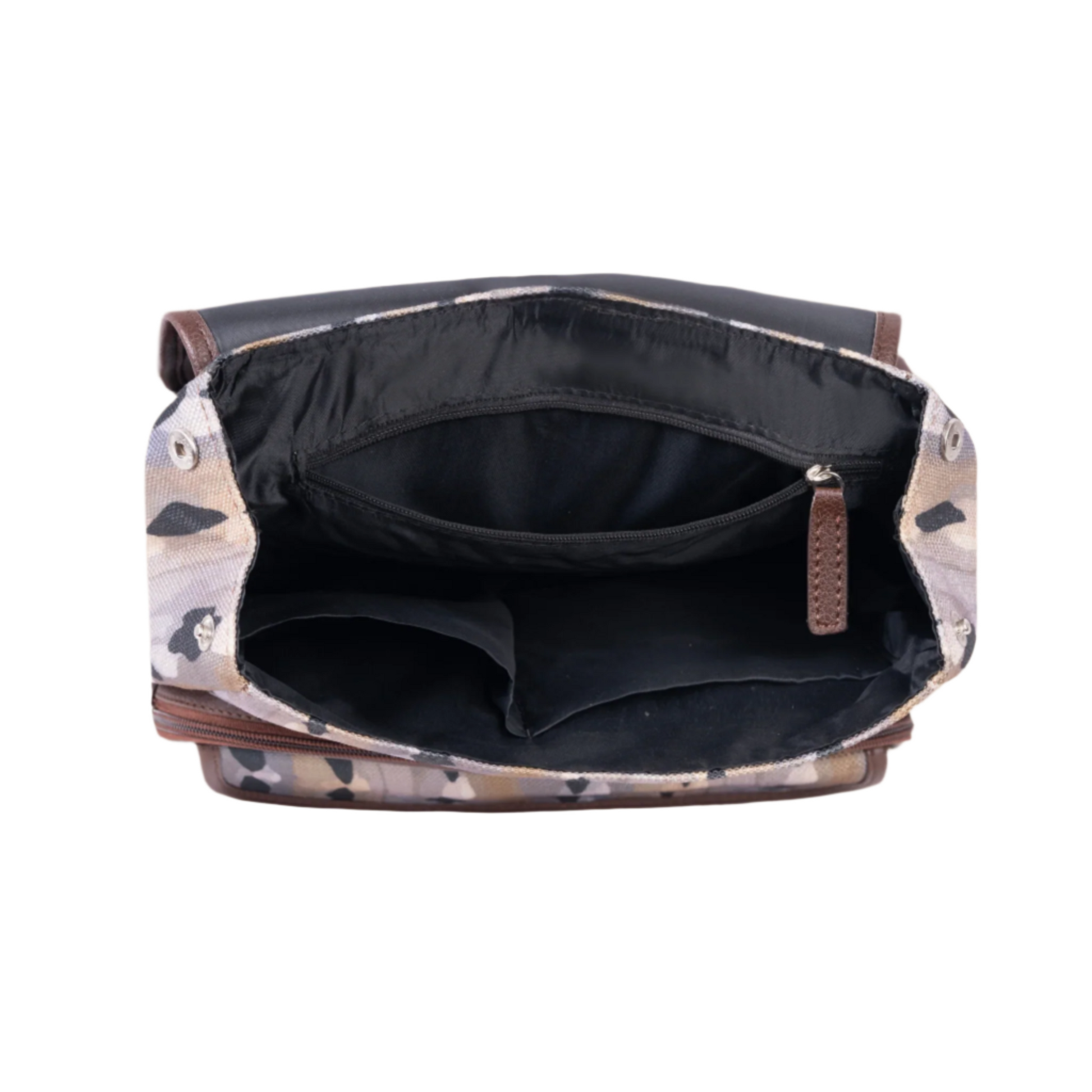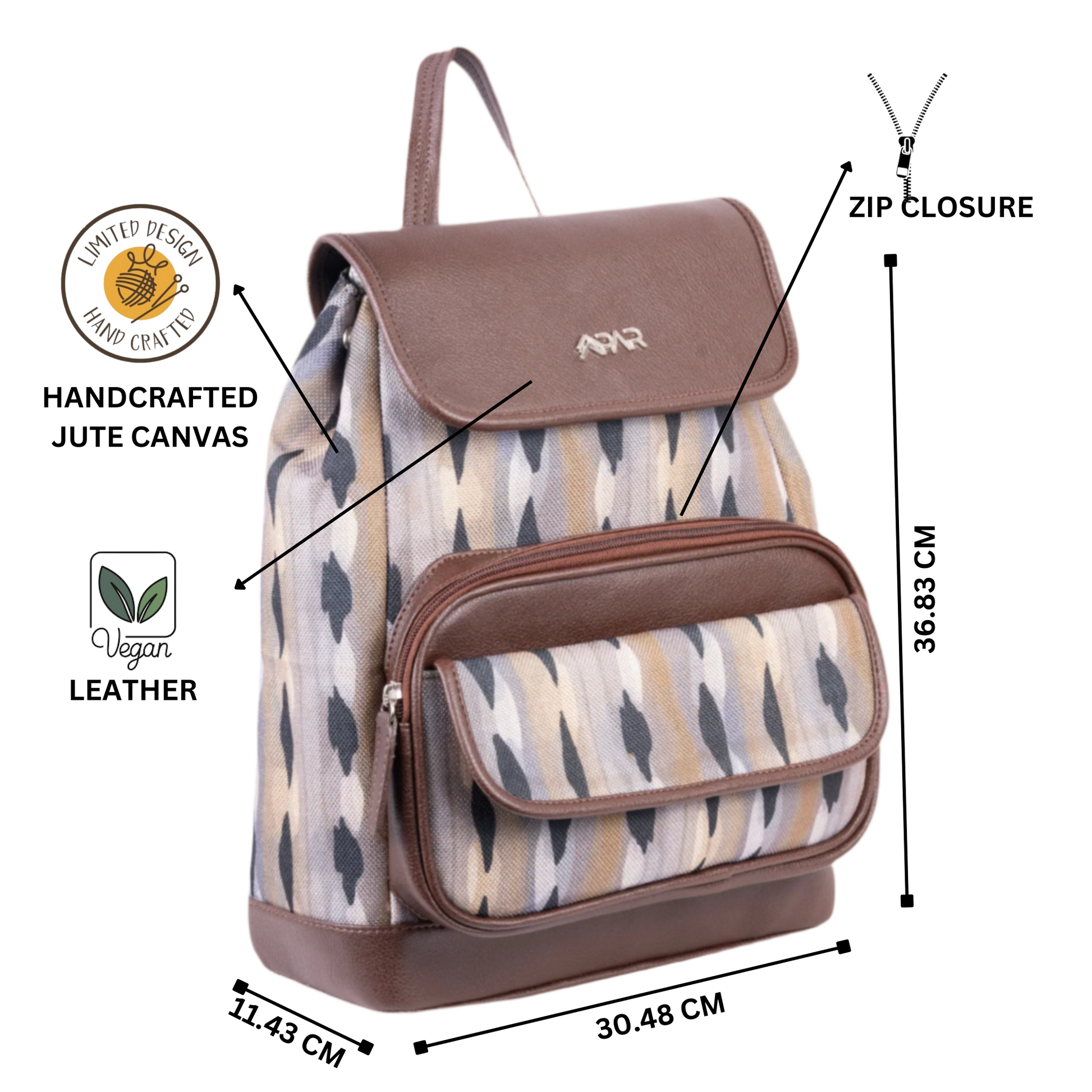 Materials: Vegan leather, handcrafted fabric, water-resistant inner lining, and premium accessories.