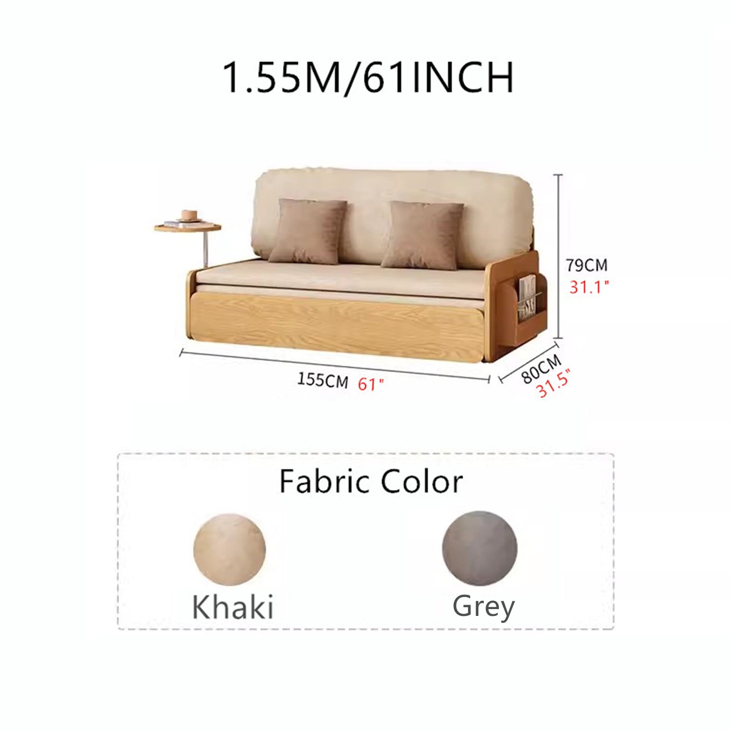 Japandi Log Style Pull Out Sofa Bed with Rotating Armrest Tray and Storage