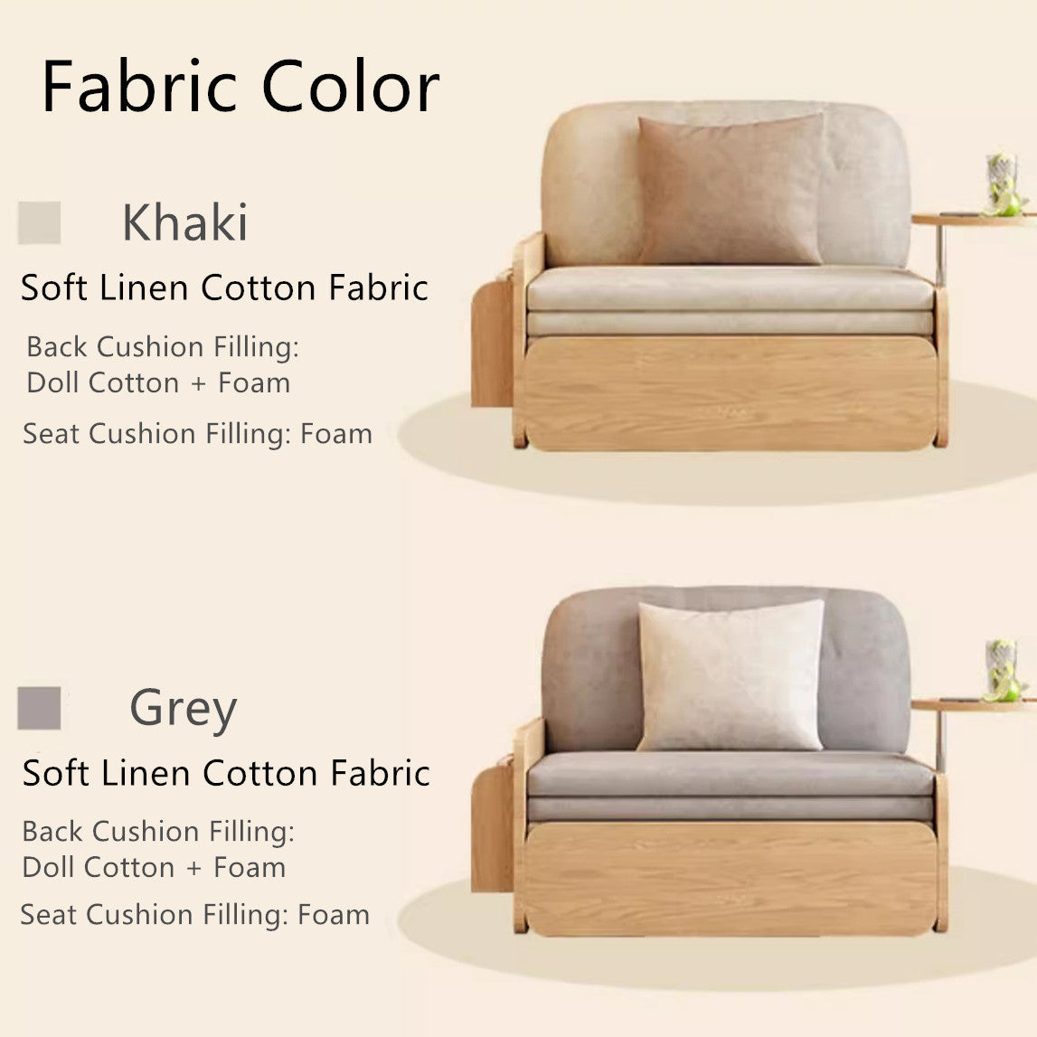 This Japandi modern log style pull-out sofa bed is available in three sizes--105 cm/125 cm/155 cm (41 inch/49 inch/61 inch)--and features a linen cotton cover filled with high-rebound sponge.