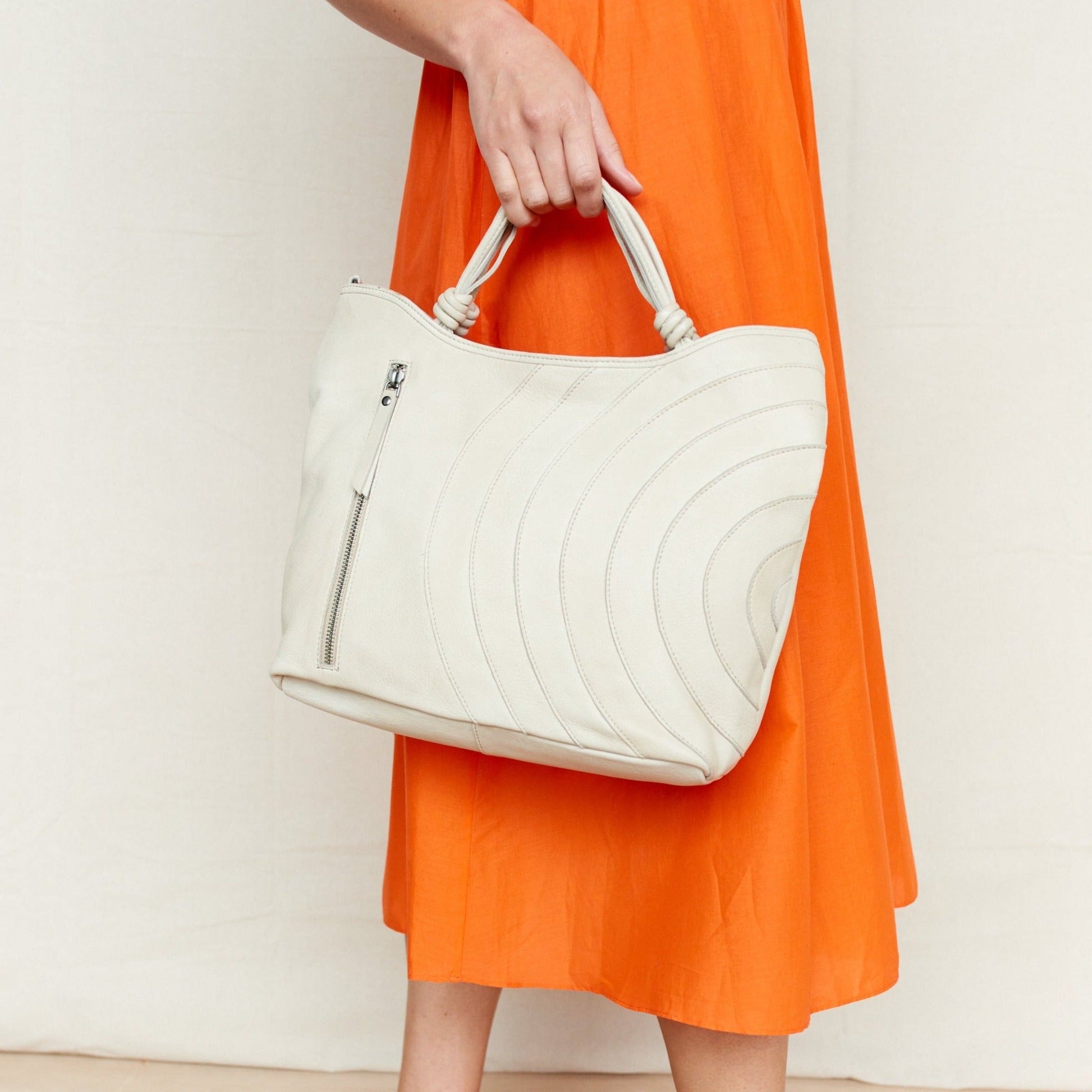 Versatile Carrying Options: Features two handcrafted knot-detail top handles with a 4.5" drop and a ¾” wide adjustable crossbody strap with a 15" to 30" drop.