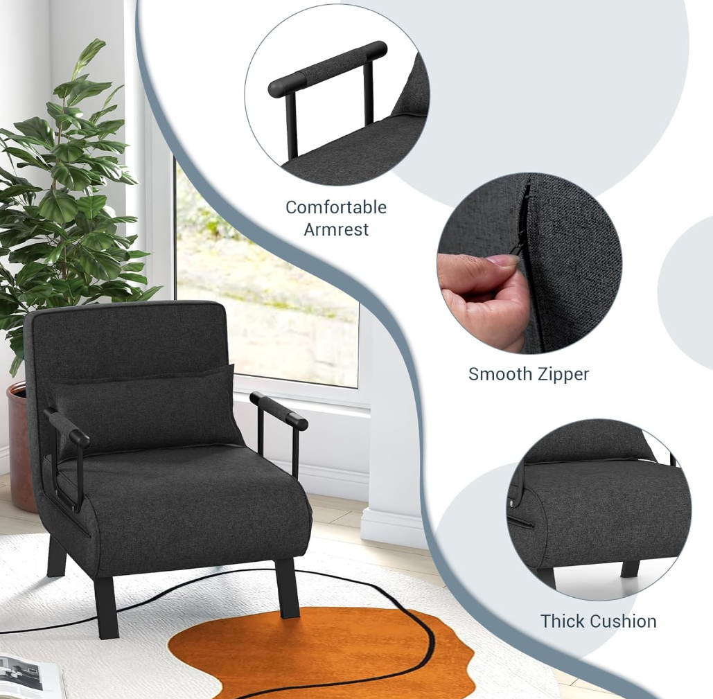 The KOMFOTT 4-in-1 Convertible Sleeper Chair Bed easily transforms into a chair, lounger, recliner, or bed, making it ideal for home or office use. It features a 6-position adjustable backrest, breathable linen upholstery, high-density foam cushioning, and a removable pillow. Its foldable design saves space while offering comfort and versatility for any room.