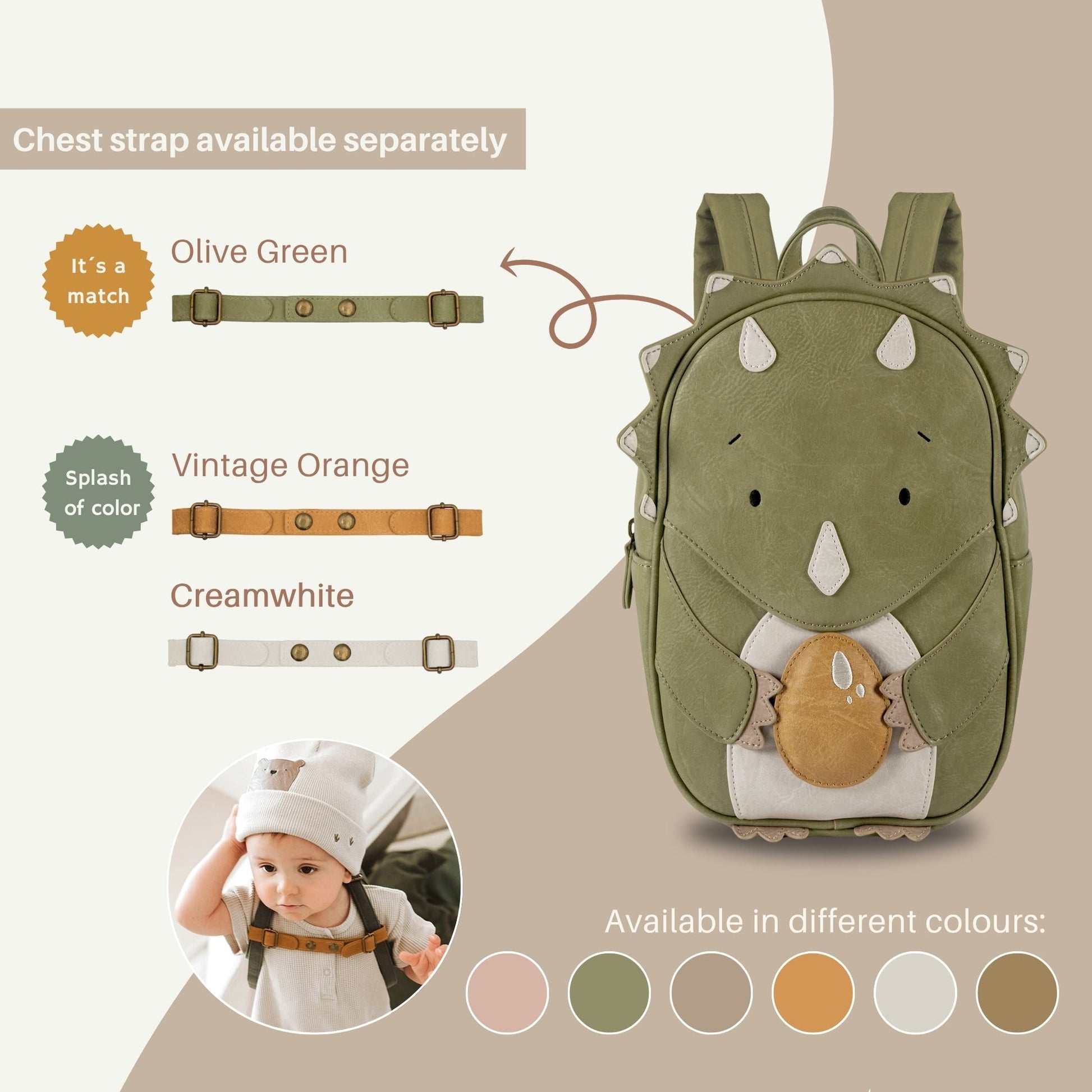 Passend zu unserem Rucksack Großer Dinosaurier Oskar empfehlen wir den Brustgurt in der Farbe Olive Grün.