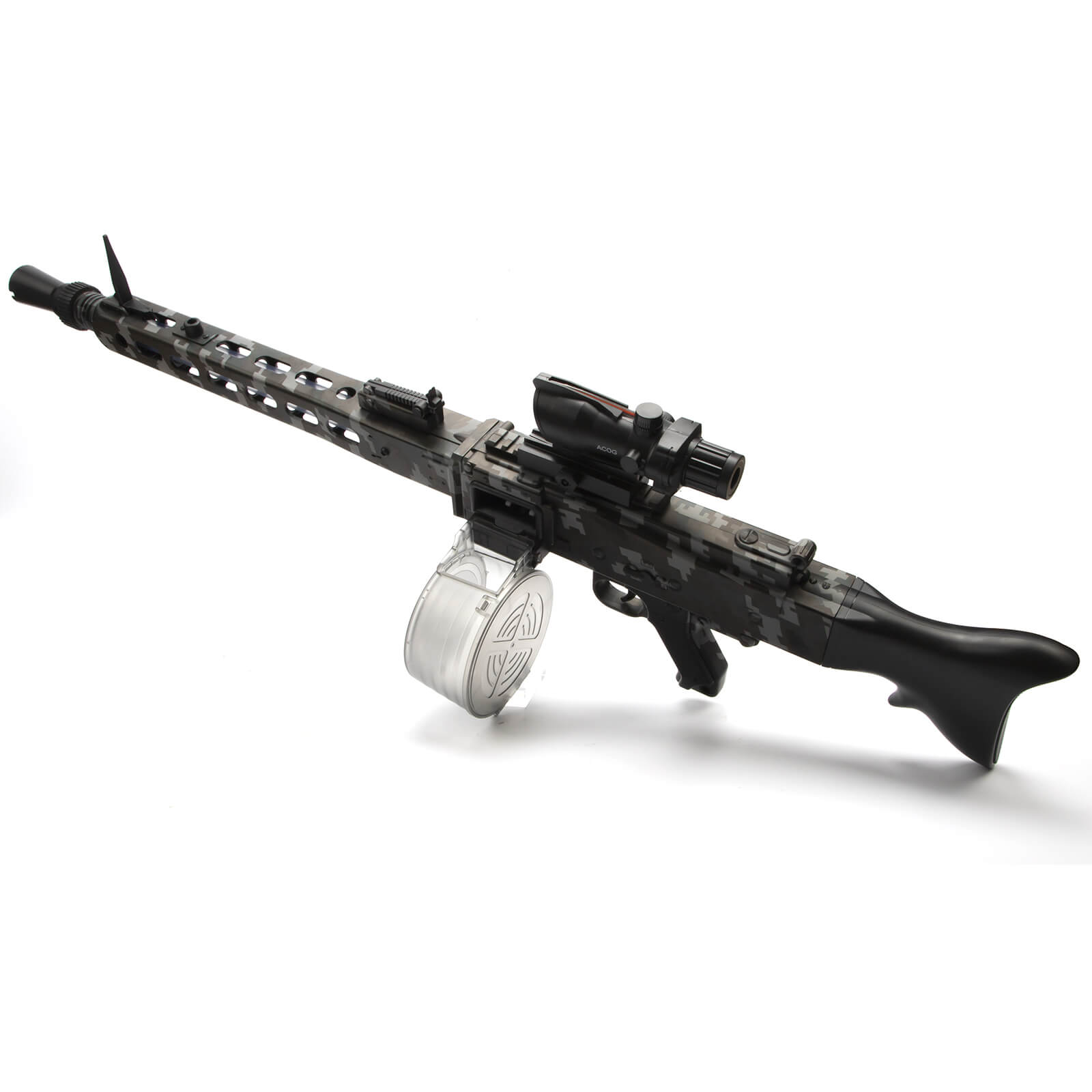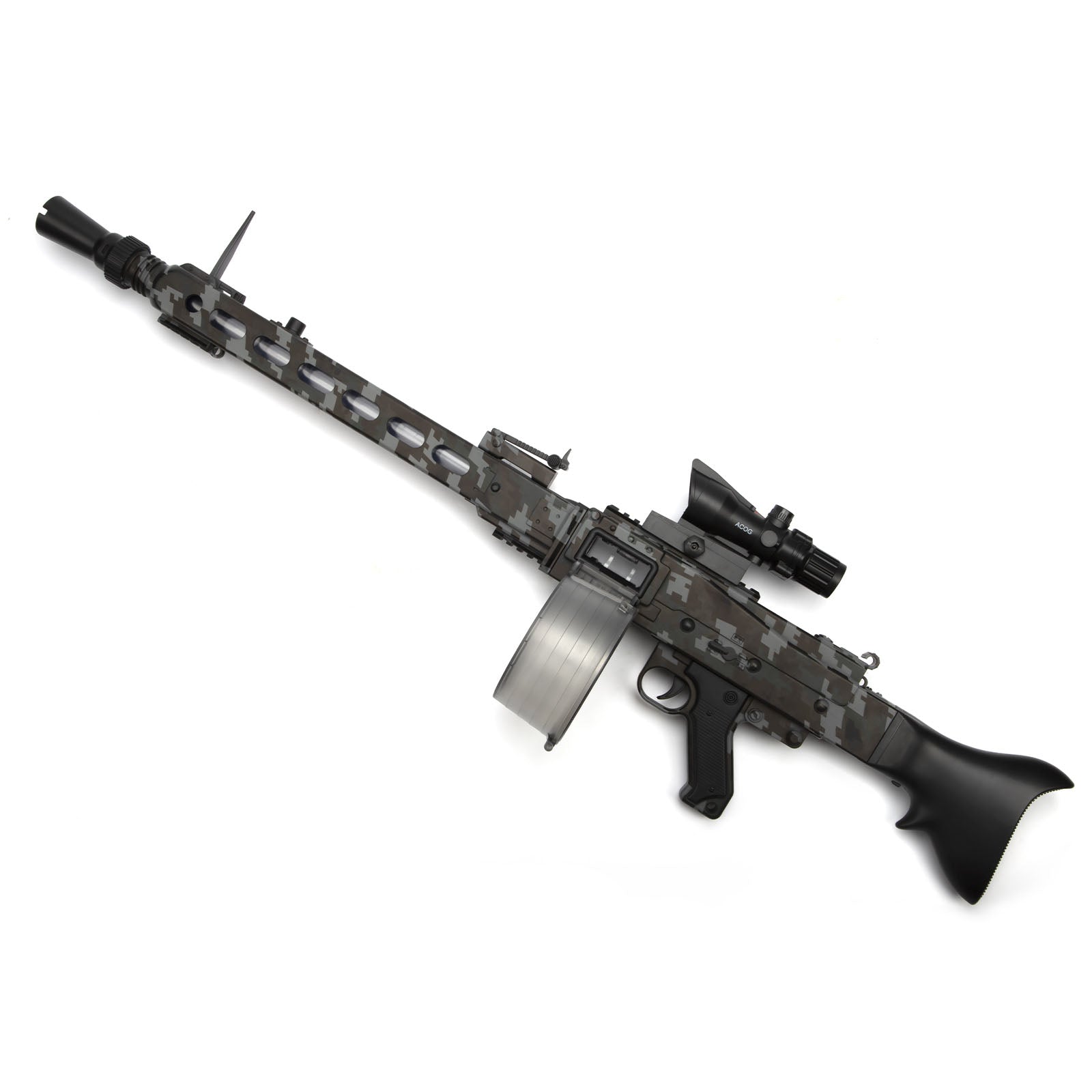 With this black camo MG3 soft bullet machine gun, you can live out all of your outdoor shooting fantasies. This mighty MG3's gun body is made of plastic and high-quality nylon, and it comes with a mosaic drum magazine. The entire gun body is covered in a black camouflage painting with outdoor field style, and it measures 97cm long after assembly.