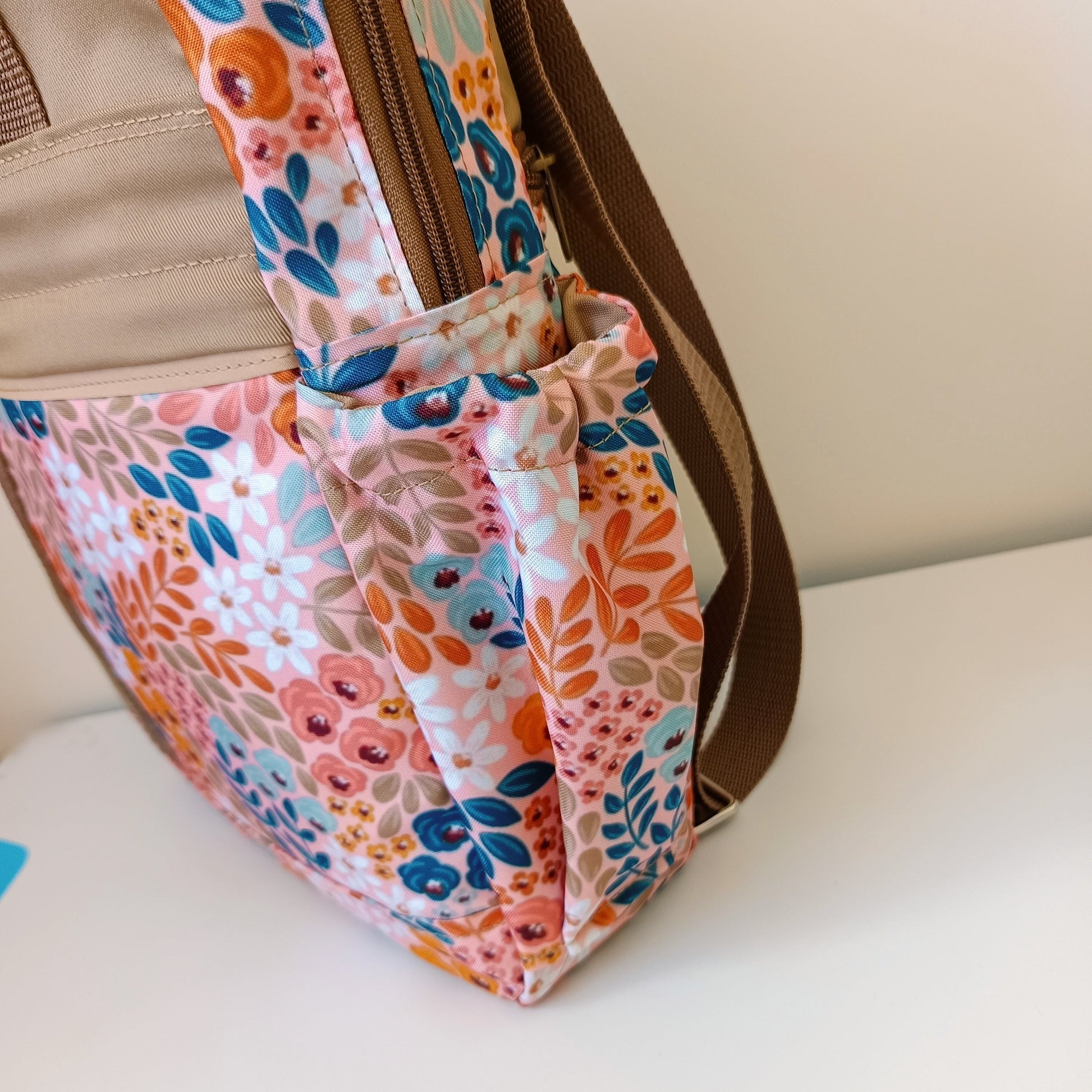 Mochila elaborada con tela impermeable. Tiene 1 bolsillo frontal , 2 bolsillos laterales con elástico y 1 bolsillo posterior con cierre. Tiene espaldar y bolsillo acolchado para notebook. Posee correas ajustables y asa para colgar.