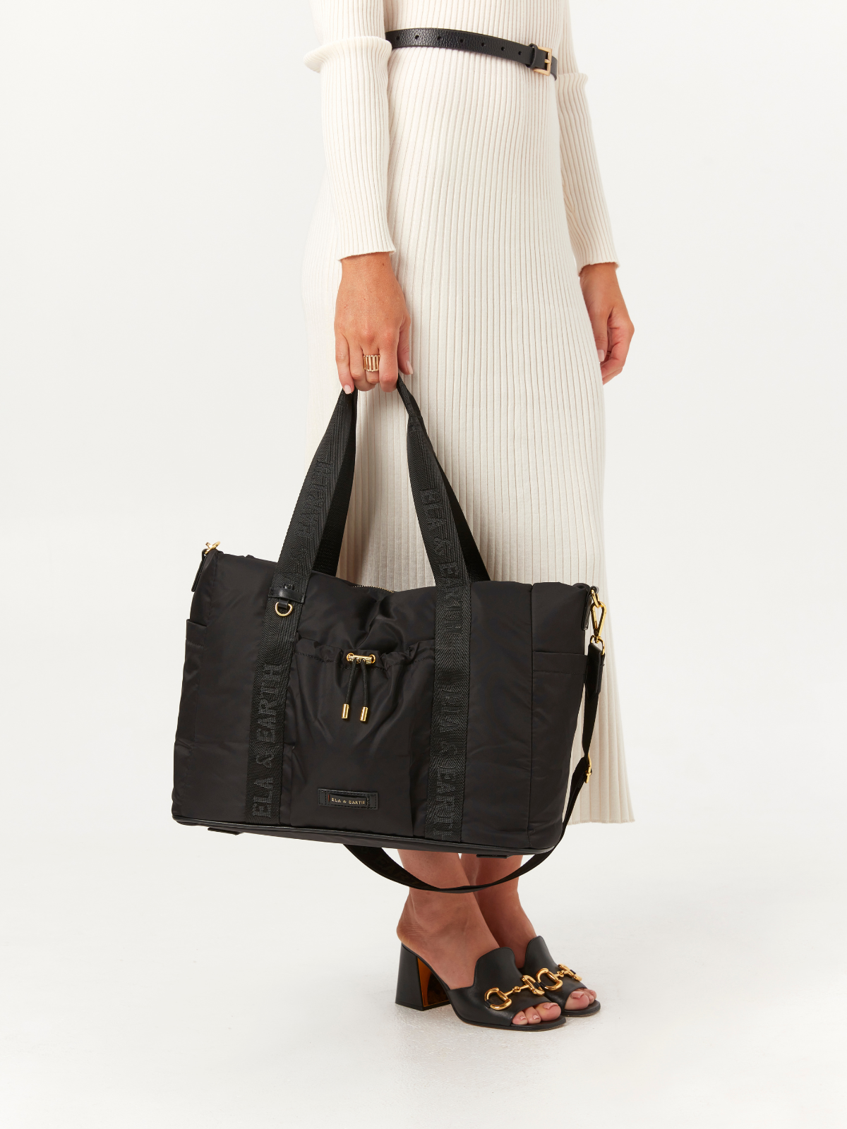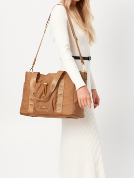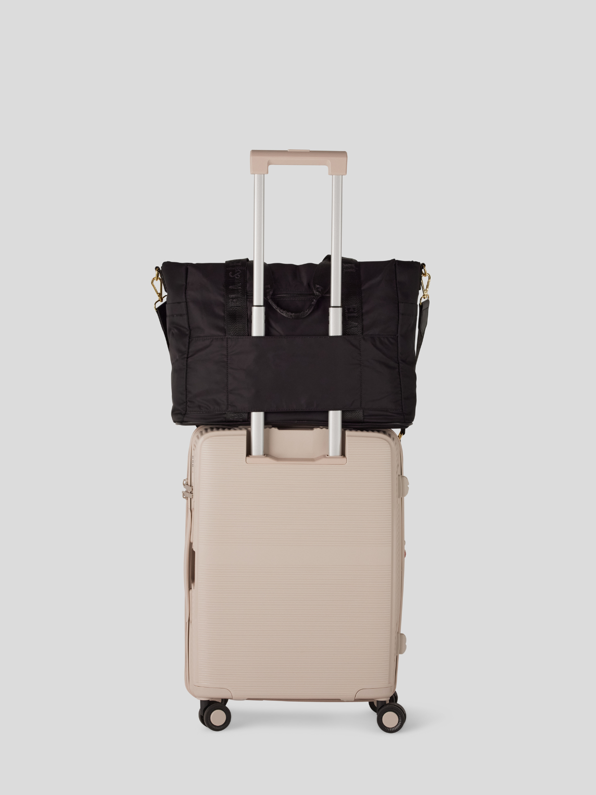 Combines a stylish tote with practical features for work, travel, and daily use — including a laptop sleeve, insulated compartment, and luggage sleeve.