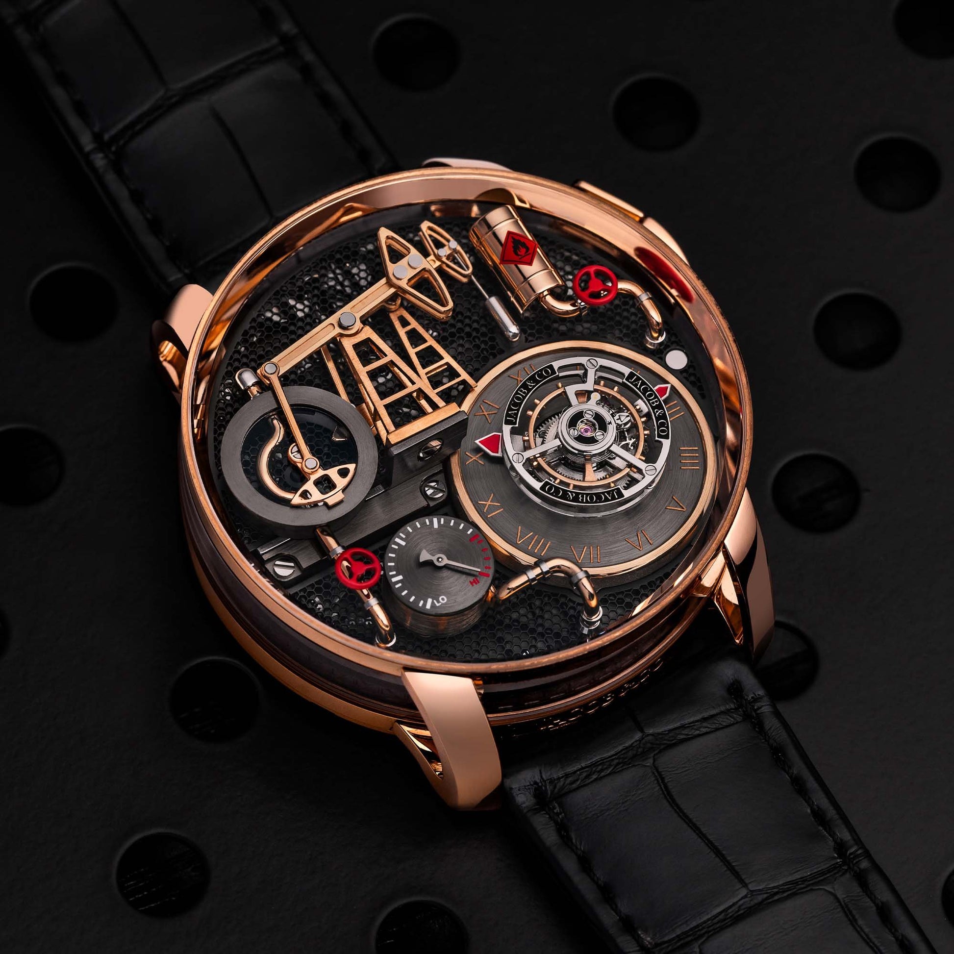The Jacob & Co. Oil Pump Rose Gold is a bold luxury timepiece featuring a mechanical twin oil derrick automaton, flying tourbillon, and intricate movement. Crafted in 18K rose gold, it's a striking fusion of industrial art and haute horlogerie.