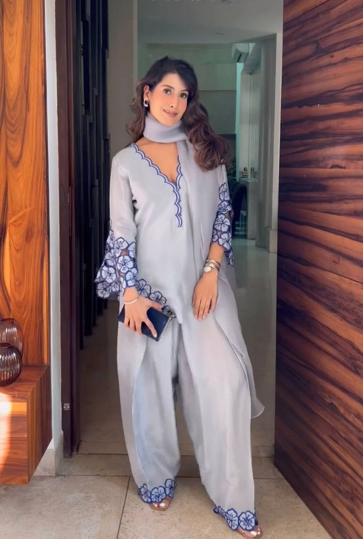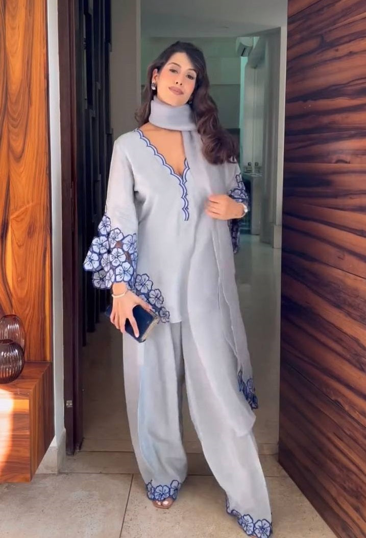 Elegant fully-stitched natural crepe suit set with embroidery and cutwork, fancy belly sleeves, farshi plazzo, and soft organza silk dupatta.- No of Pieces : 3