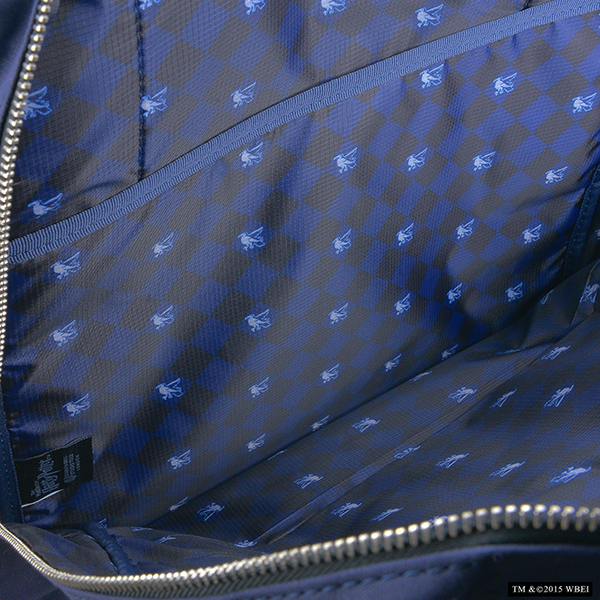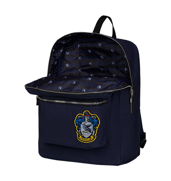 It features the word ‘Ravenclaw’ on the embroidered crest, with a silver zip and has a house checkerboard pattern on the inside lining of the backpack. The bag has additional features including a zipper pocket, handle, and adjustable padded straps for suitable and comfortable wear for everyday use. Measures 43x40 cm.