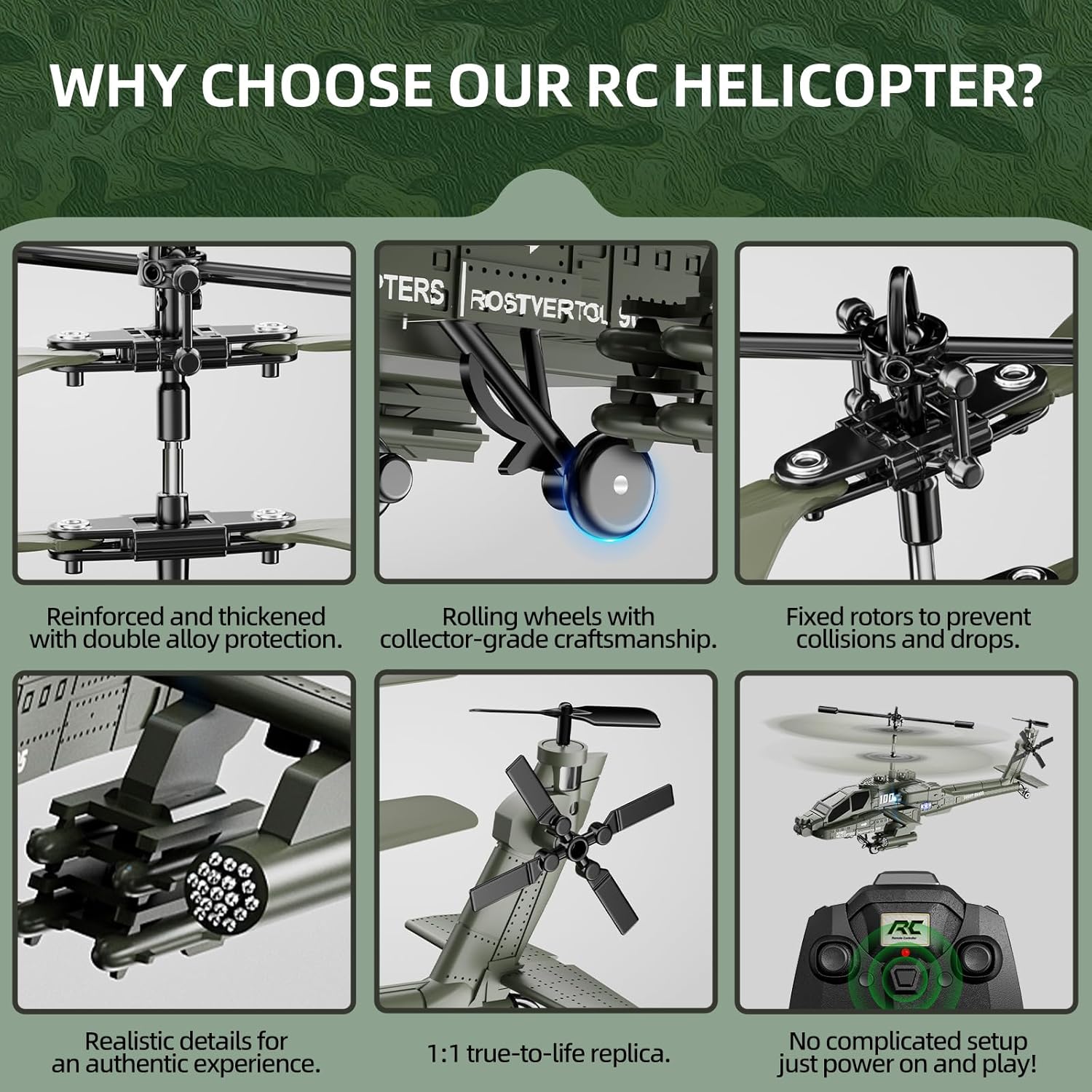 This remote-controlled combat helicopter is inspired by real military helicopters and features intricate details and high-quality craftsmanship. Powered by twin coreless motors, it provides powerful propulsion and responsive maneuverability.