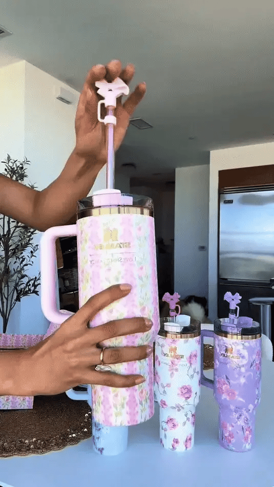 Bring our forever florals with you wherever you go with the 40-ounce Quencher H2.0 Tumbler. Your drink stays cold for hours, thanks to double-wall vacuum insulation. The versatile lid rotates to three positions: a straw opening, one for sipping and a full-cover top. An ergonomic handle makes it easy to carry, and it fits in most cup holders, too. Just for you, we’re adding a sweet straw topper with our signature bow (because everything’s better with a bow).