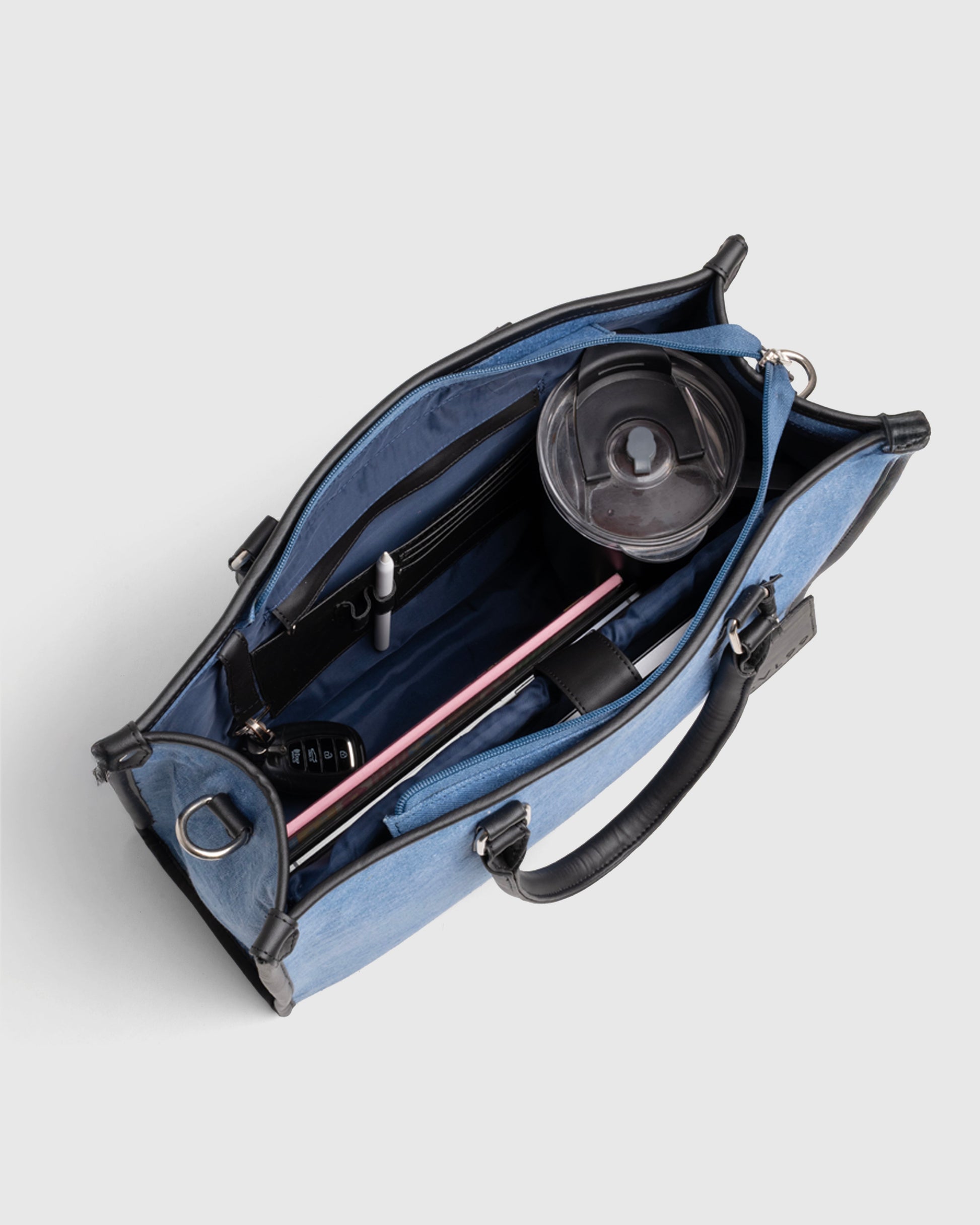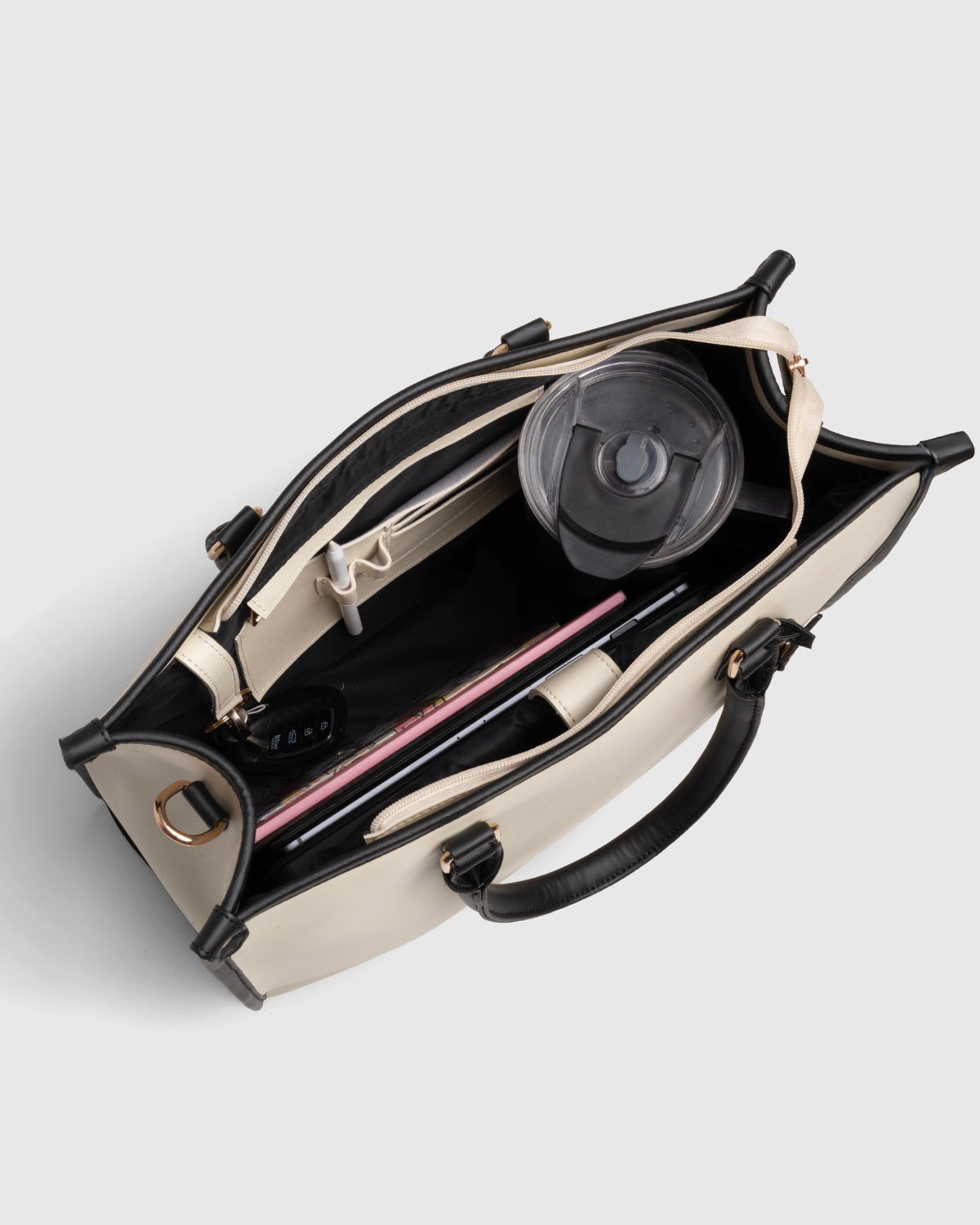 Whether you're heading into a big meeting or just doing your everyday hustle, this work tote is designed to carry it all without looking like it. Clean on the outside, organised on the inside, it’s made to move with you. The structured silhouette keeps it polished, while the soft interior gives you all the room and compartments you need. You’ll find a key holder, card slot, zip compartment, cushioned laptop section, pen holder and more.It comfortably fits your 17-inch laptop, notebook, sipper, and other daily essentials and it comes with a detachable strap so you can throw it on crossbody when you're on the go.