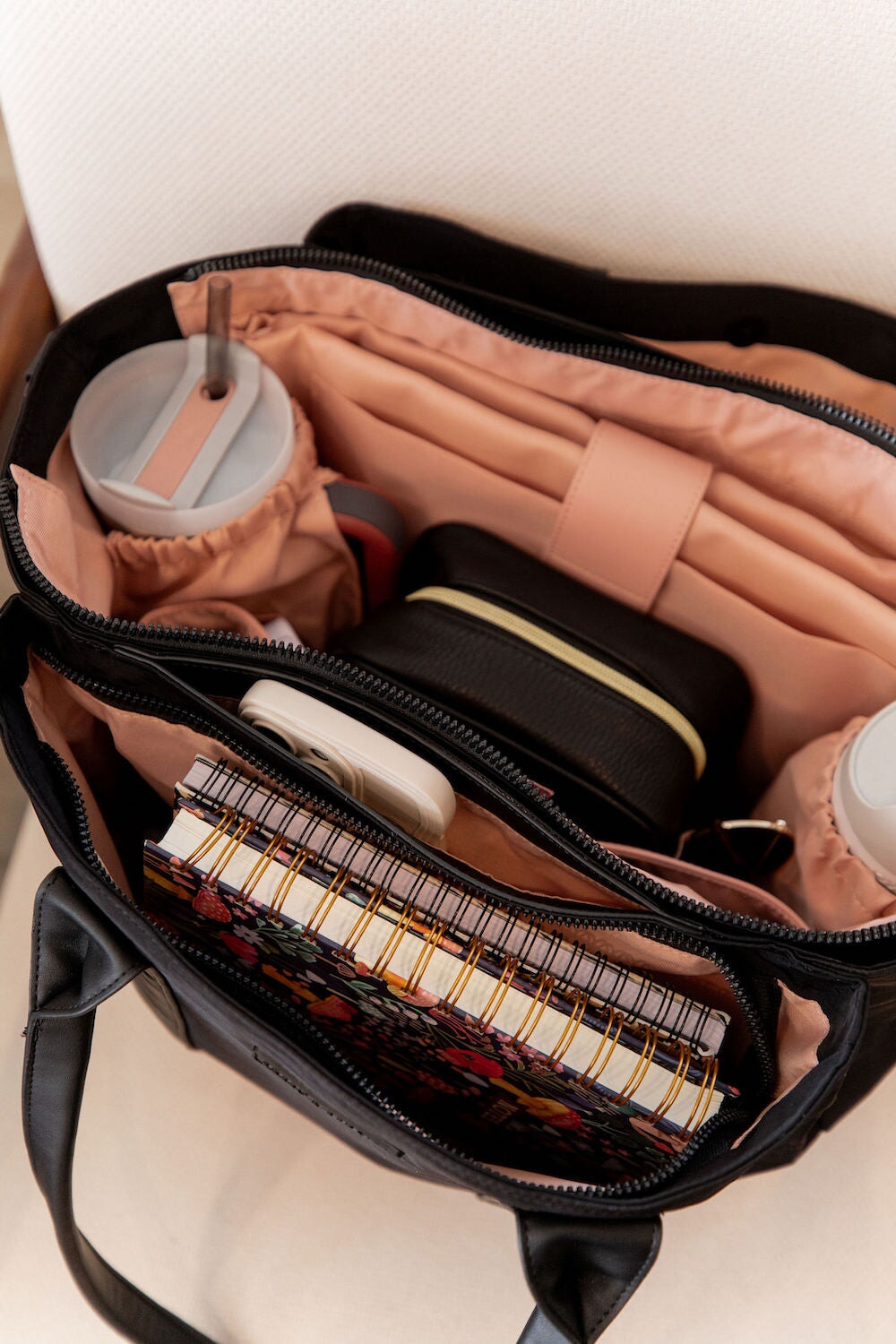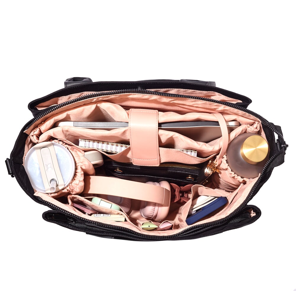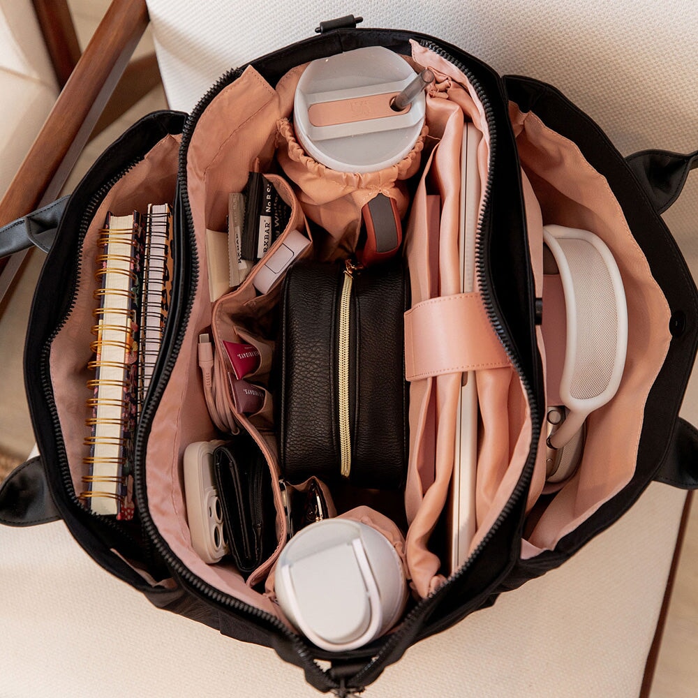 Sleek black design that’s both fashion-forward and practical, with thoughtful storage for makeup, tech, and more.