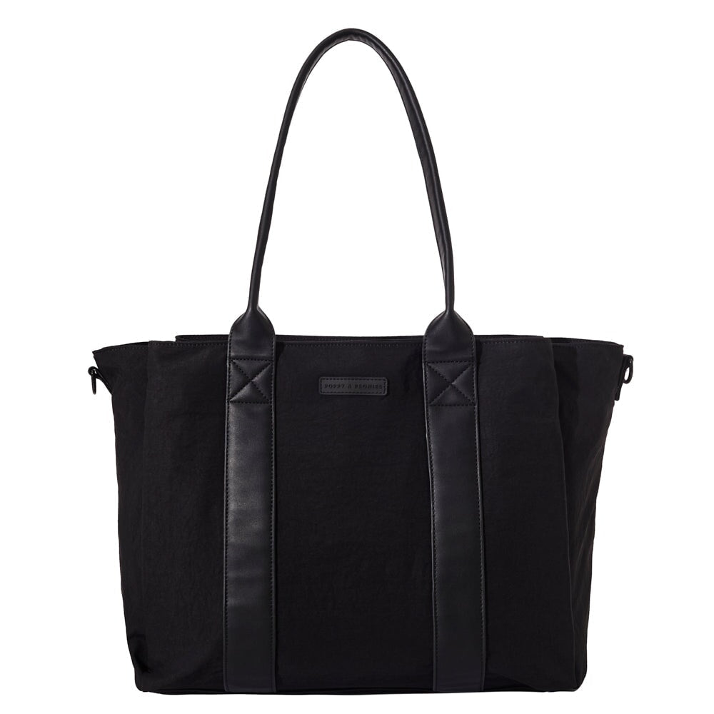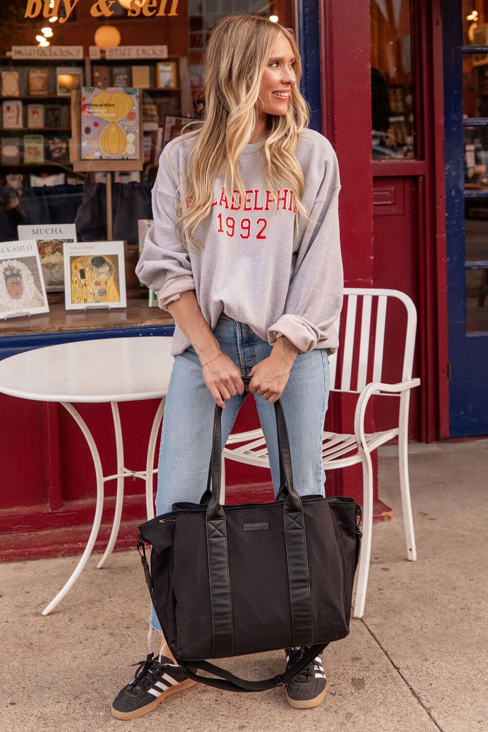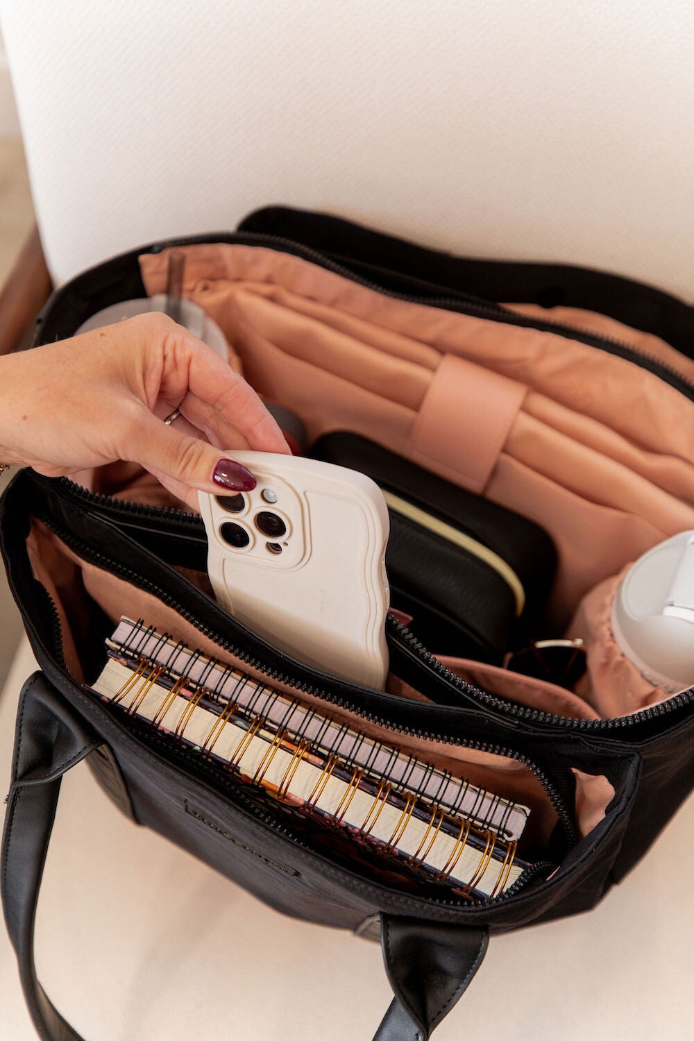 Sleek black design that’s both fashion-forward and practical, with thoughtful storage for makeup, tech, and more.
