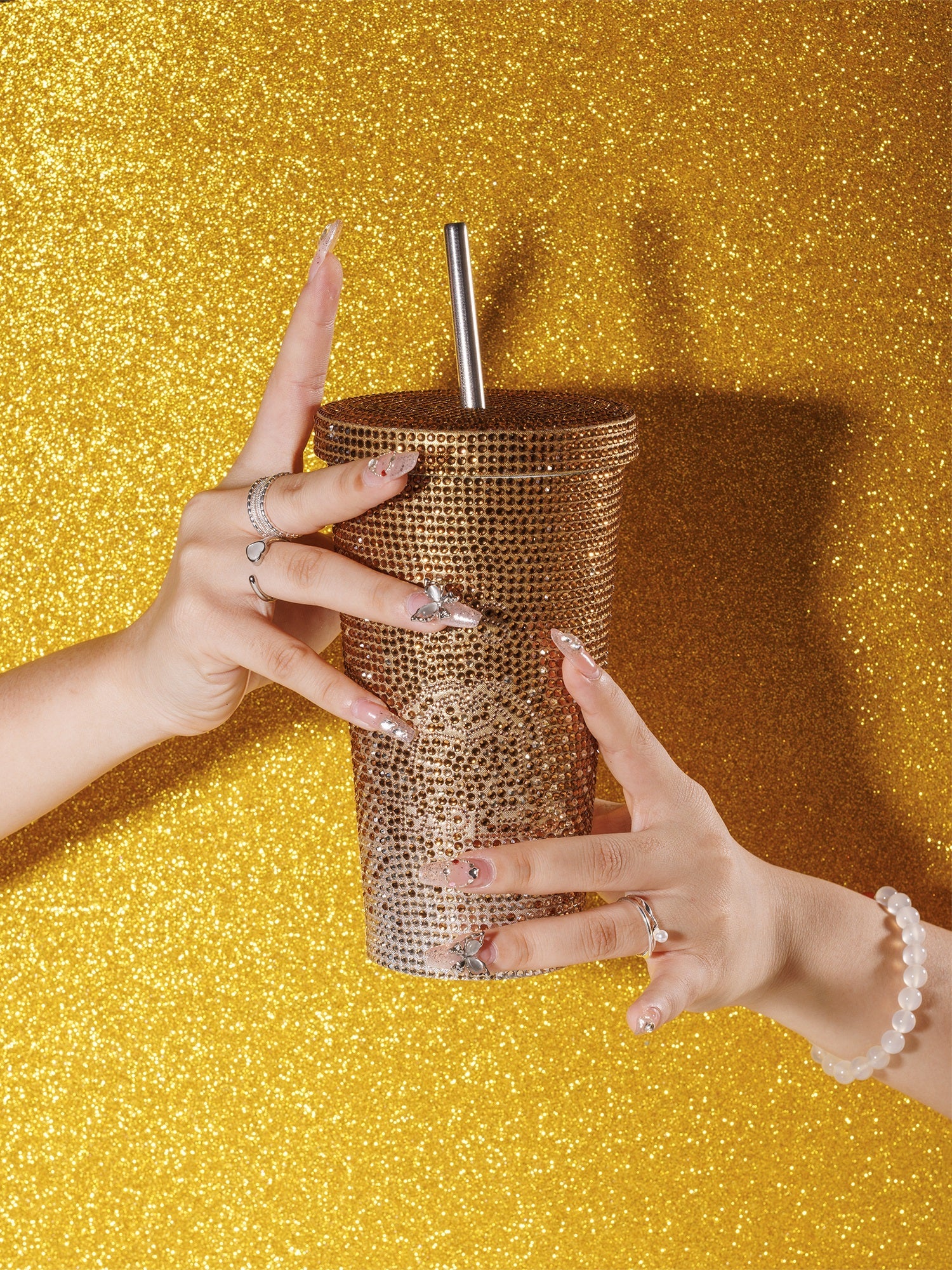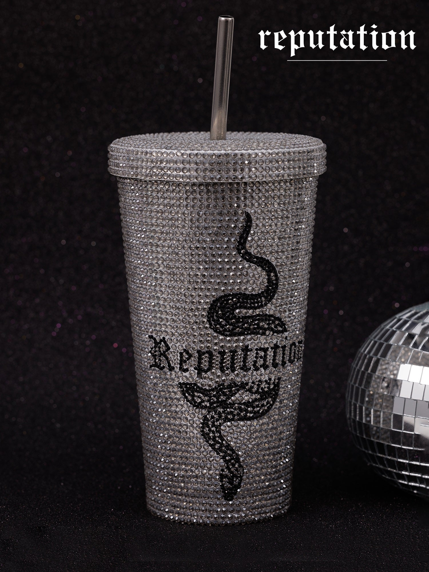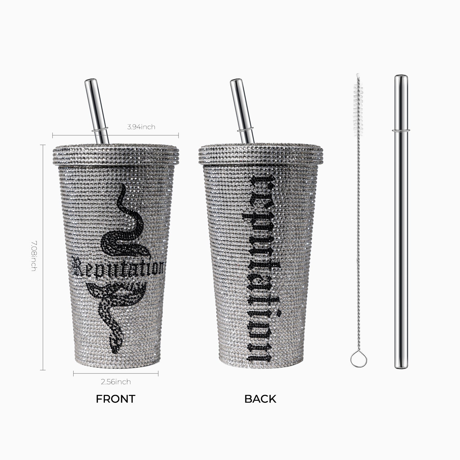 This 16oz tumbler adorned in bling, draws inspiration from Taylor Swift’s Reputation/1989/TTPD/Fearless/Lover/Midnight Edition album! It's meticulously crafted with small rhinestones that cover the entire surface, making it a dazzling accessory for any fan.