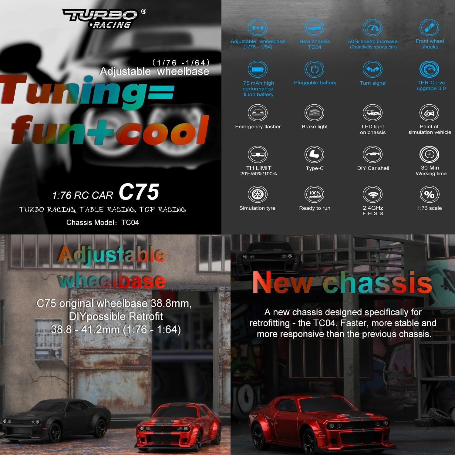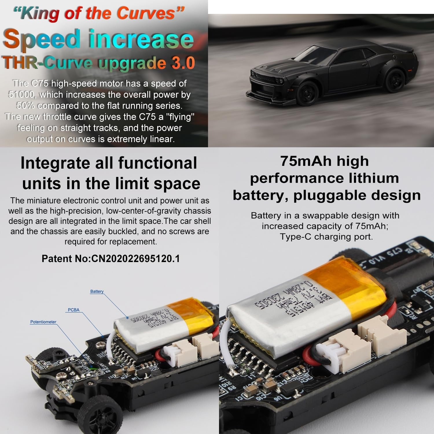 - A new chassis designed specifically for retrofitting - the TC04. Faster, more stable and more responsive than the previous chassis. Speed increase THR-CUrVE upgrade 3.0 The C75 high-speed motor has a speed of 51000,which increases the overall power by 50% compared to the flat running series. The new throttle curve gives the C75 a "flying' feeling on straight tracks, and the power output on curves is extremely linear.