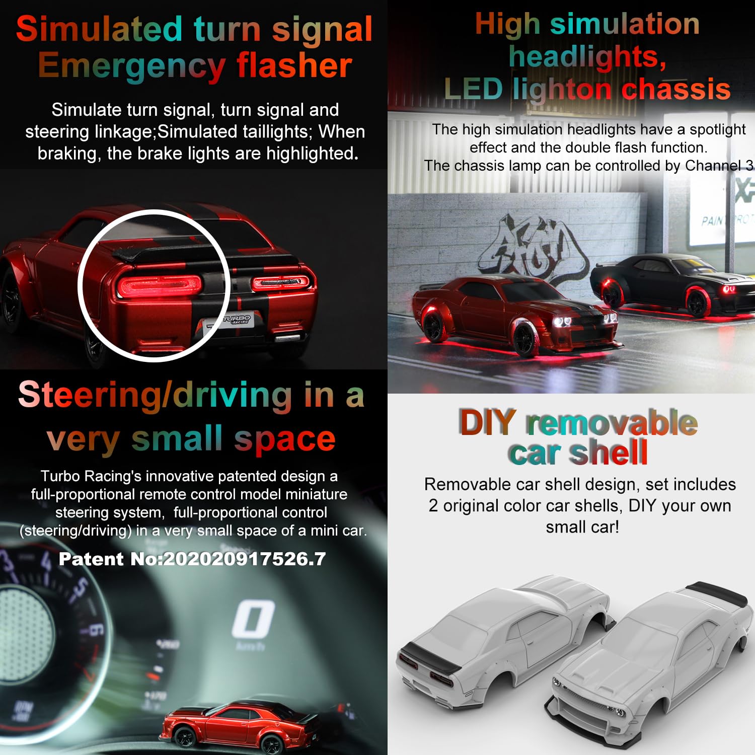- DIY removable car shell Removable car shell design, set includes 2 original color car shells, DIY your own small car! Integrate all functional units in the limit space The miniature electronic control unit and power unit as well as the high-precision, low-center-of-gravity chassis design are all integrated in the limit space. The car shell and the chassis are easily buckled, and no screws are required for replacement.