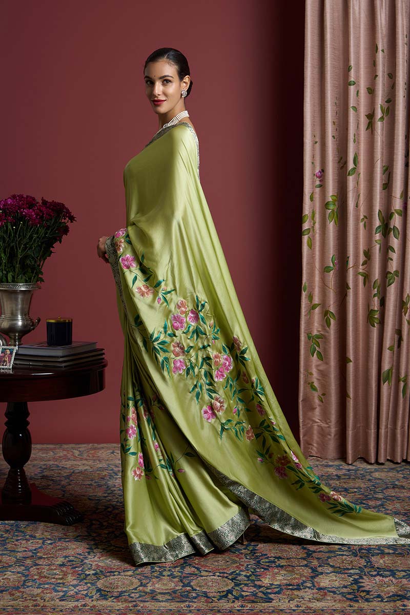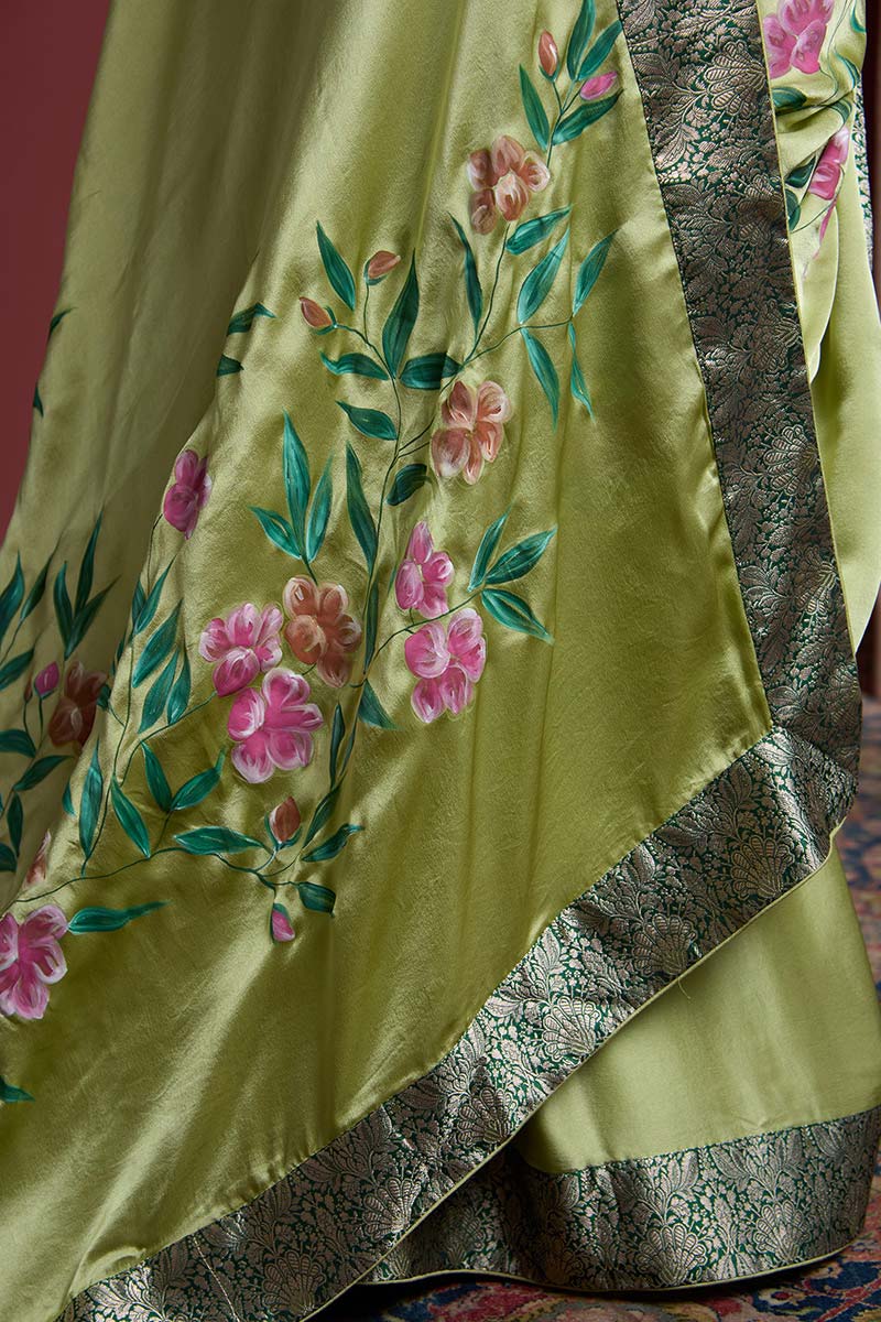 Experience the Unnati saree, featuring light green satin crepe with a vibrant, multicolored hand-painted floral theme and complemented by a green brocade border. This saree combines craftsmanship with artistic flair, making it a choice for any occasion. This saree comes with an unstitched blouse.