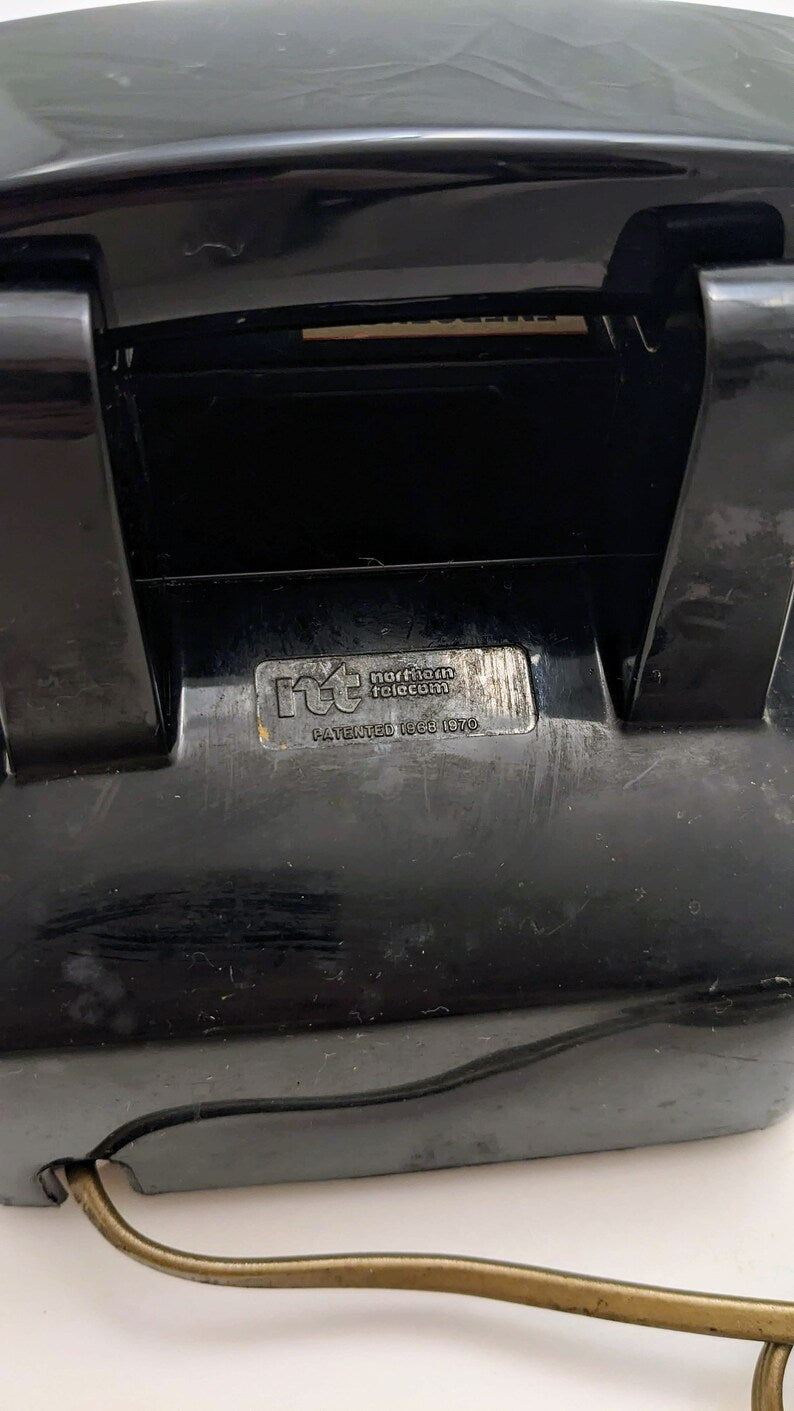 The Vintage Northern Telecom Bell Canada Rotary Phone is a classic black rotary dial telephone featuring a sturdy design and authentic retro charm. With its iconic gold dial and durable construction, this collectible piece brings nostalgic style and timeless functionality, perfect for vintage enthusiasts or as a unique decor item in any home or office.